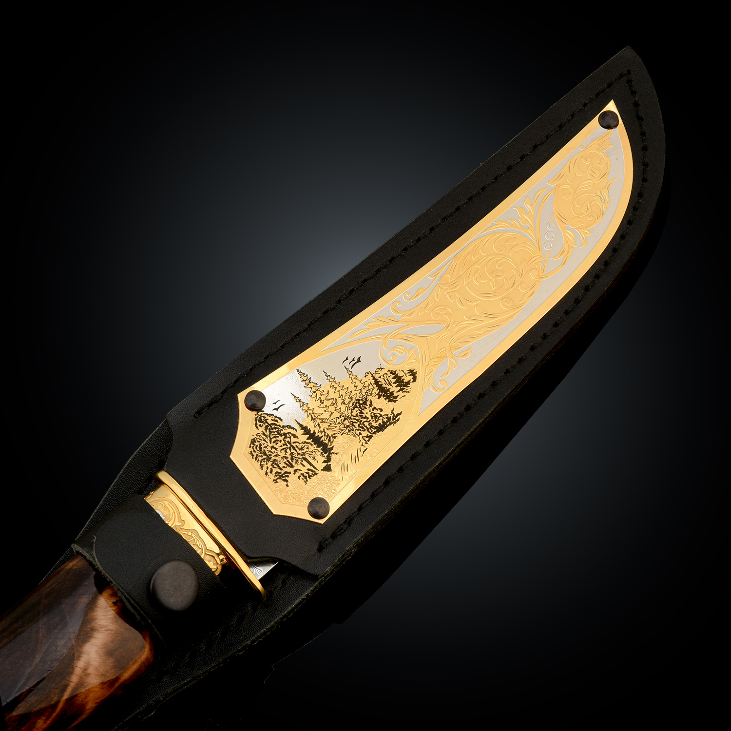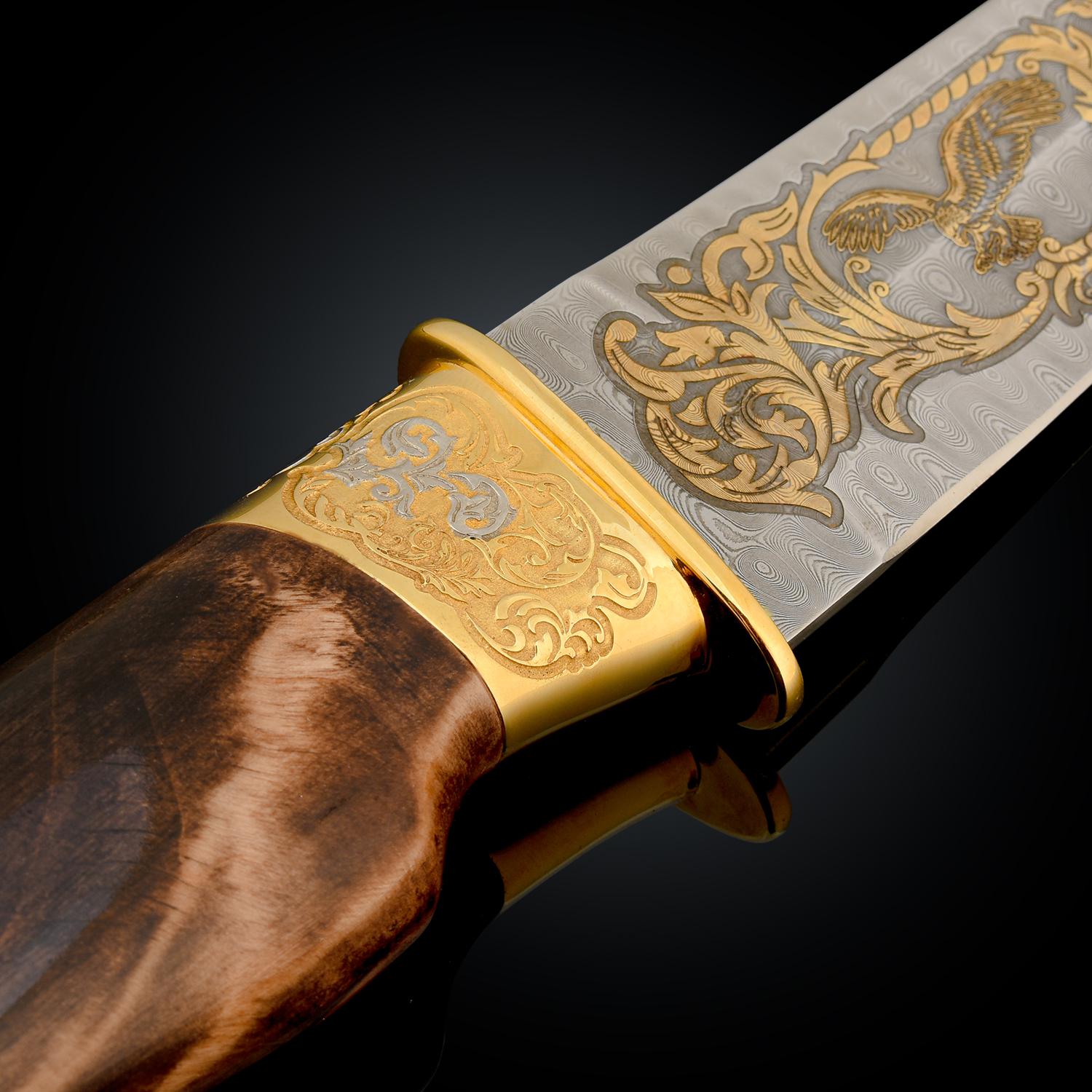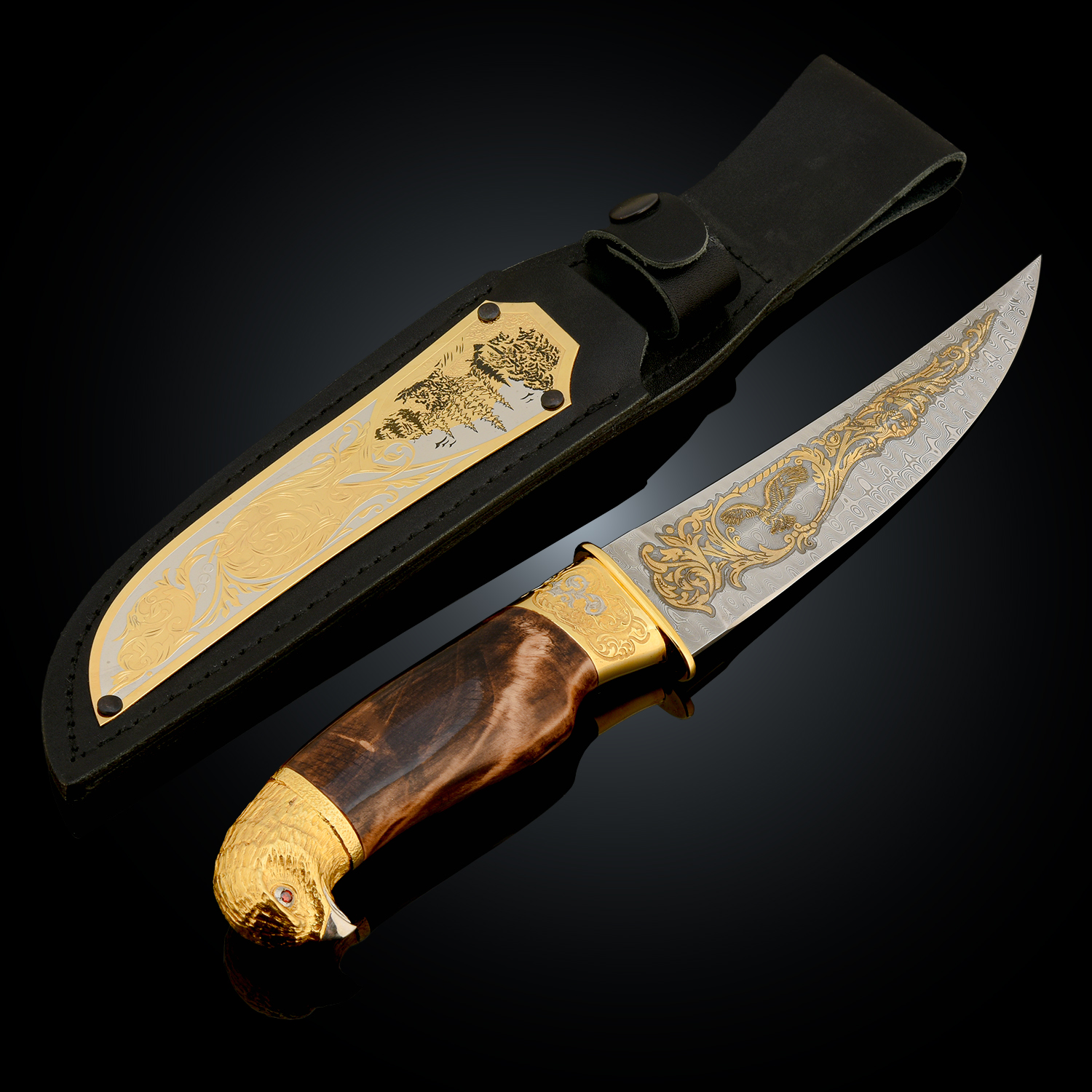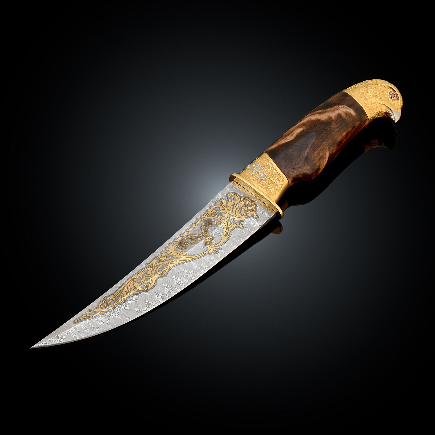 Нож сувенирный "Сокол". Златоуст.Материалы: дамасская сталь, латунь, никель, золото 999,9*, эмаль, дерево, кожа.