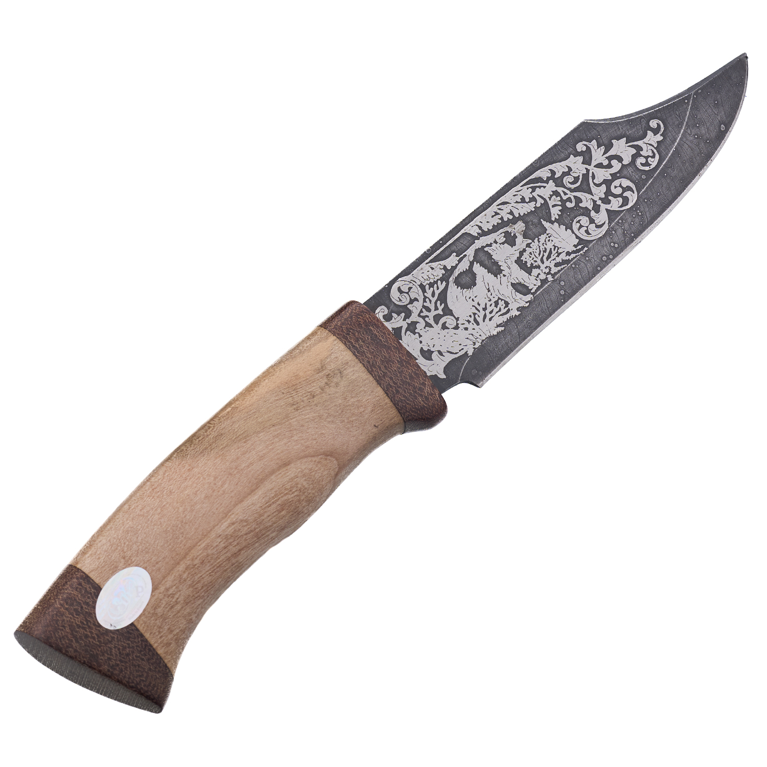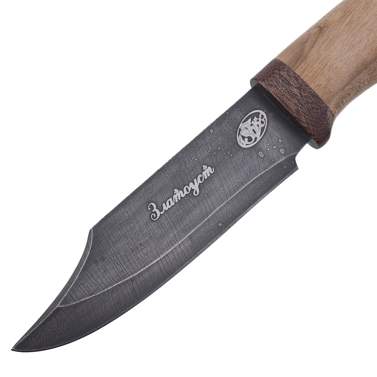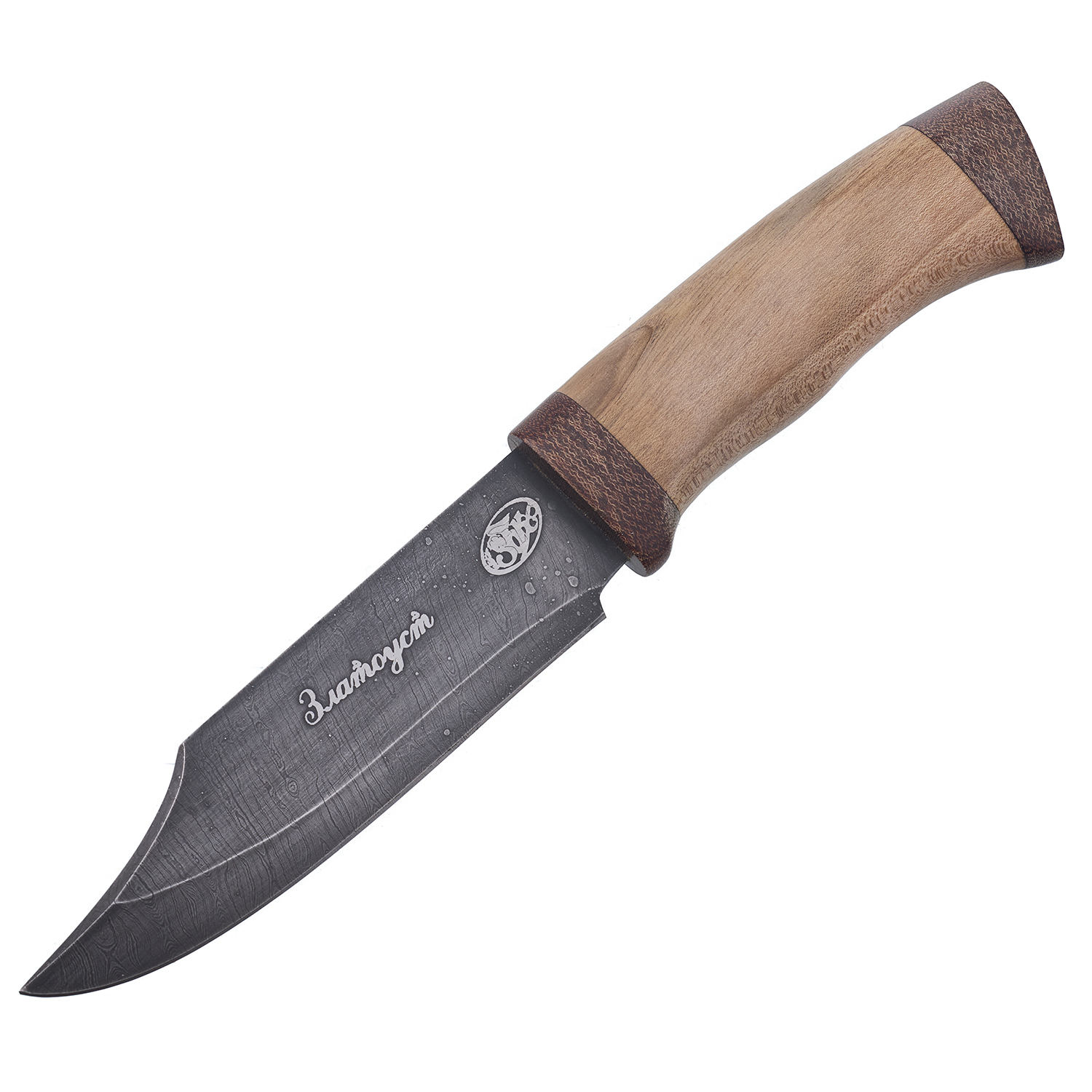 Нож сувенирный из дамасской стали "Медведь". ЗлатоустюМатериалы: дамасская сталь, дерево, текстолит, кожа.
