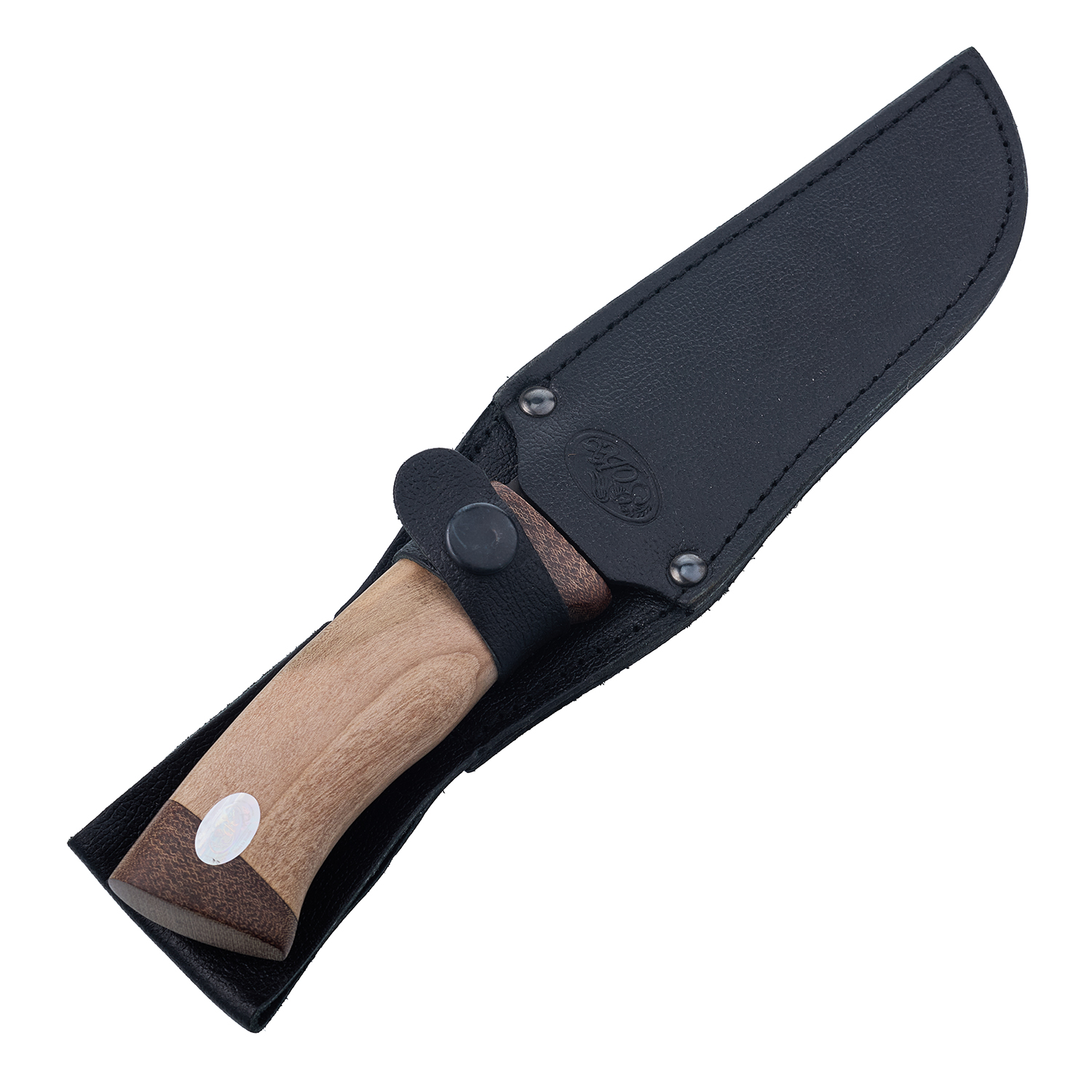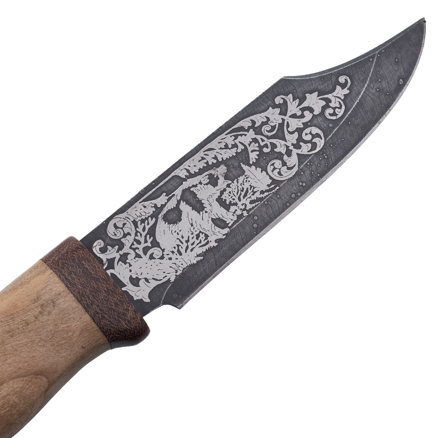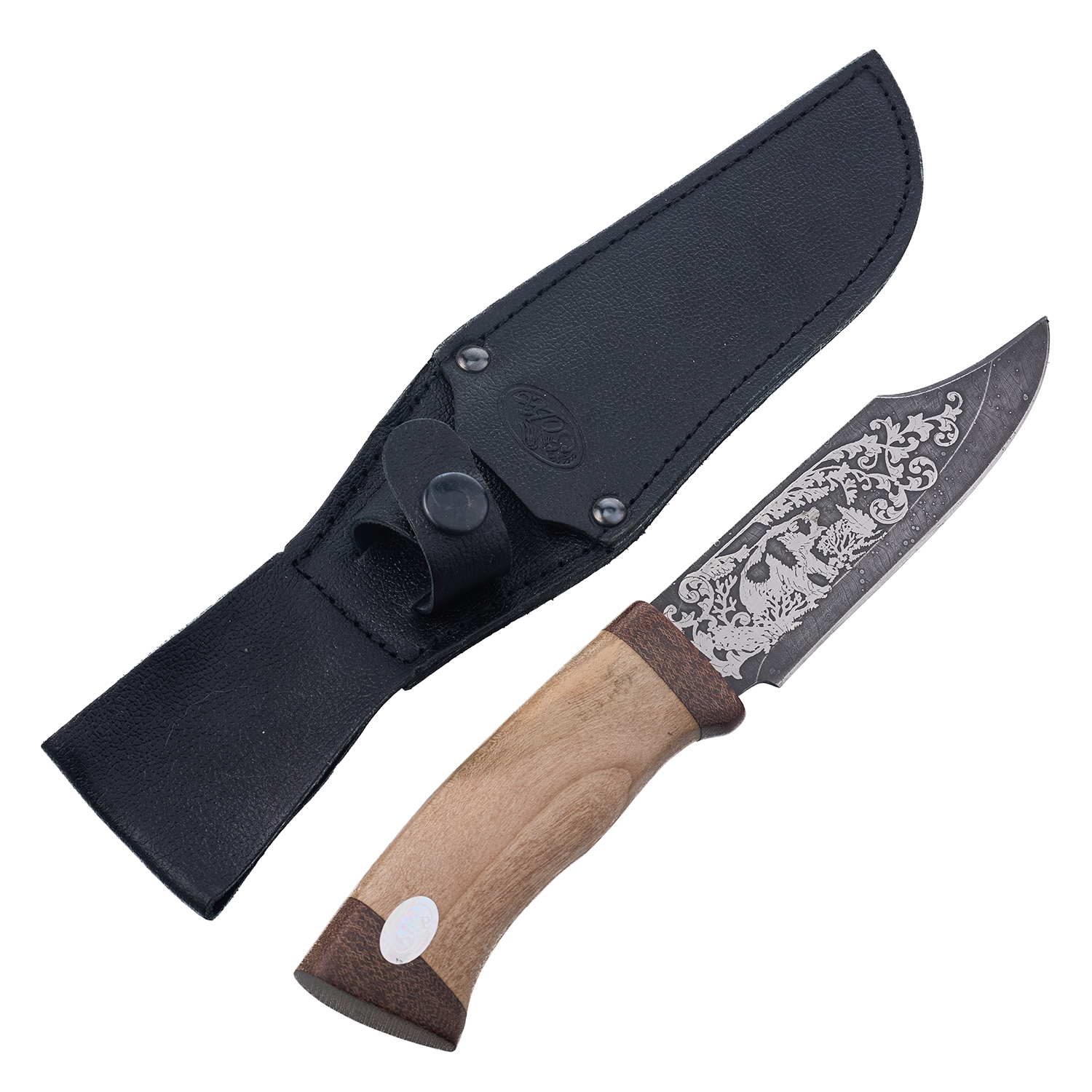 Нож сувенирный из дамасской стали "Медведь". ЗлатоустюМатериалы: дамасская сталь, дерево, текстолит, кожа.