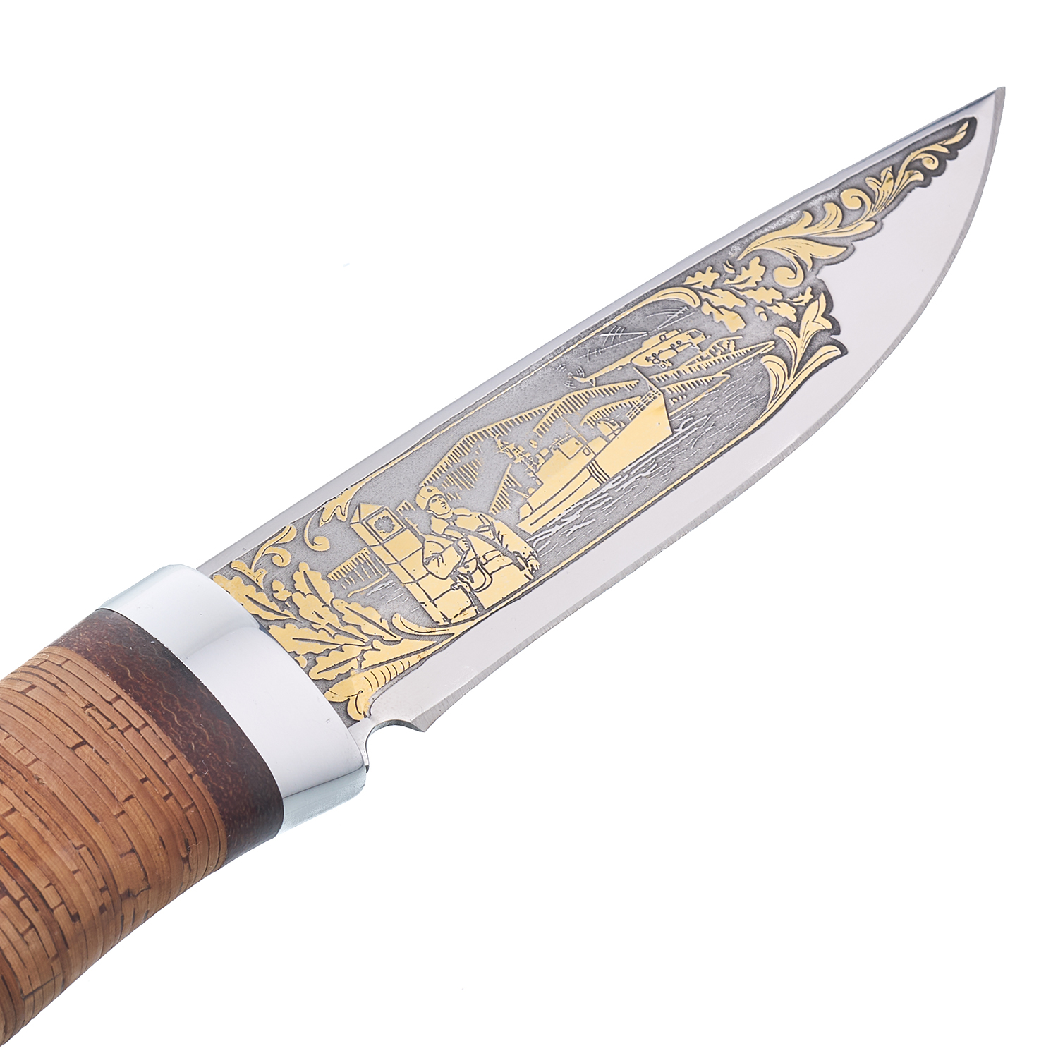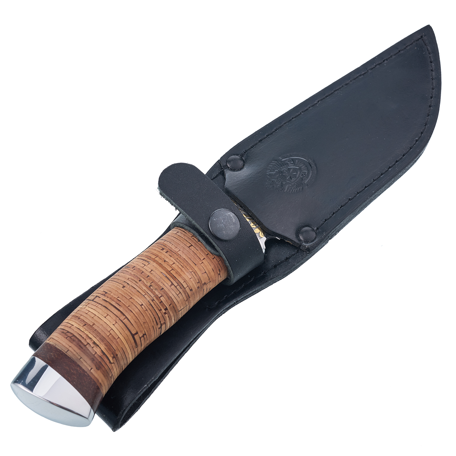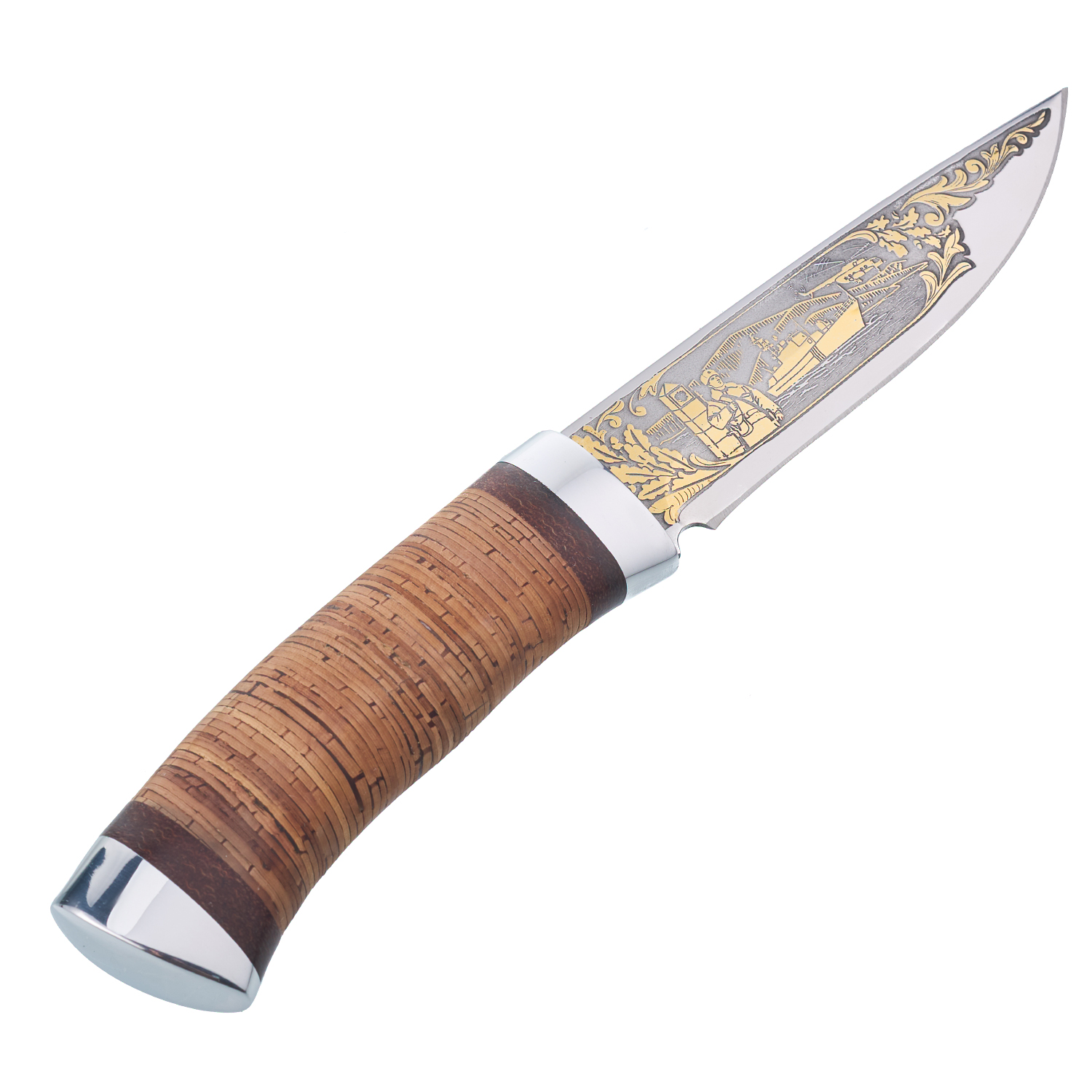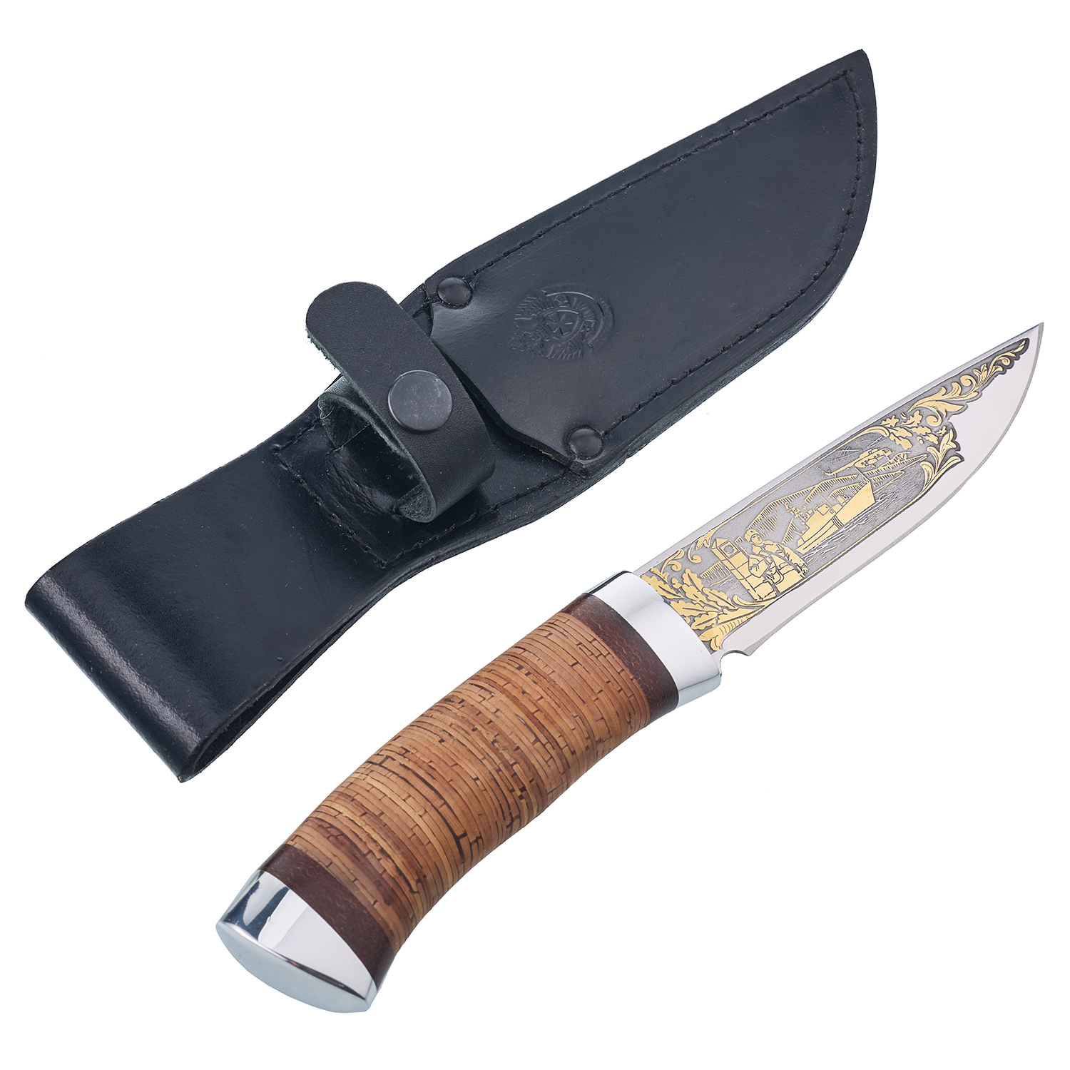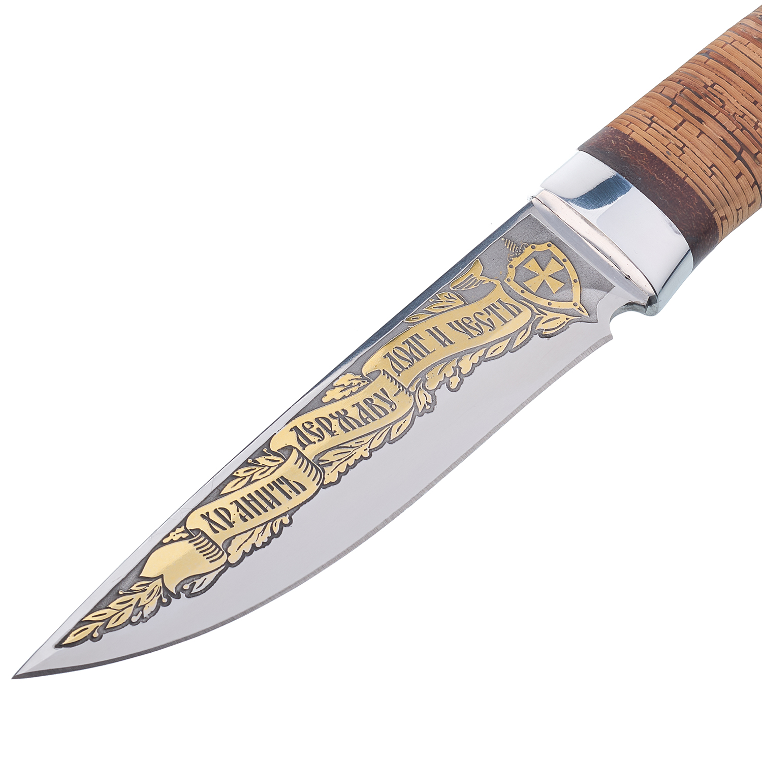 Материалы: сталь 40х10с2м, золото 999,9*, береста, кожа.