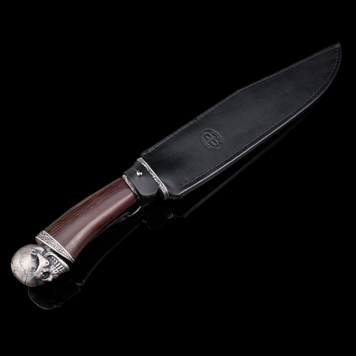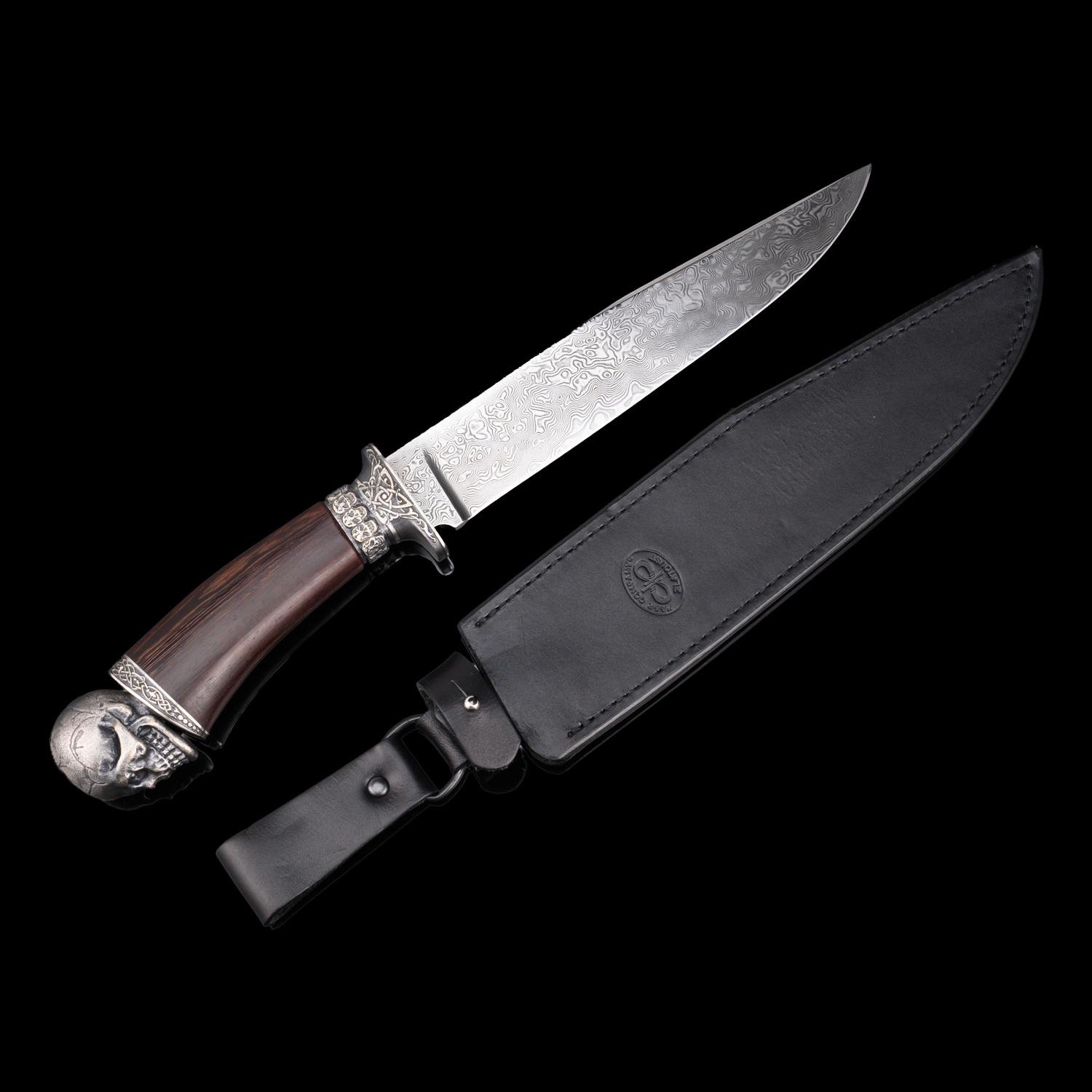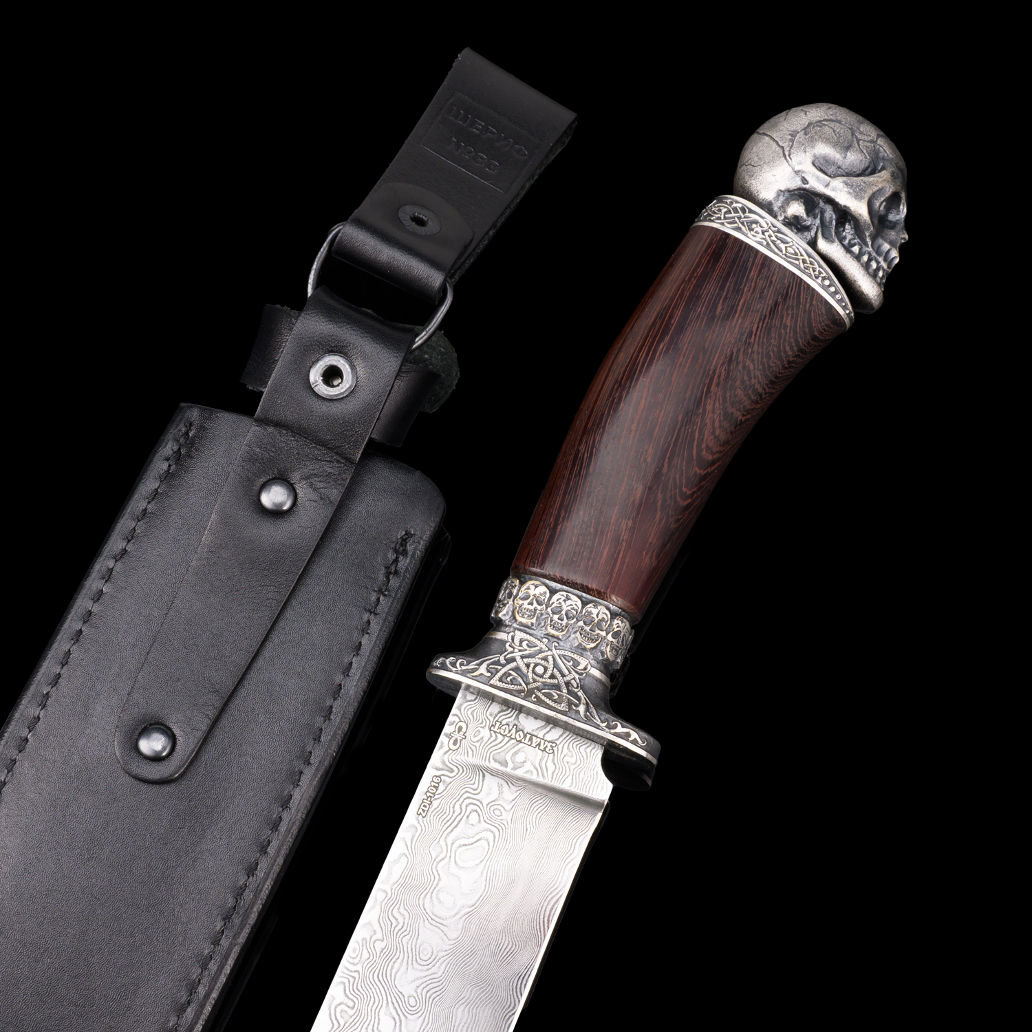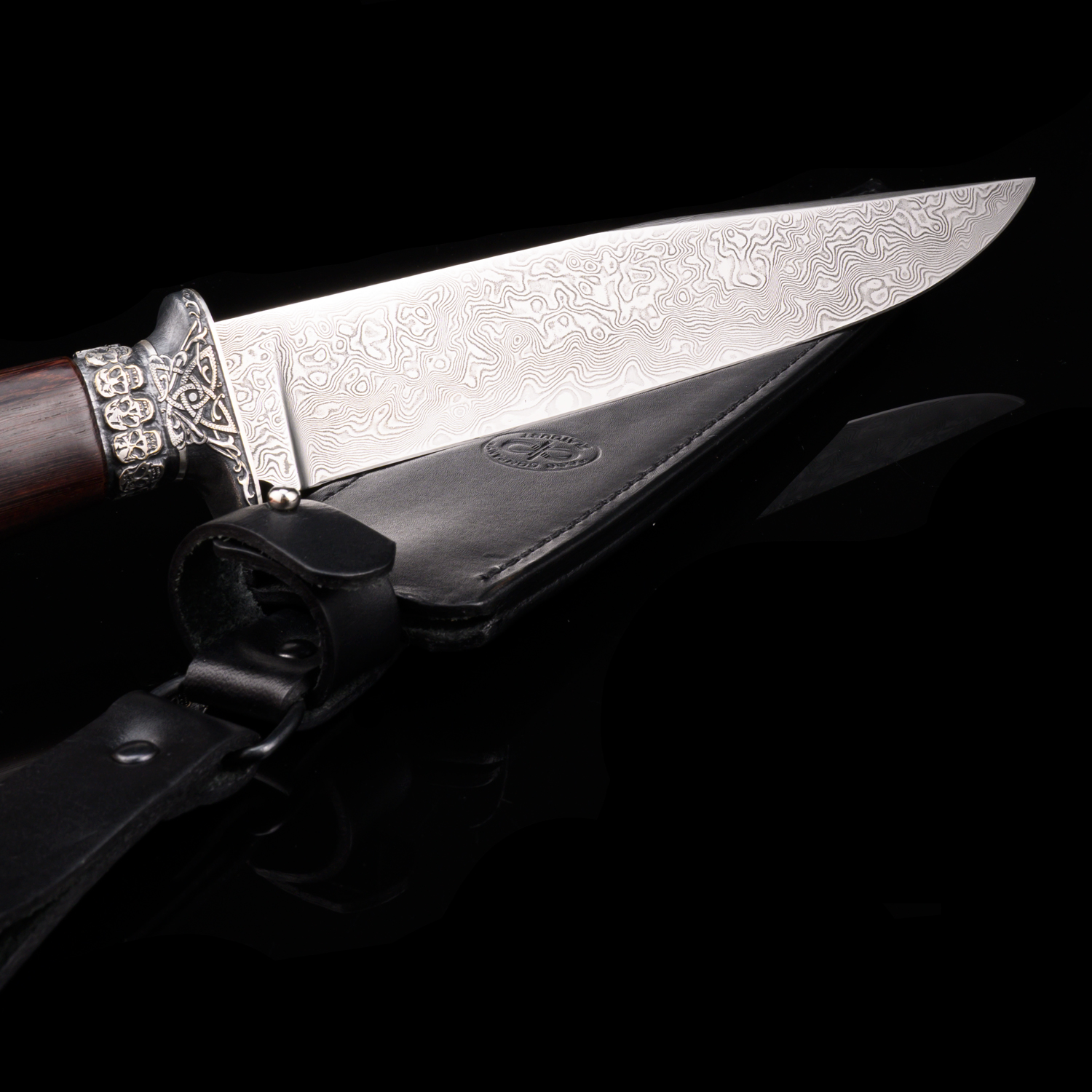 Нож сувенирный из дамасской стали "Вечность". Златоуст.Материалы: дамасская сталь, дерево, бронза, кожа.