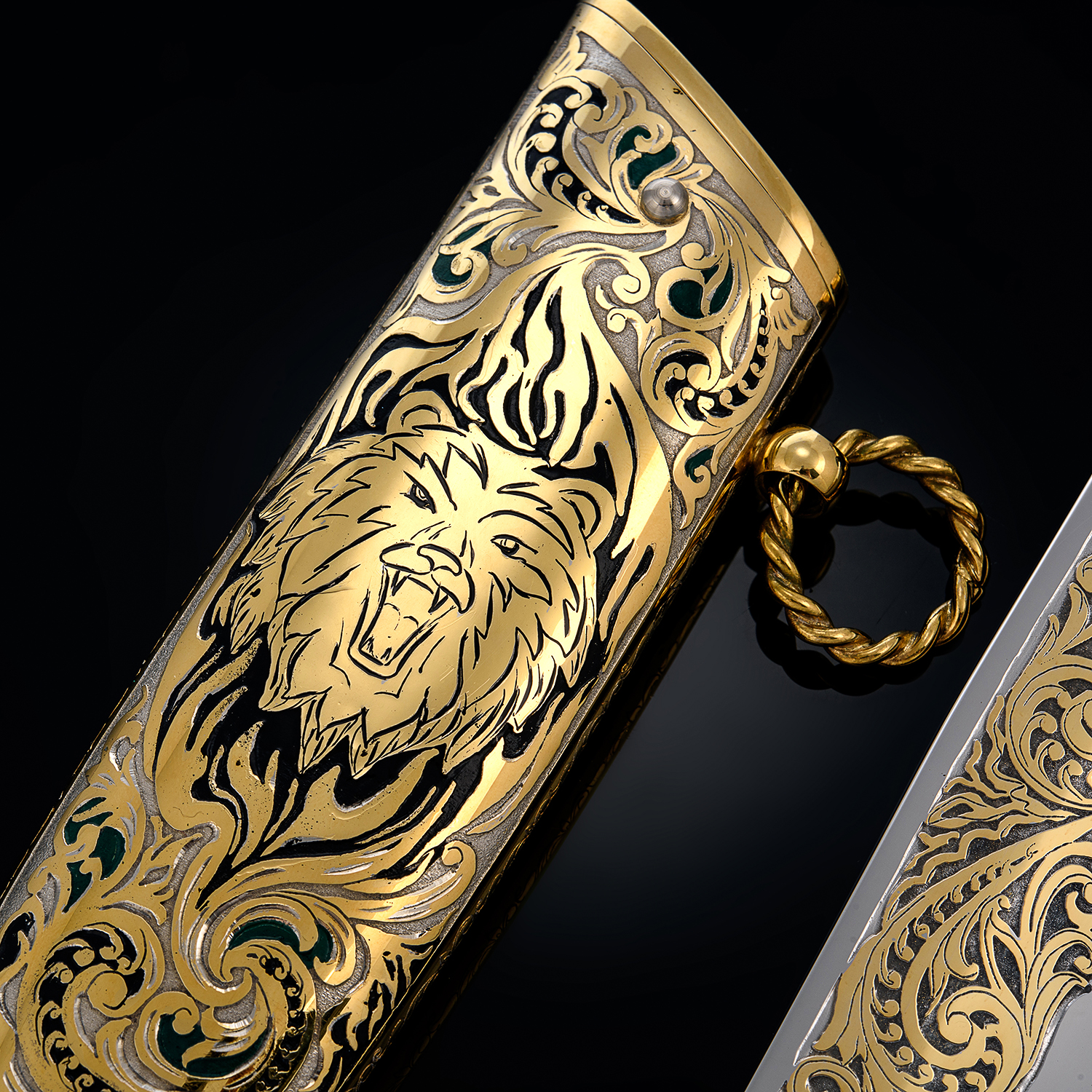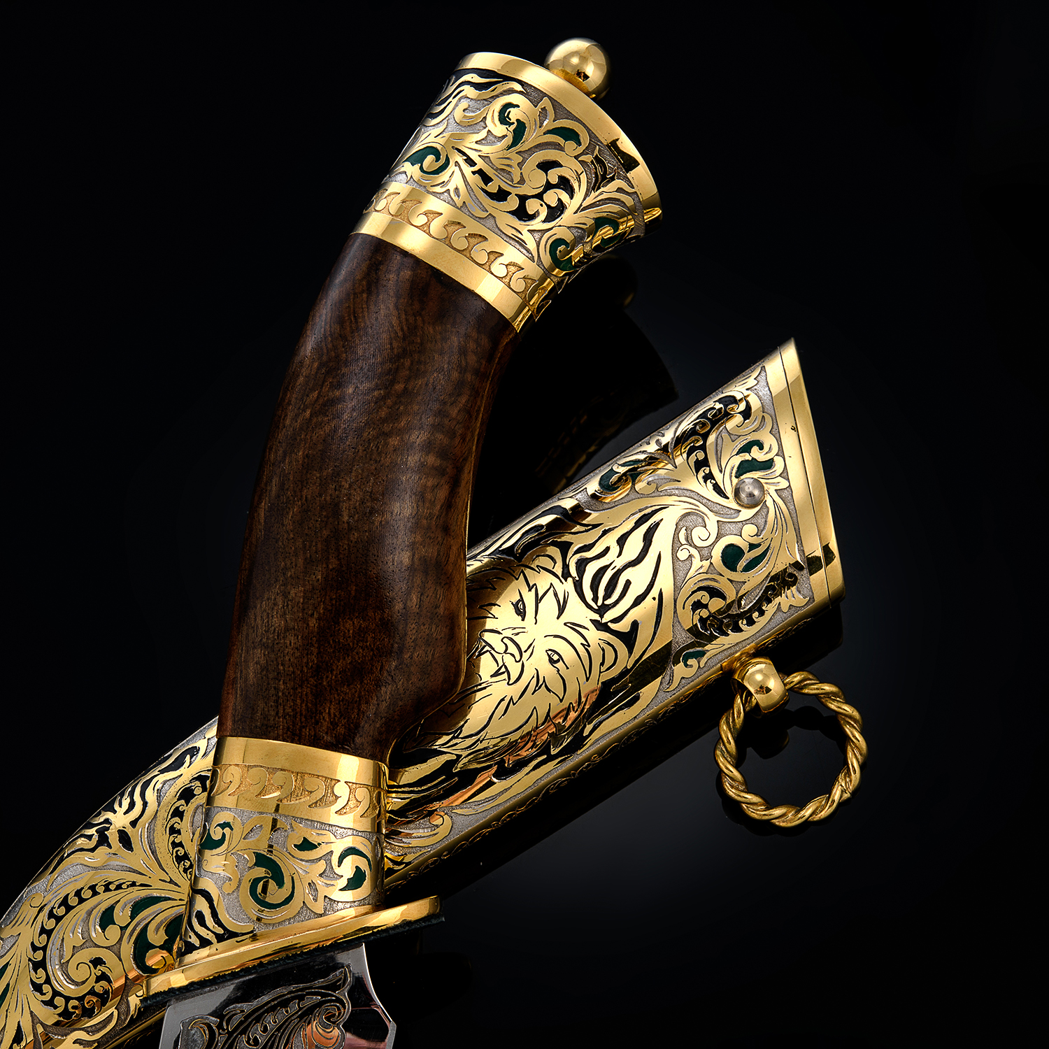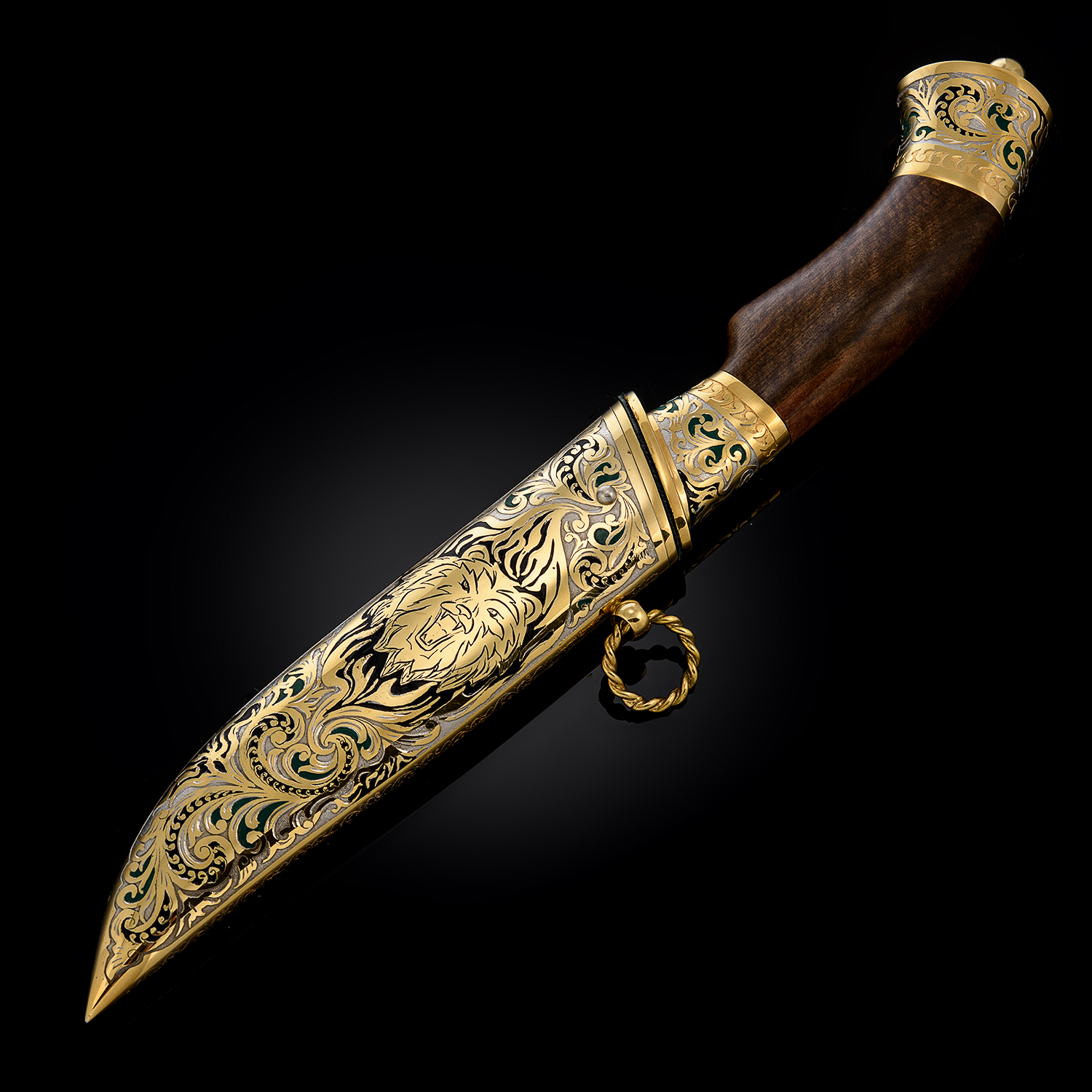 Нож сувенирный "Лев". Златоуст.Материалы: сталь ЭИ-107 (40Х10С2М), латунь, никель, золото 999,9*, эмаль, дерево.