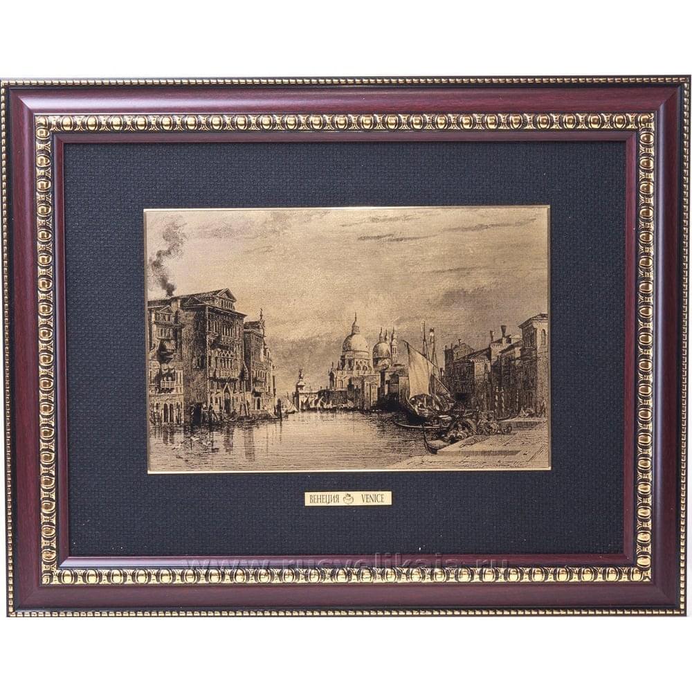 Венецианский пейзаж с судами изображен художником-гравером на латунной пластине. Латунь -  податливый металлический медный сплав, подходящий для высокохудожественных гравюр. Художественная композиция воспроизведена    скрупулезно, с учетом  мельчайших деталей с использованием  эффектной позолоты. Гравюра защищена слоем прозрачного лака.