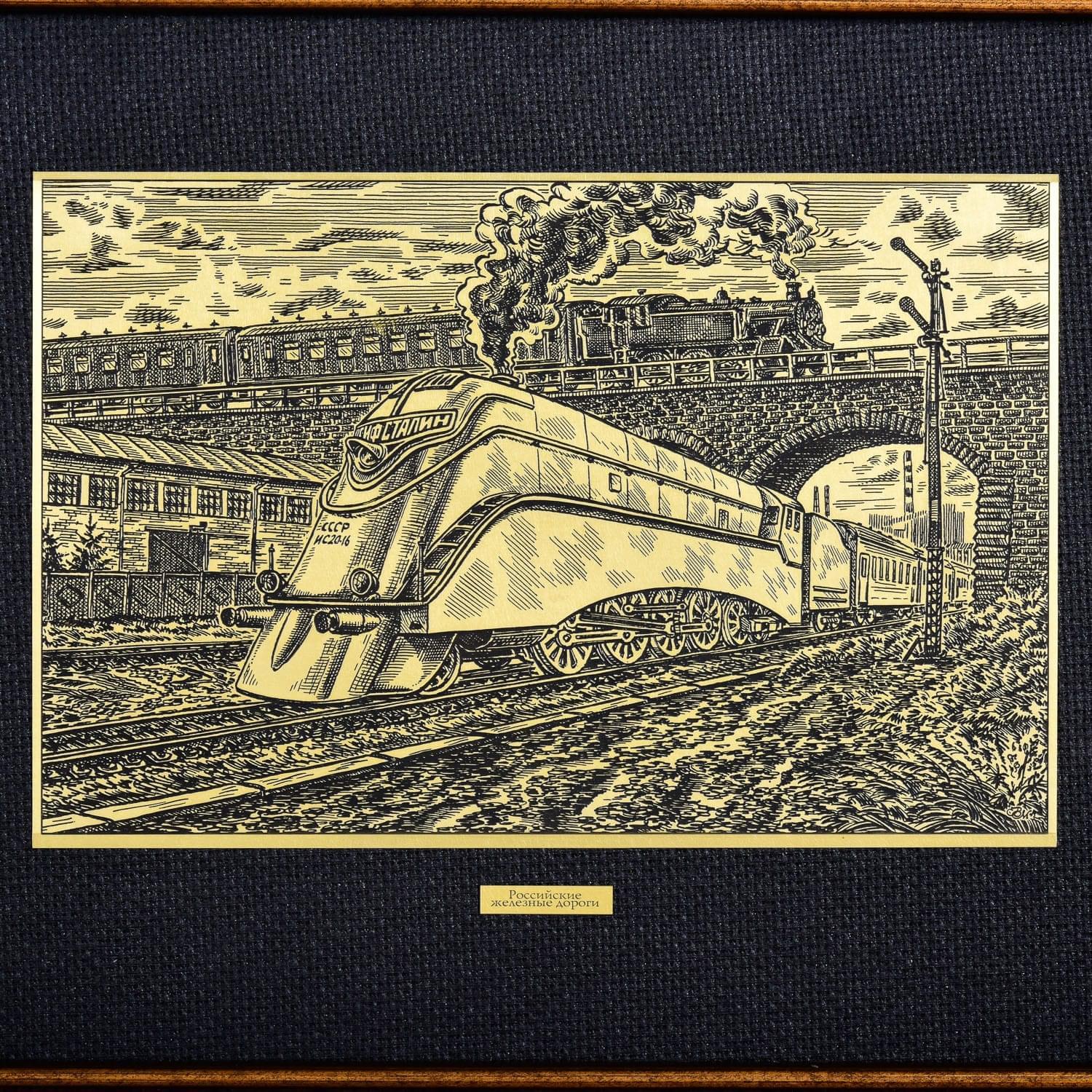 Русские подарки и сувениры → Интерьерные изделия → Офорты → 0058962/25*32см Офорт черно-белый "Локомотив "Иосиф Сталин. Коллаж""