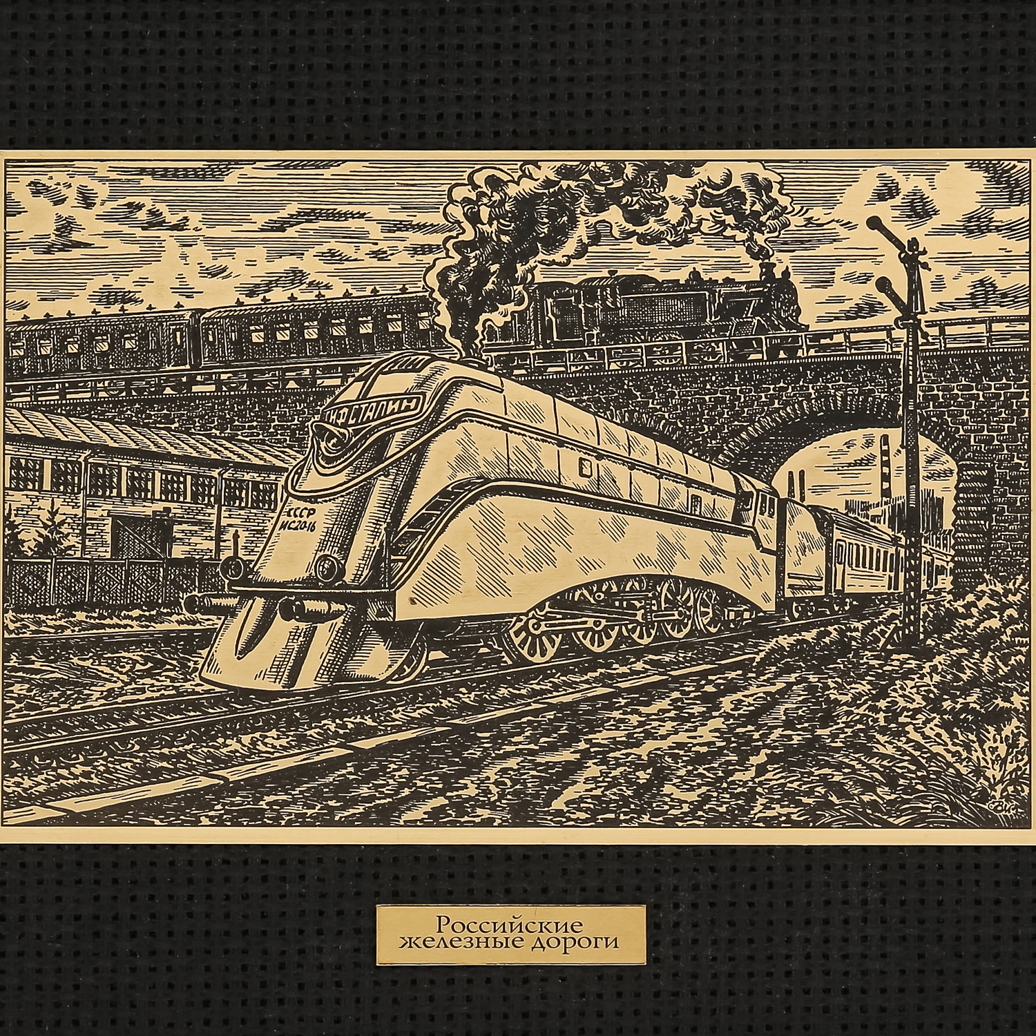 Русские подарки и сувениры → Интерьерные изделия → Офорты → Офорт черно-белый "Локомотив Иосиф Сталин. Коллаж" 17х22 см