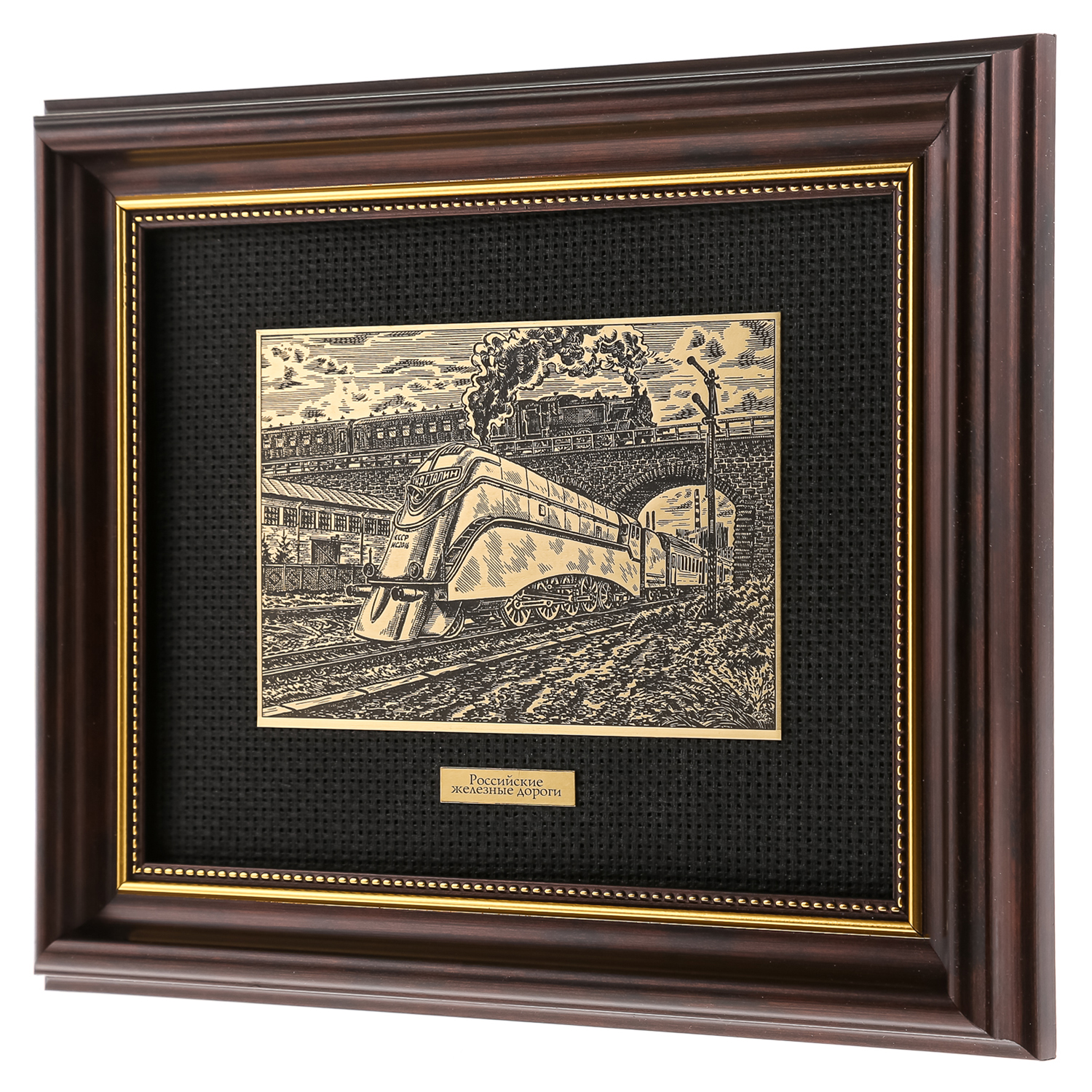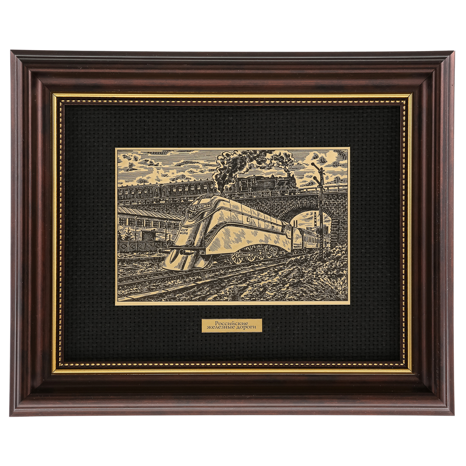 Офорт черно-белый "Локомотив Иосиф Сталин. Коллаж".Материалы: латунь, паспарту, деревянный багет.