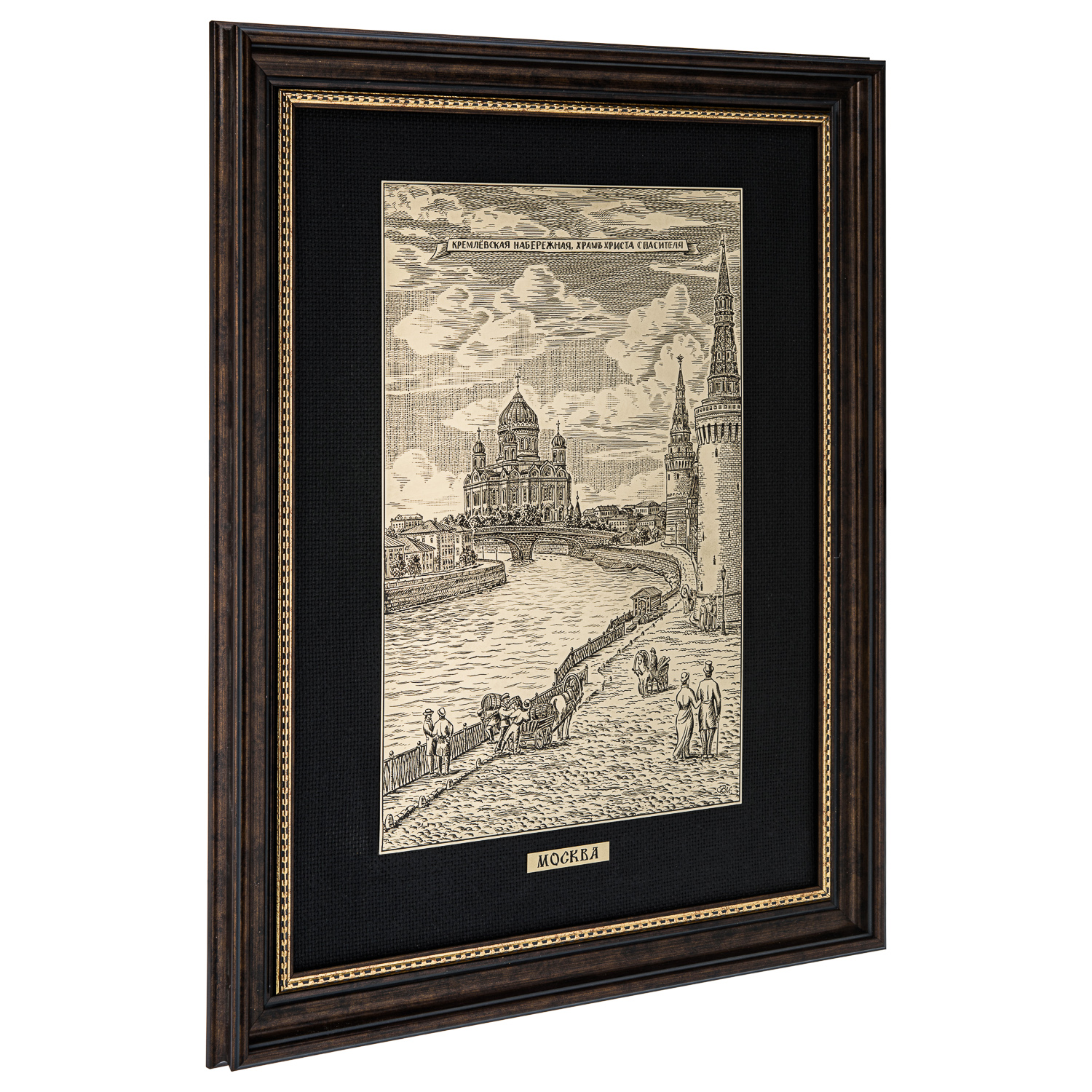 Офорт черно-белый "Храм Христа Спасителя. Кремлевская набережная".Материалы: латунь, паспарту, деревянный багет.