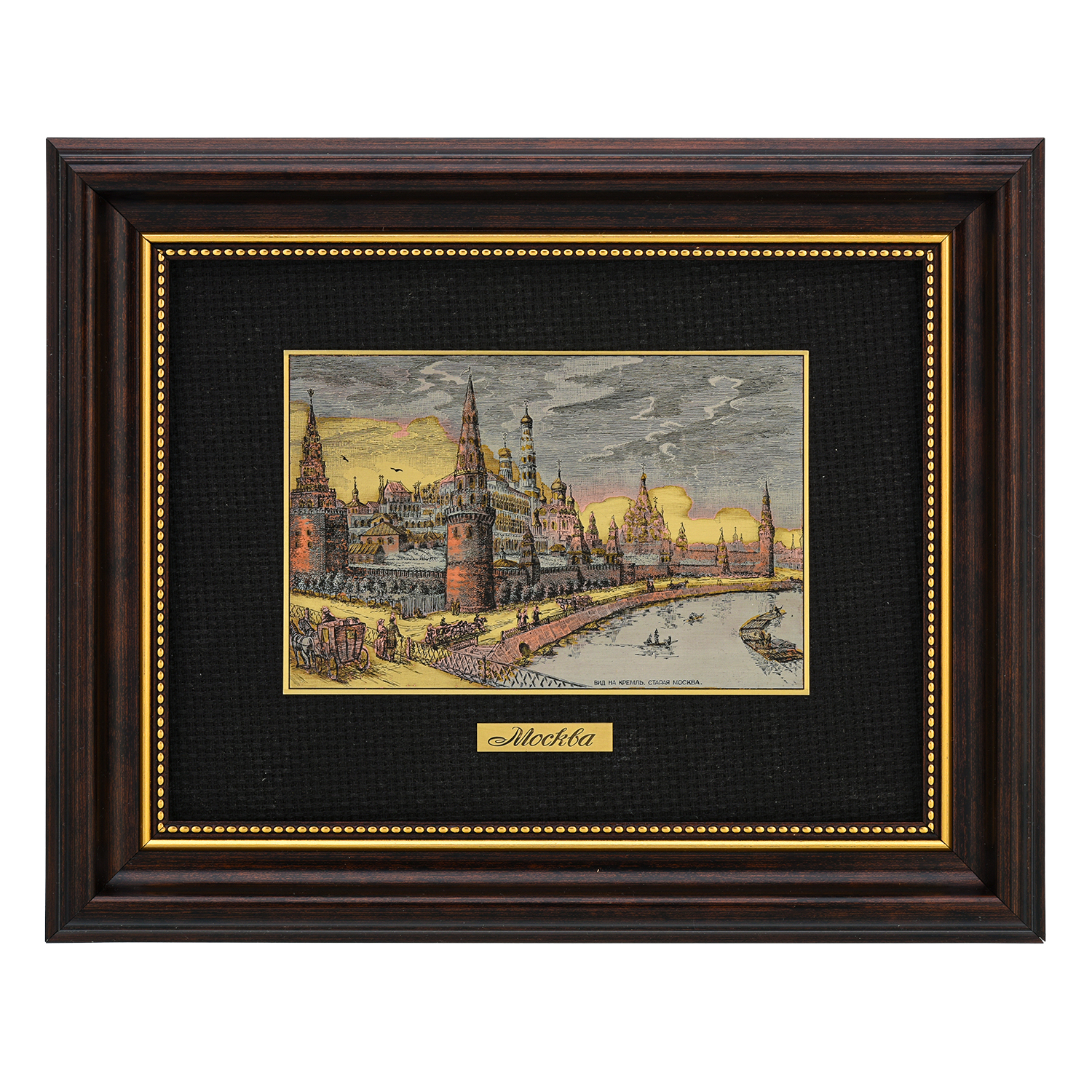 Офорт цветной "Вид на Кремль. Старая Москва".Материалы: латунь, никель, медь, паспарту, деревянная рама.