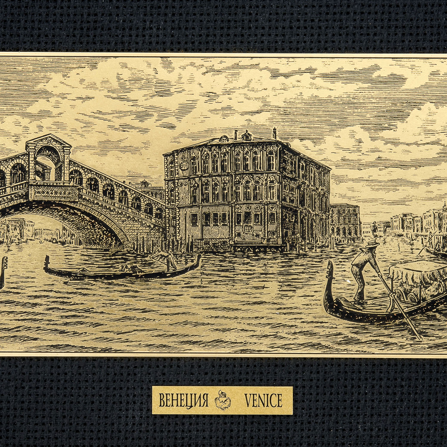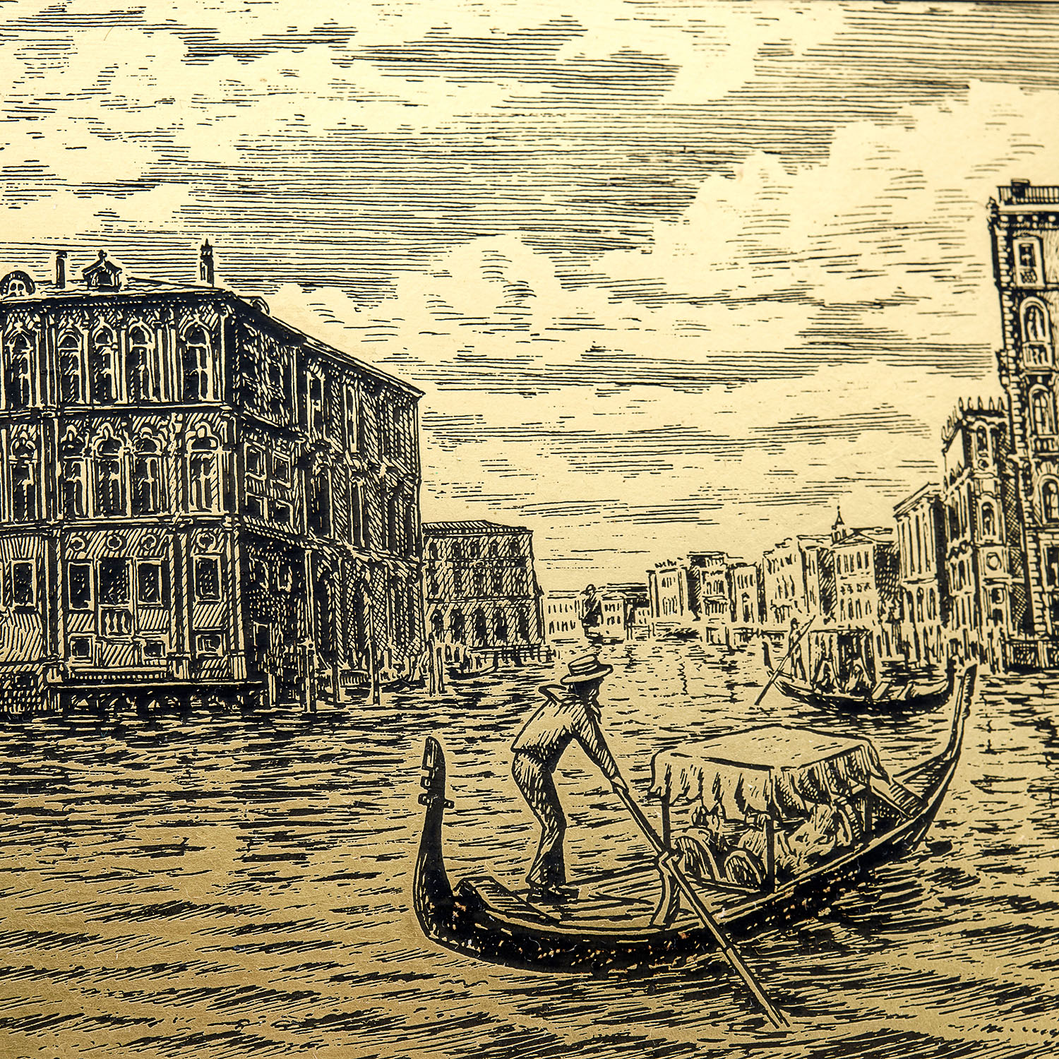 Венеция - уголок Италии, поцелованный богом, место силы творческих людей. Вашему вниманию- классический офорт, венецианский пейзаж на латунной пластиной, которая закреплена на паспарту. Лирический пейзаж с открытой перспективой и видом на канал и плавающей гондолой призван стать символом мечты и подчеркнуть чувство стиля, создать на стене в интерьере мотивирующий акцент.Офорт - разновидность художественной гравюры на металле, которая выполняется вручную в технике вытравливания. Гравюра как вид декоративно-прикладного искусства стала популярна в эпоху Ренессанса, в 15 веке. Офортами даже иллюстрировали книги! Этот интерьерный аксессуар был доступен по цене и в то же время отличался художественной ценностью. Сегодня офорт с тематической композицией - это классический вариант подарка, который украсит интерьер и напомнит о дарителе.