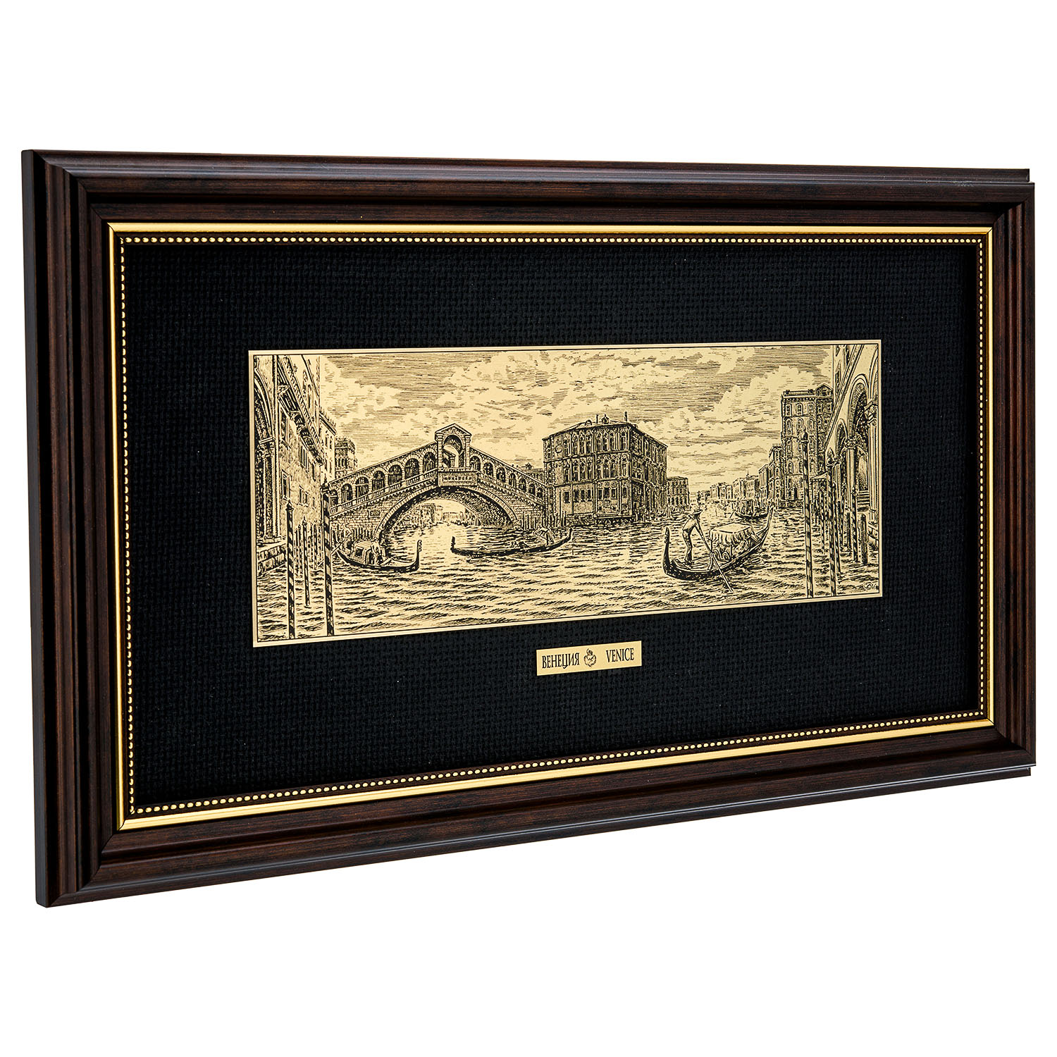Венецианский пейзаж с судами изображен художником-гравером на латунной пластине. Латунь - податливый металлический медный сплав, подходящий для высокохудожественных гравюр. Художественная композиция воспроизведена скрупулезно, с учетом мельчайших деталей с использованием эффектной позолоты. Гравюра защищена слоем прозрачного лака.
