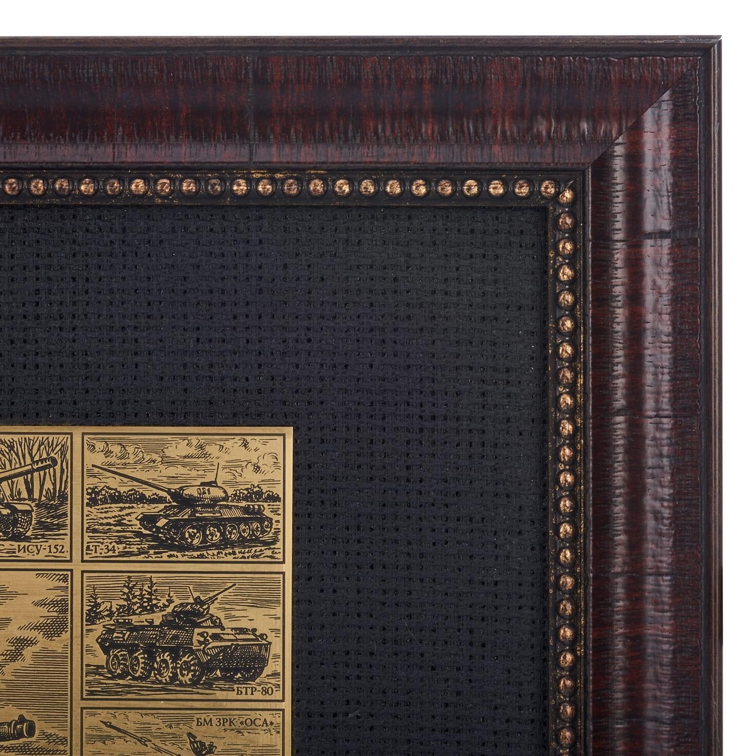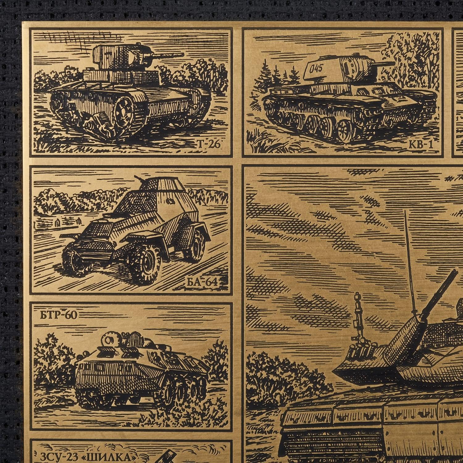 Гравюра на латуни выполнена в технике офорта с помощью ручного травления. Латунная пластина обрамлена в паспарту из плотной ткани и багетную раму. Эксклюзивная работа, офорт "Танк Армата" - это отличный и символичный подарок для мужчины, интересующегося боевой техникой, военного на общий, в том числе профессиональный или личный праздник.