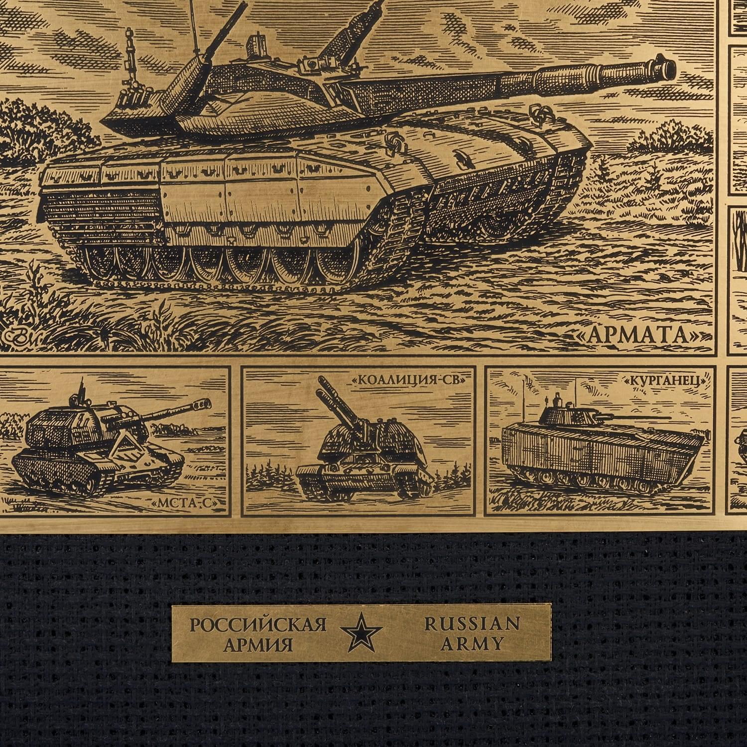 Этот стильный элемент декора выполнен из металлического медного сплава латуни, издавна используемого художниками и скульпторами для изготовления оригинальных предметов декора. На латунной пластине изображен танк "Т-14" - новое российское оружие, основной боевой танк на гусеничной платформе "Армата", отличающийся принципиально новой компоновкой с необитаемой башней.