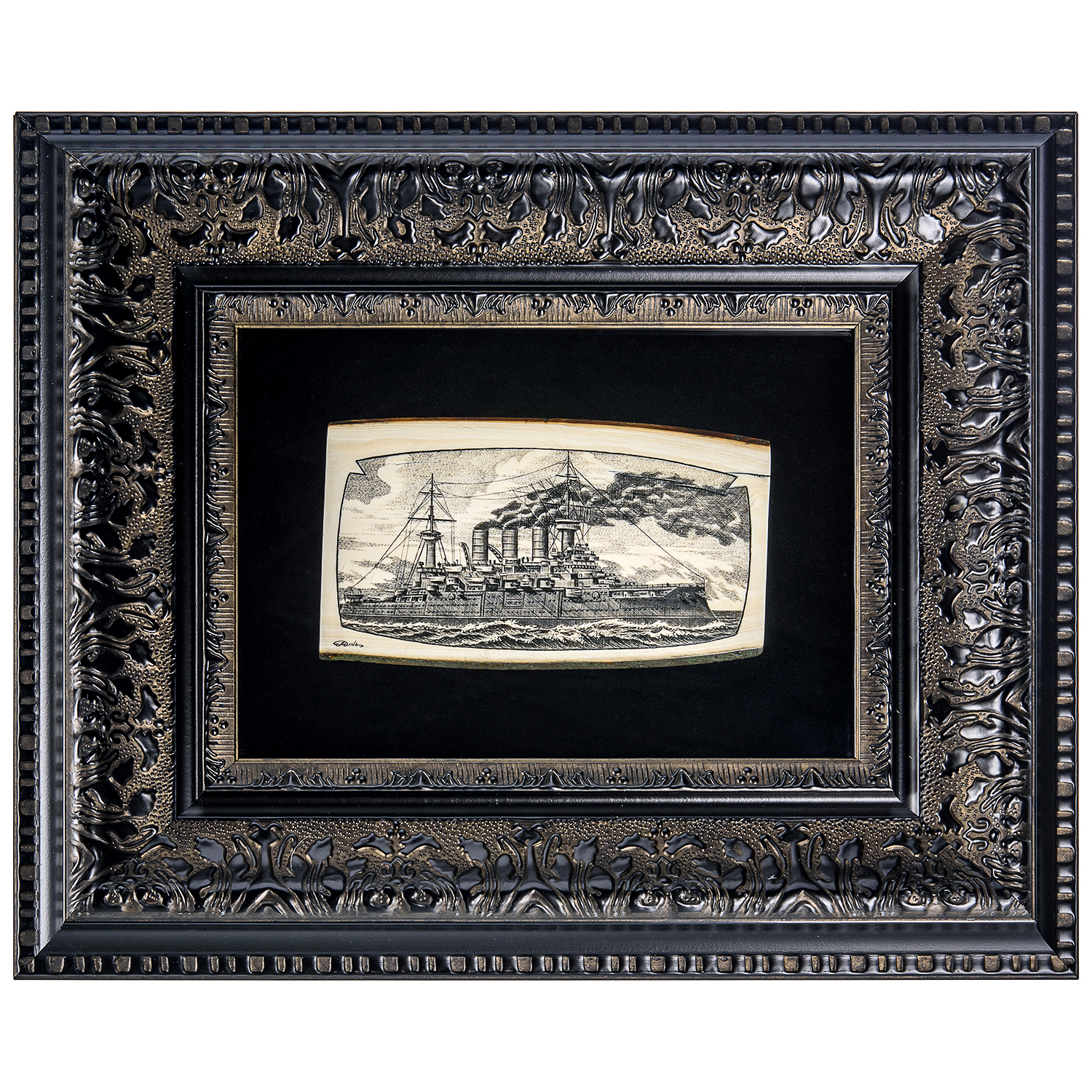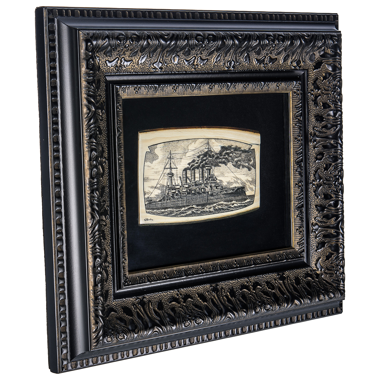 Панно из кости "Крейсер".Материалы: кость, паспарту, деревянный багет.