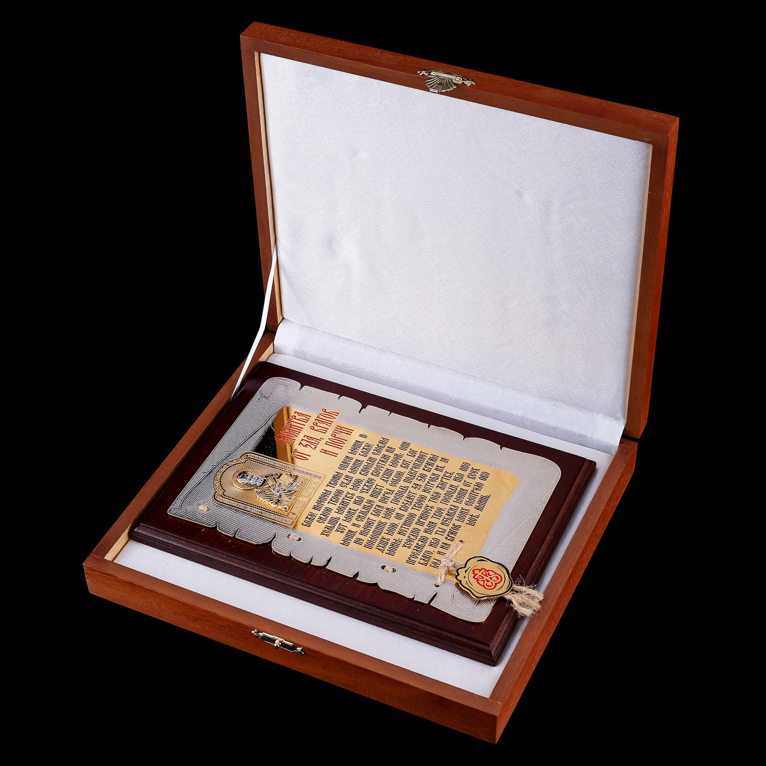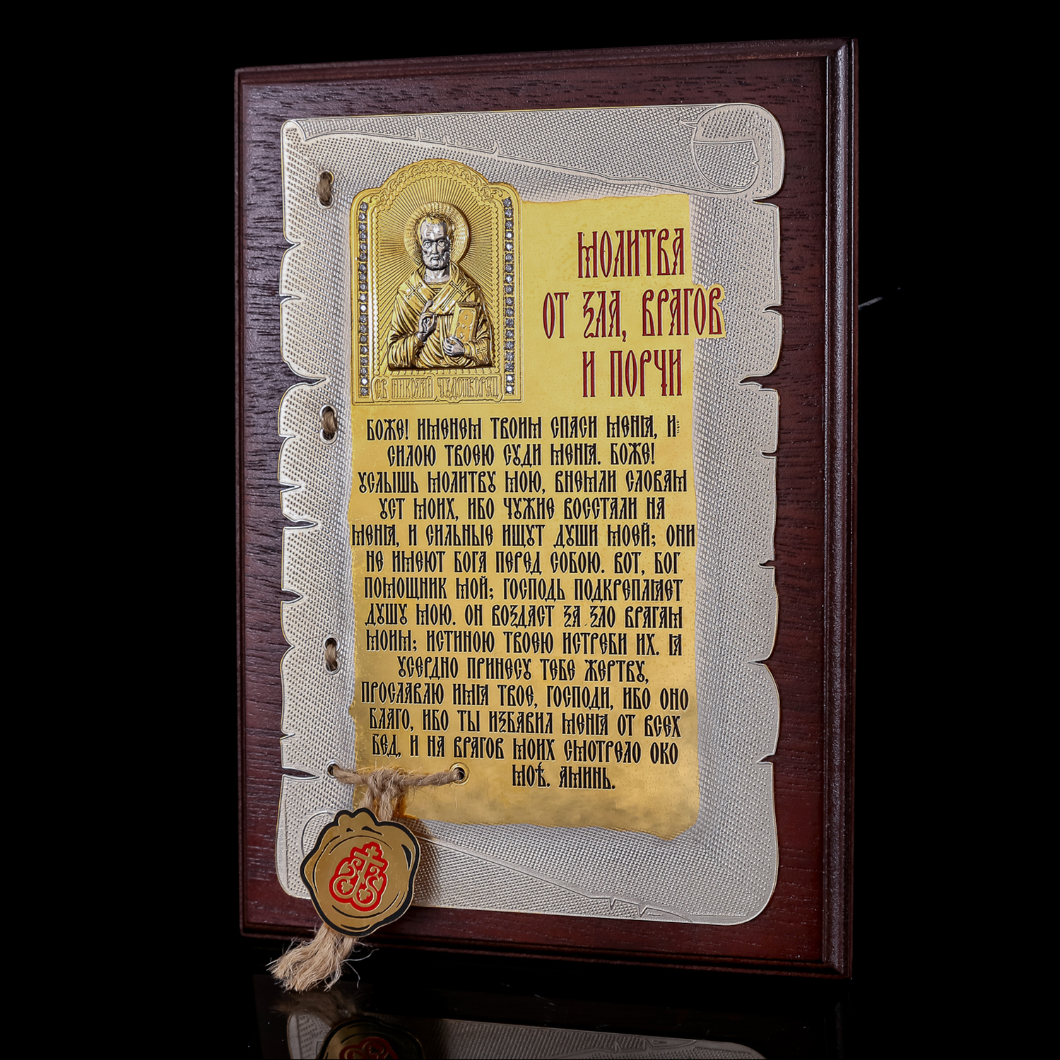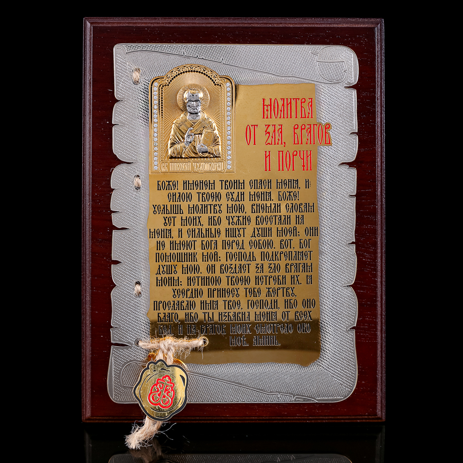 Плакетка "Молитва от зла, врагов и порчи". Златоуст.Материалы: латунь, никель, золото 999,9*, эмаль, дерево.