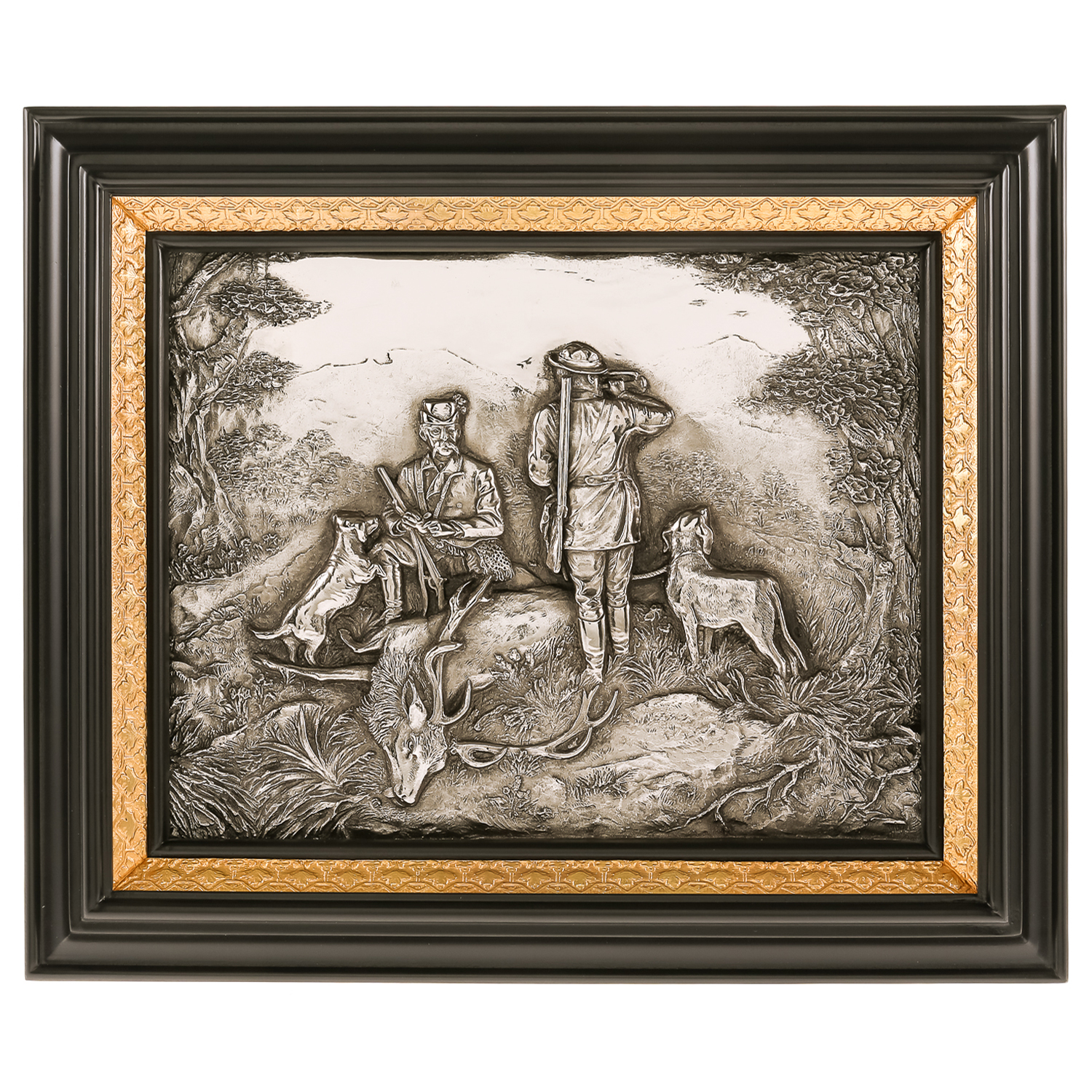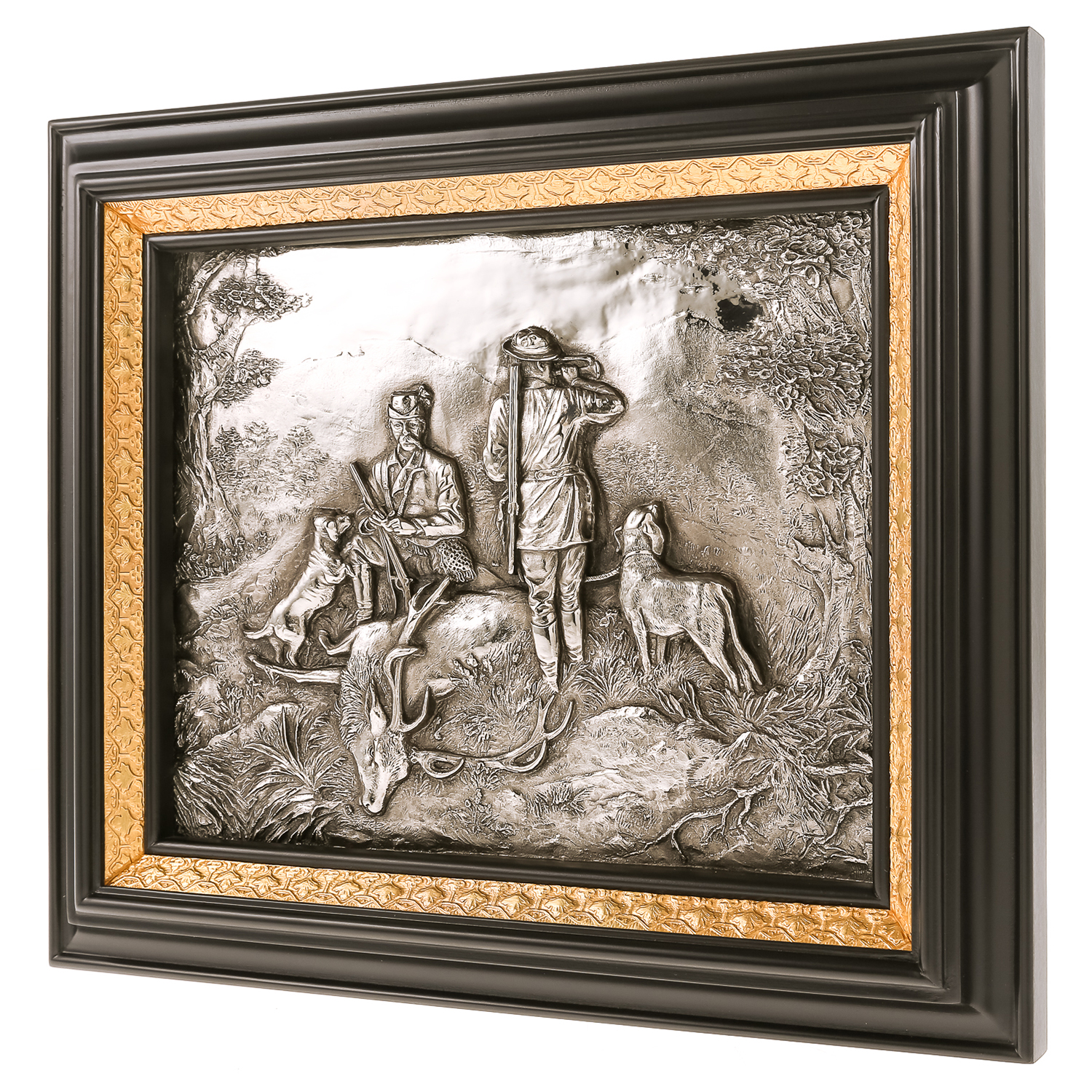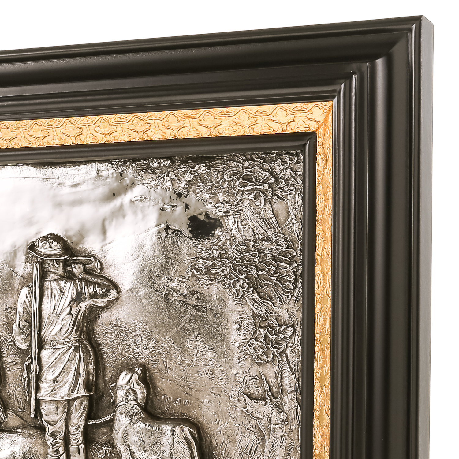 Панно "Охота".Материалы: гальванопластика (медь, серебрение) дерево, золочение.