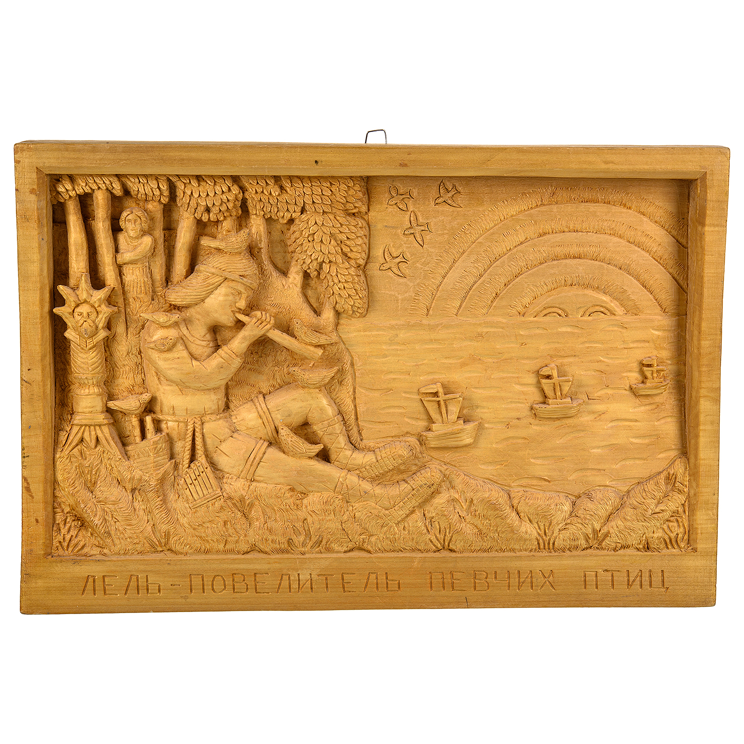 Деревянное резное панно "Лель, повелитель птиц" 49х33 см