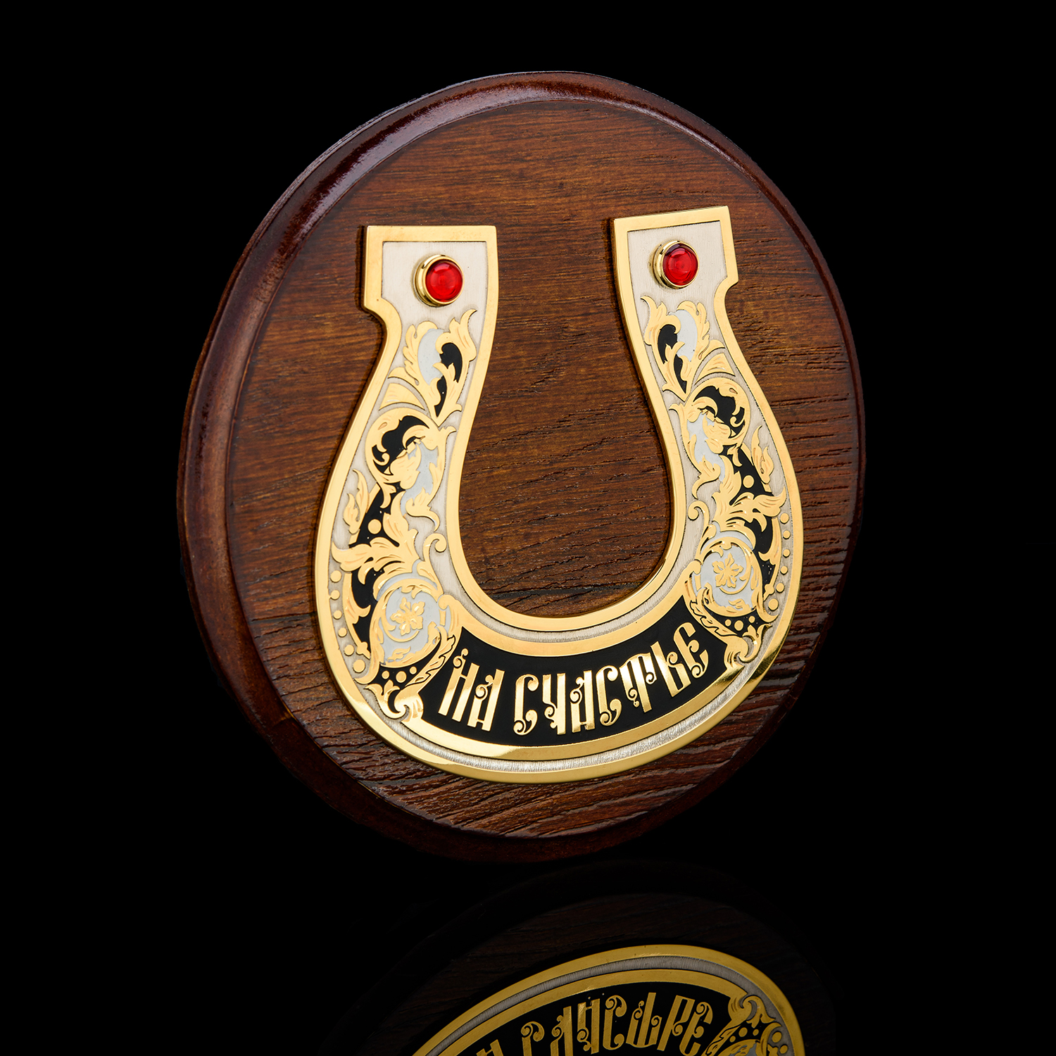 Панно "Подкова на счастье". Златоуст.Материалы: латунь, никель, золото 999,9*, эмаль, фианиты, дерево.