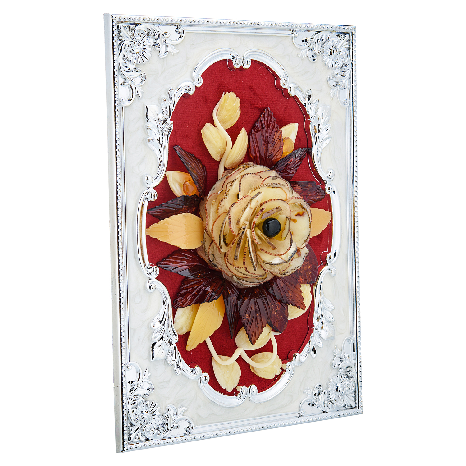 Русские подарки и сувениры → Интерьерные изделия → Панно → Настольное янтарное панно "Открытка с цветами" 21х15 см