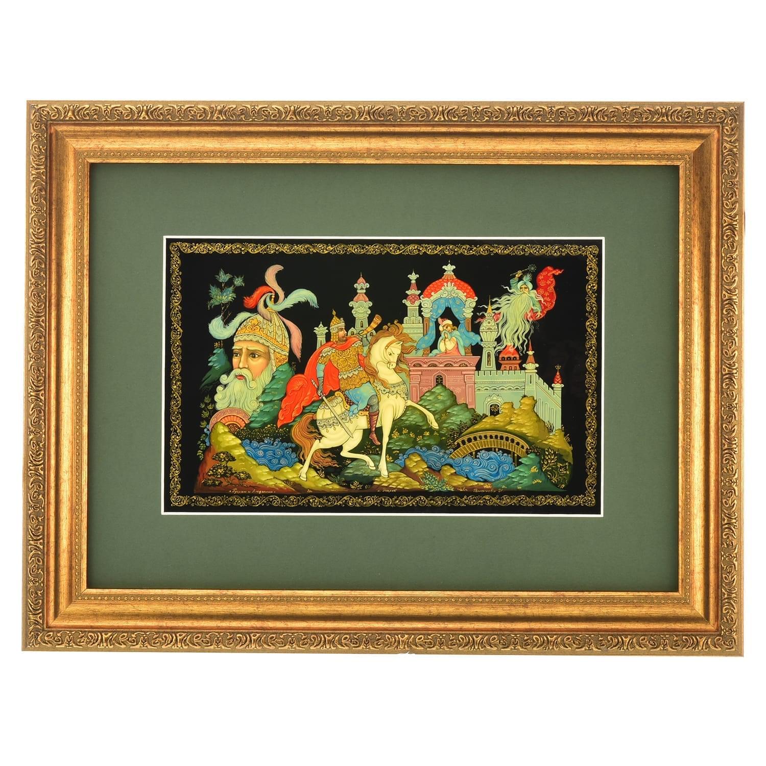 Русские подарки и сувениры → Интерьерные изделия → Панно → Лаковая миниатюра Панно из папье-маше "Руслан и голова" Палех 45 х 33 см