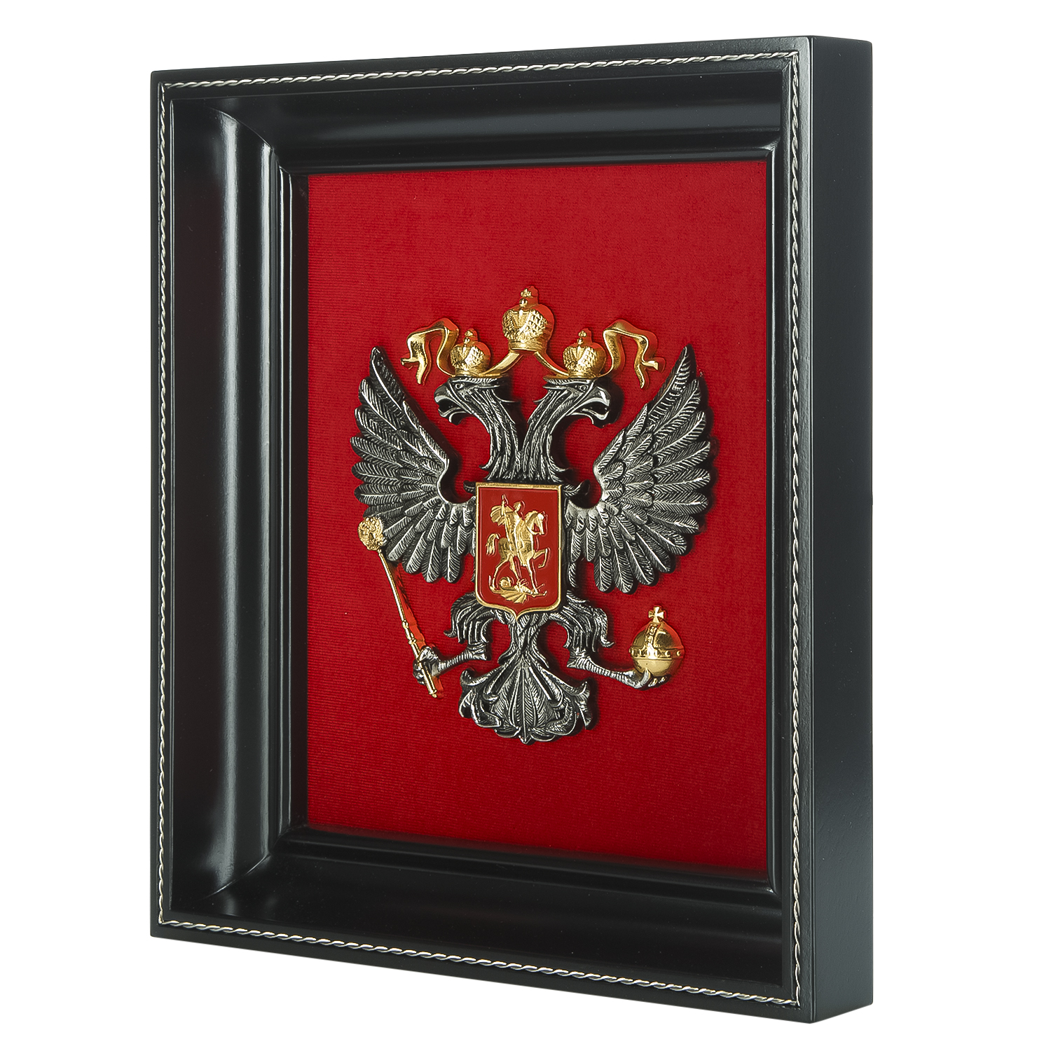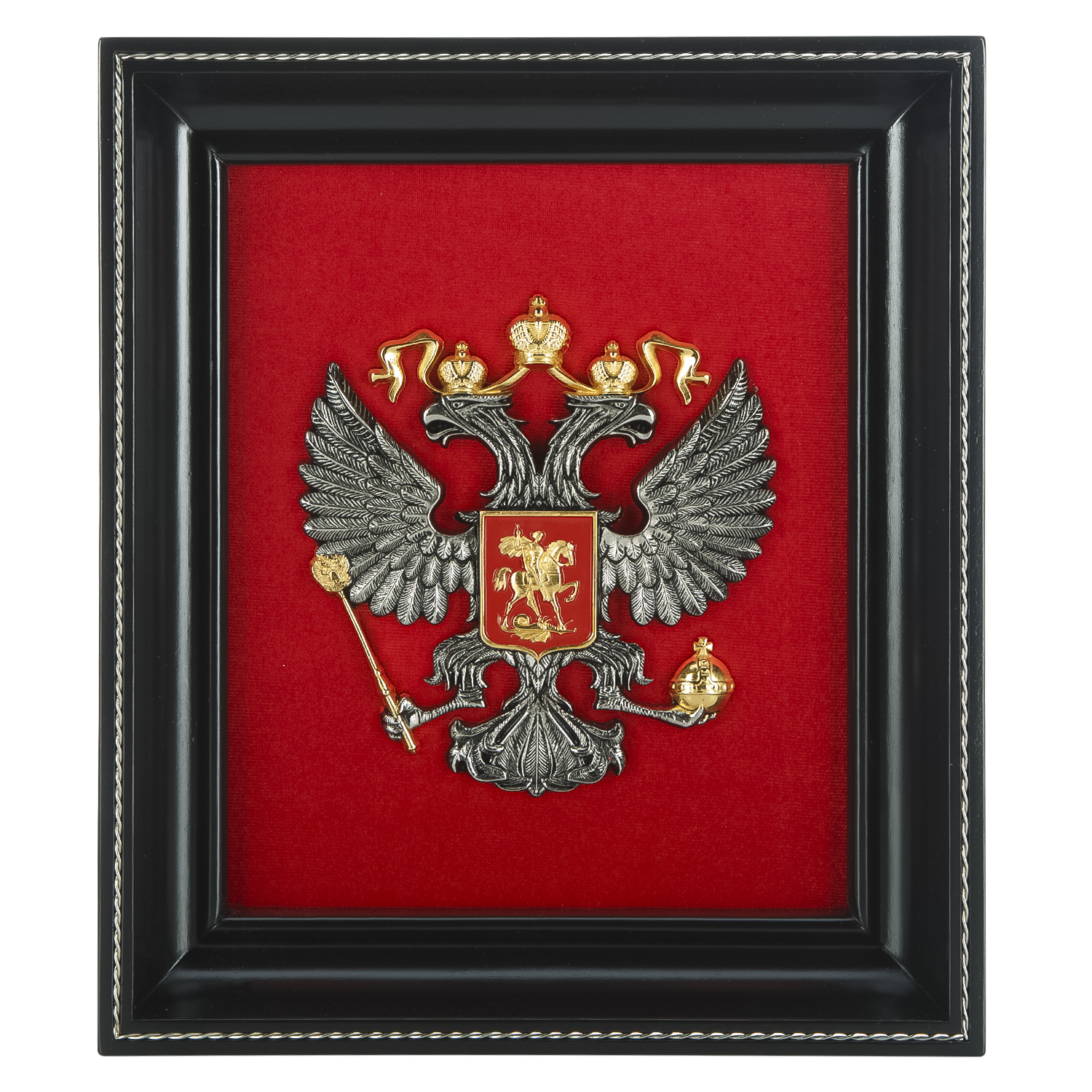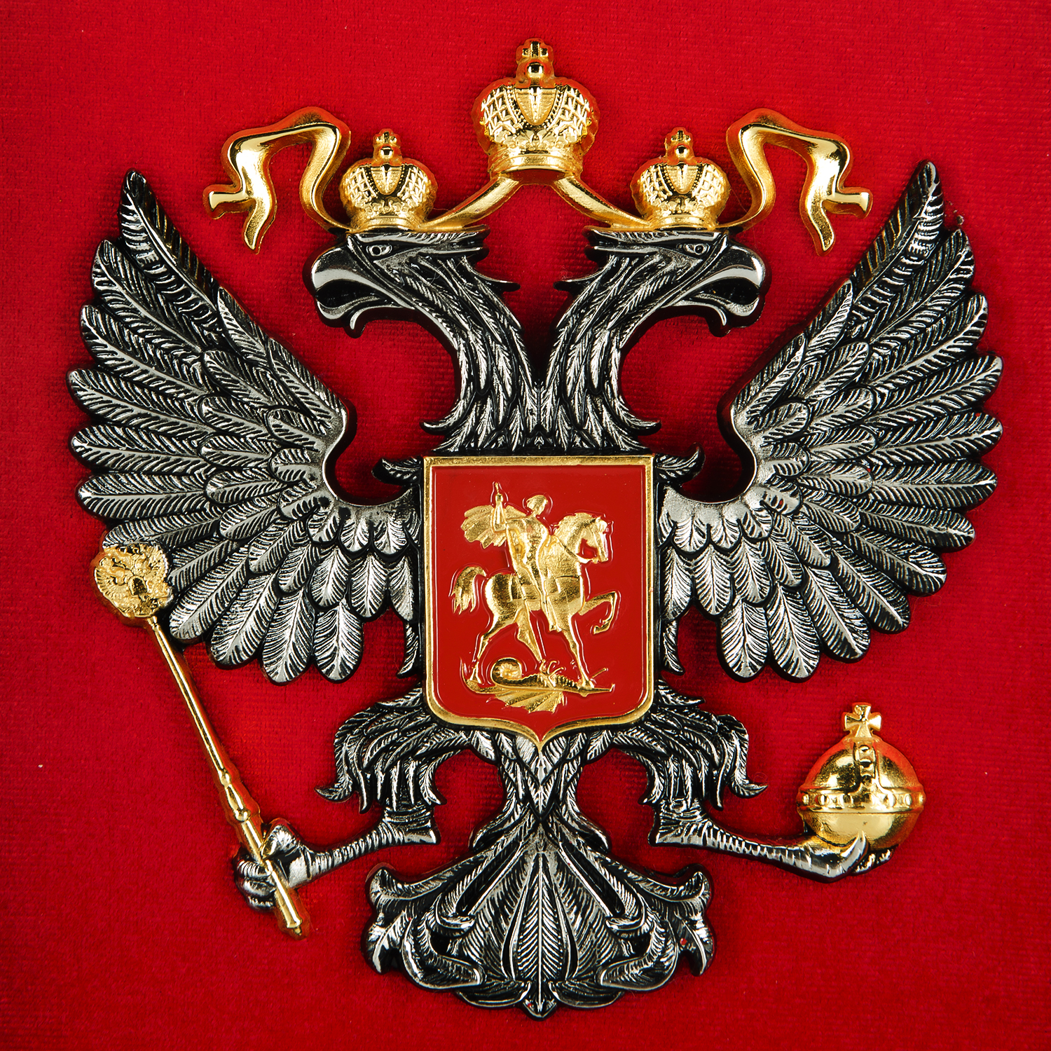 Панно "Герб России".Материалы: гальванопластика (медь, серебрение, золочение, эмаль), бархат, дерево.