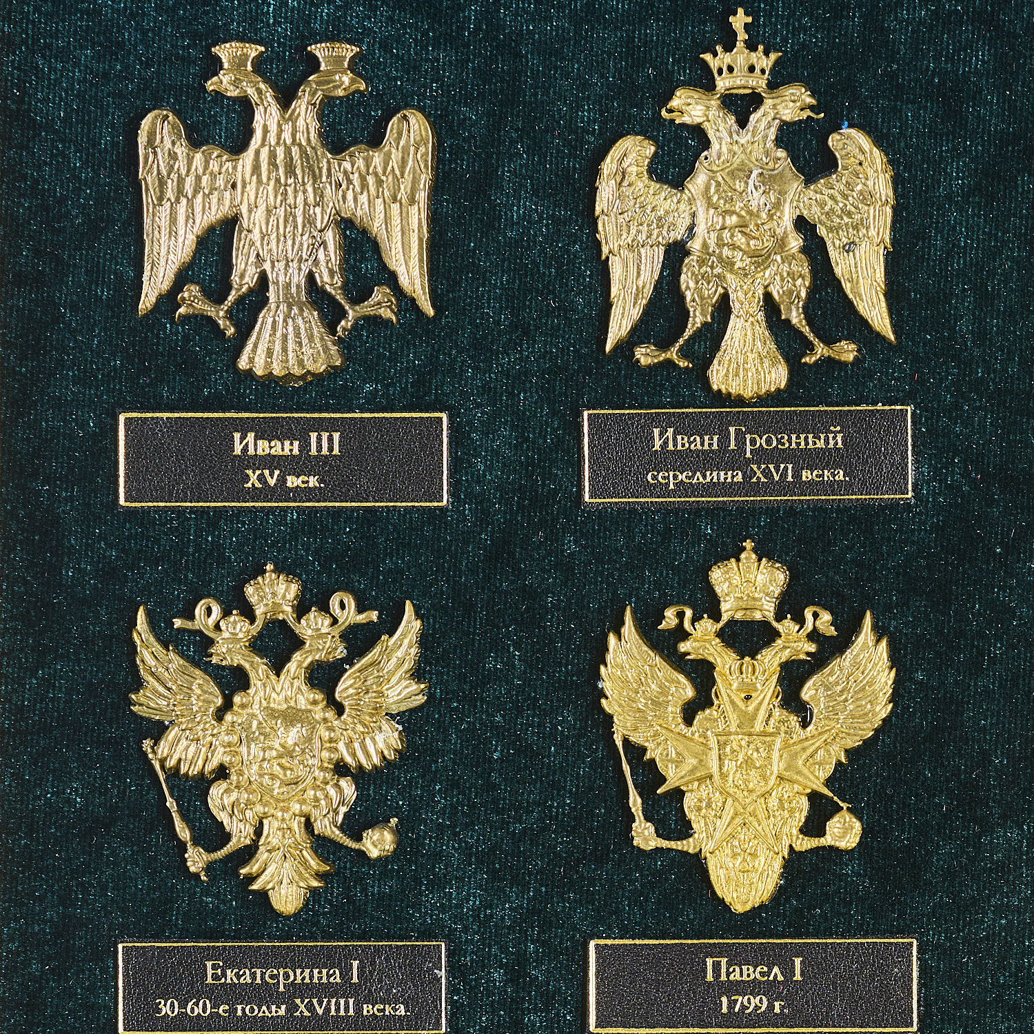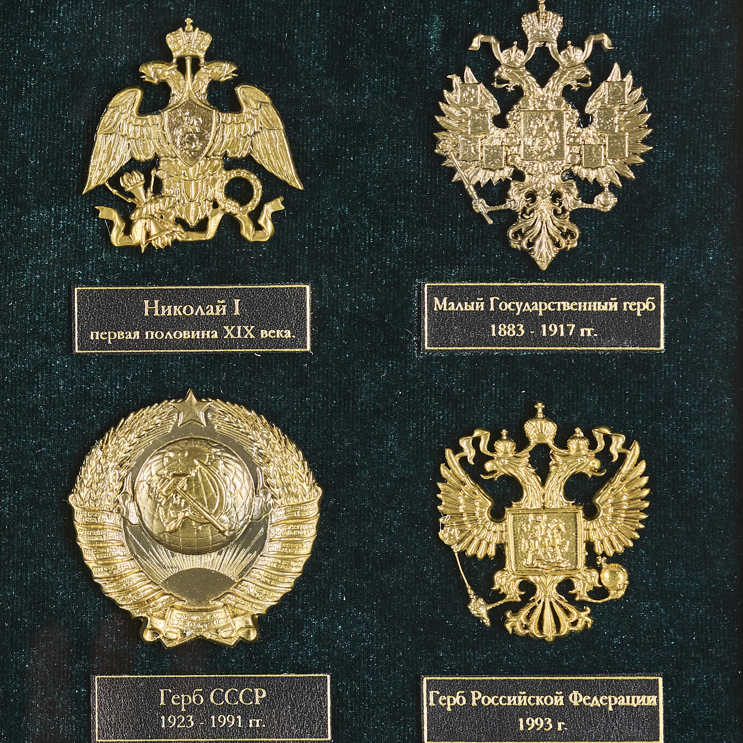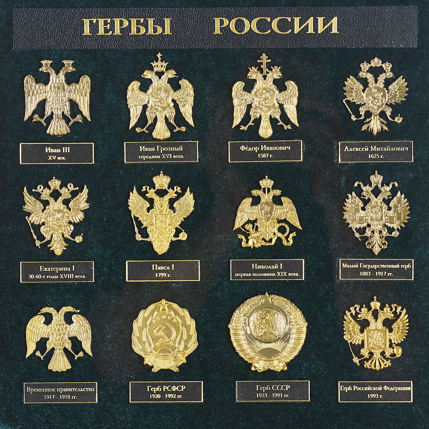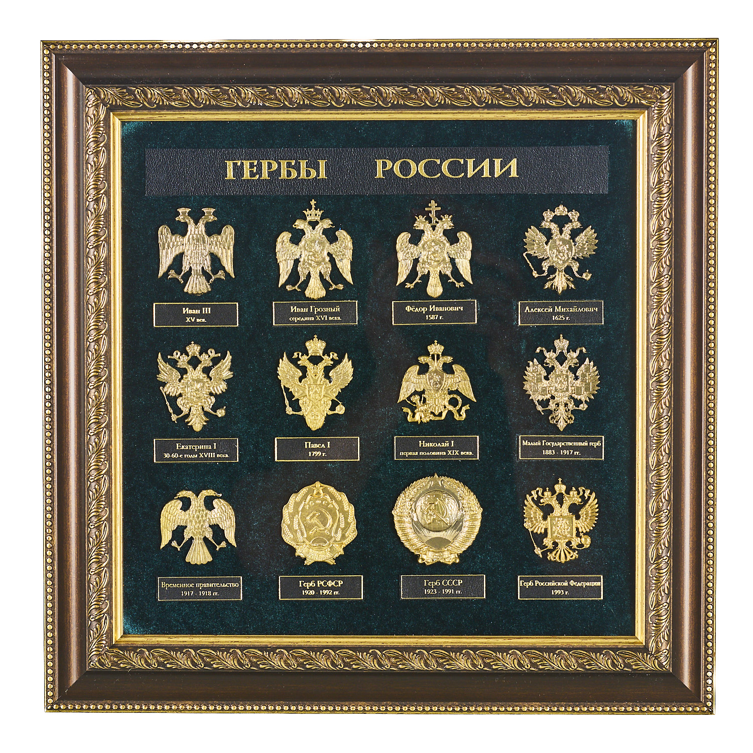 Панно "Гербы России".Материалы: дерево, бархат, бронза, золочение.