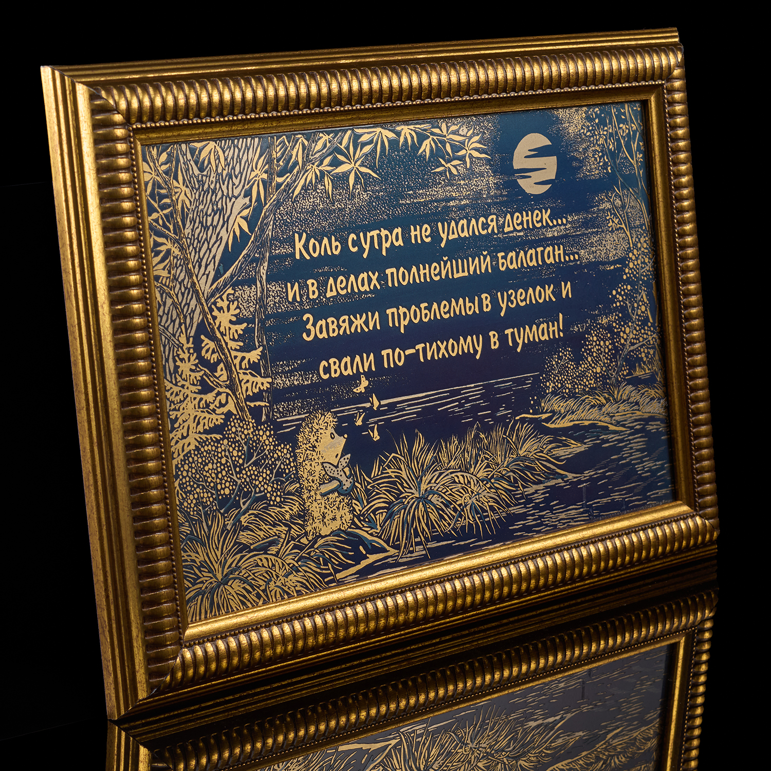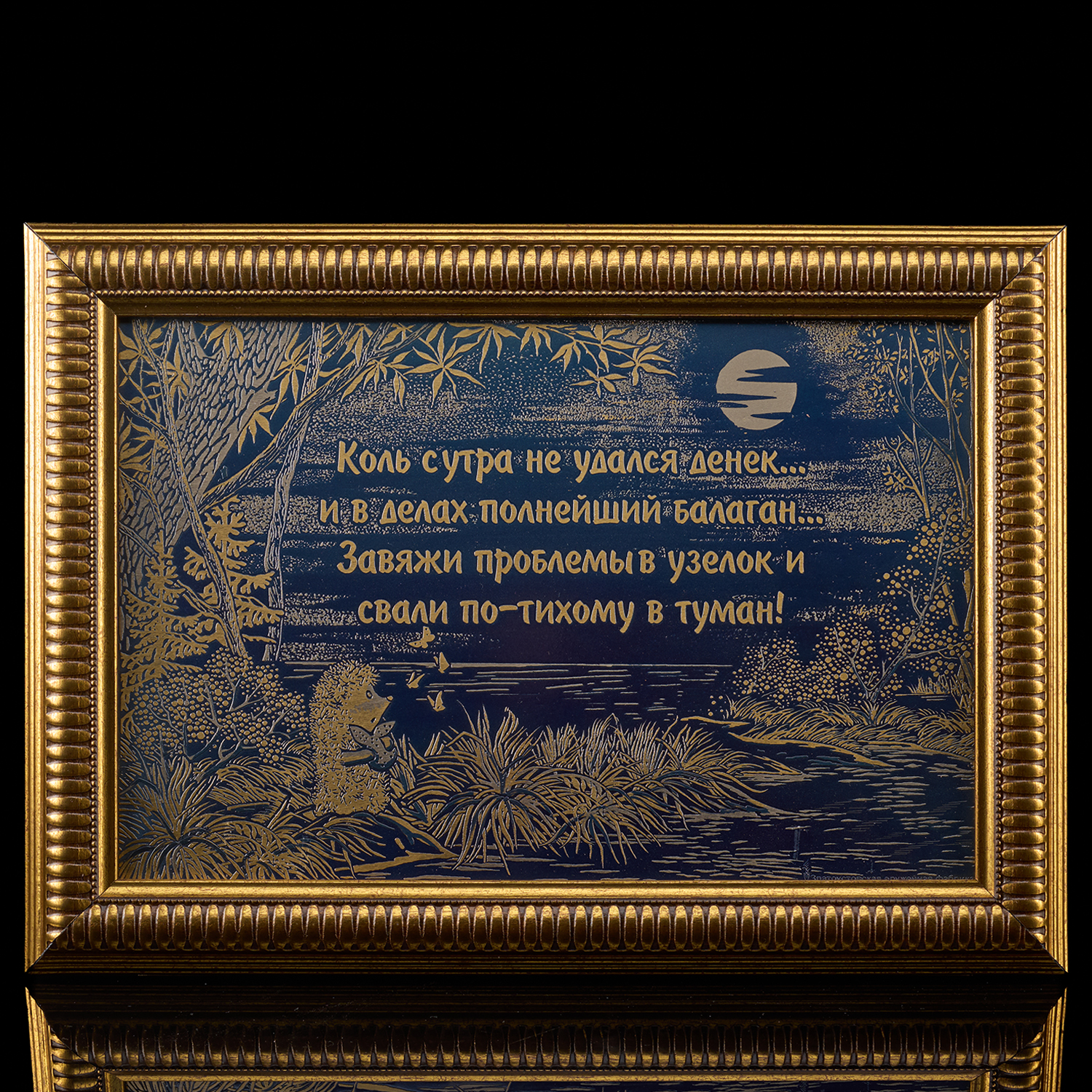 Русские подарки и сувениры → Интерьерные изделия → Панно → Панно-гравюра "Коль с утра не удался денек". Златоуст 35х25 см