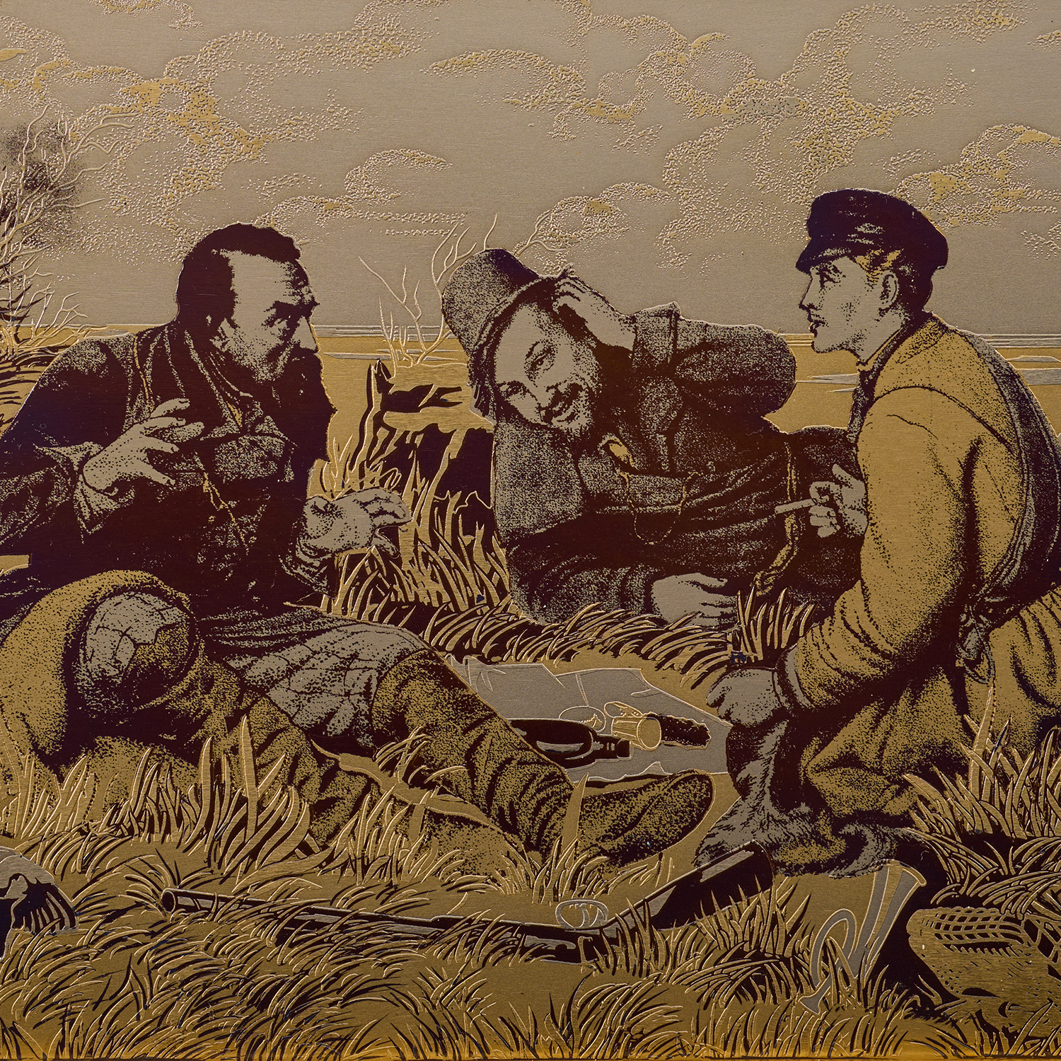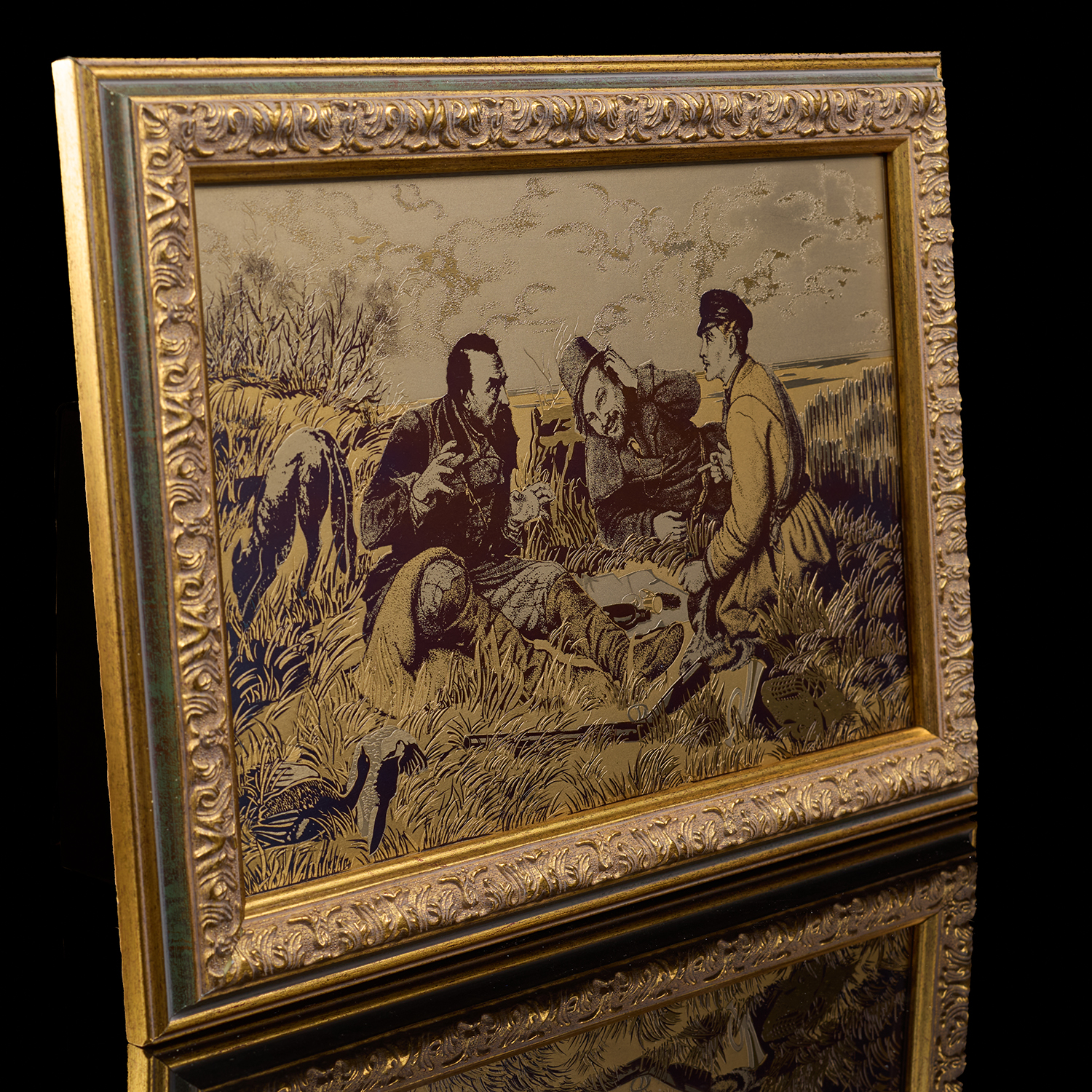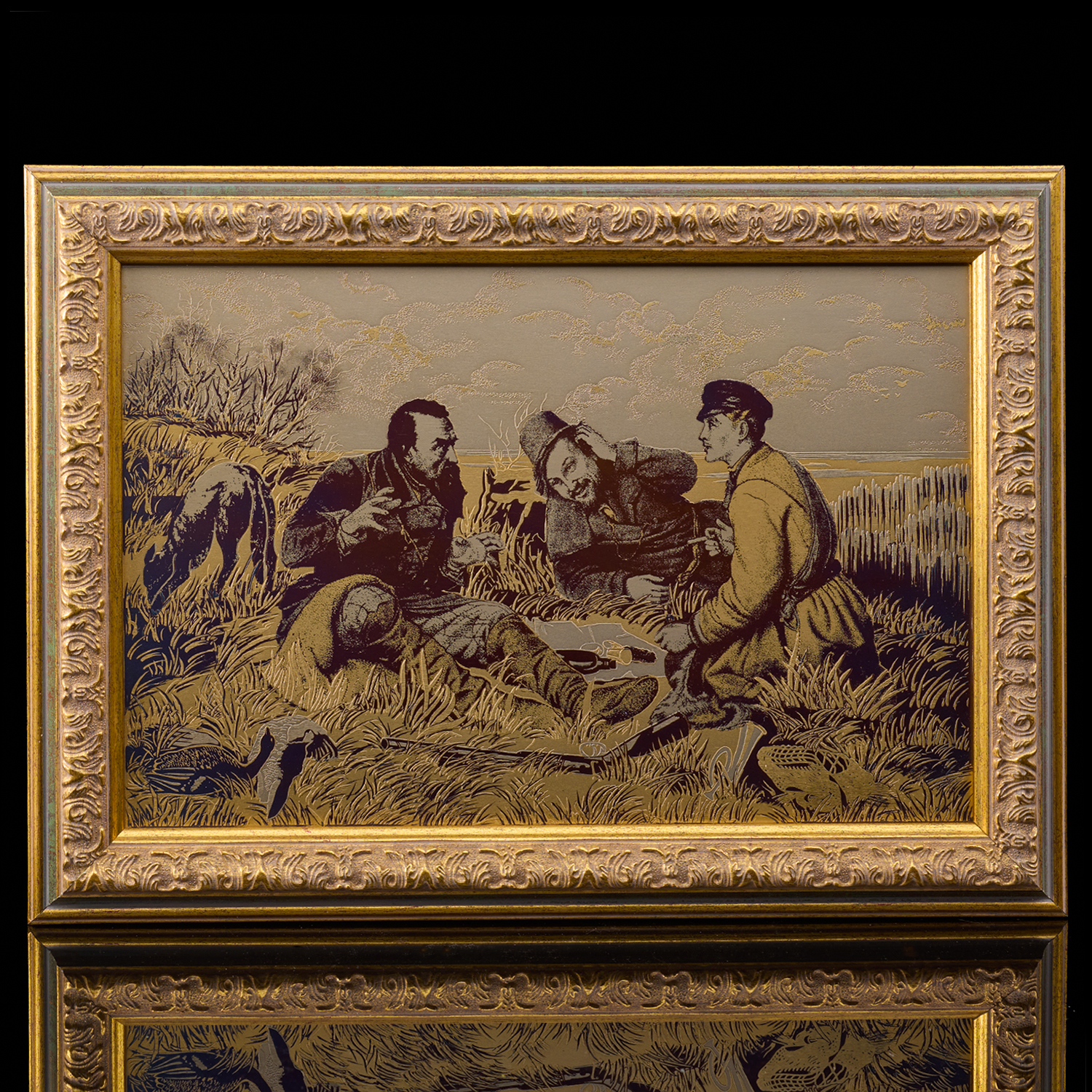 Панно-гравюра "Охотники на привале". Златоуст 36х26 см