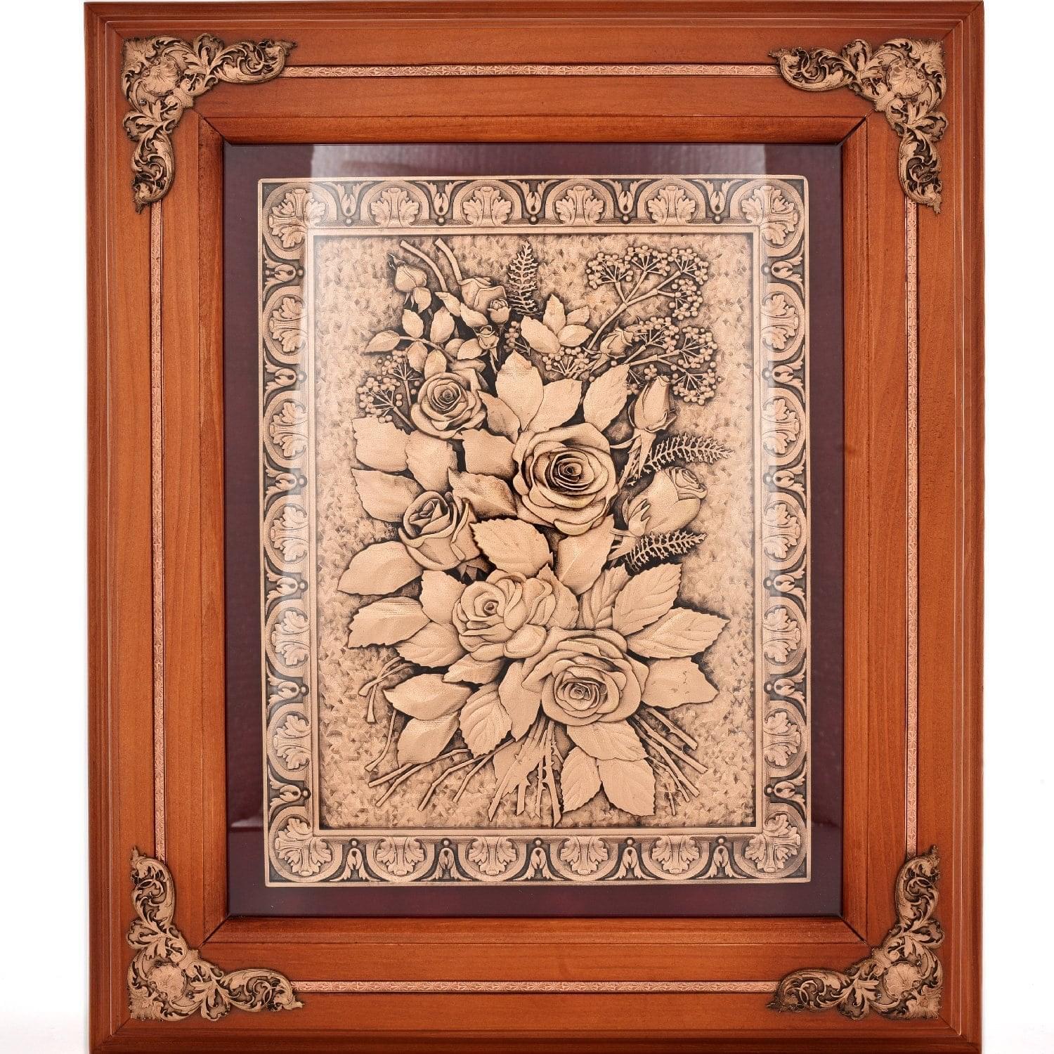 На основе из дерева ценной породы закреплена пластина из высокопробной меди с импровизированной рамой. В центре изображена барельефная композиция с цветами, которая отличается высокой детализацией. Розы - символы любви и страсти - изображены на медной поверхности в современной технике получения высокоточных оттисков под названием гальванопластика. Поверхность патинирована.