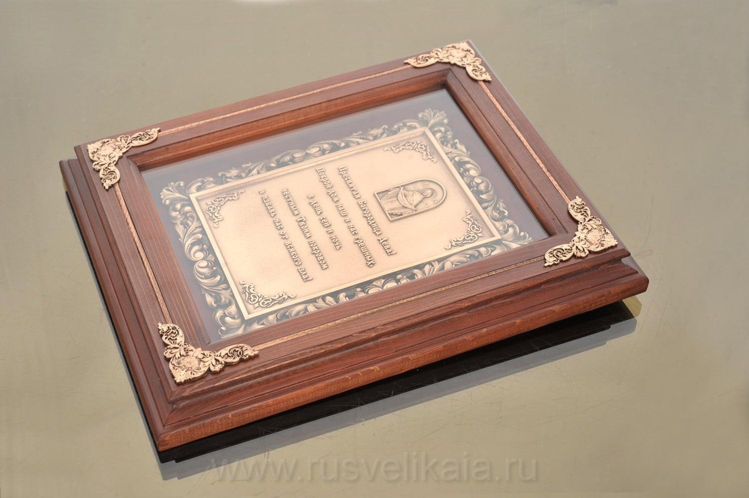 Не можете определиться с достойным запоминающимся подарком на новоселье родным и близким? Возможно, отличный вариант такого презента найдется в нашей большой коллекции панно и офортов ручной работы. Например, это великолепное панно с молитвой  и изображением Богородицы станет отличным подарком на новоселье верующему человеку  - православному христианину. Панно выполнено по эксклюзивному авторскому эскизу в технике гальванопластики. Работа отличается высокой детализацией, гармоничным сочетанием форм и линий внутри композиции. Оформлено панно в красивую раму из натурального дерева нежно-шоколадного цвета. По углам мастер декорировал раму металлическими аппликациями в виде витиеватых узоров.