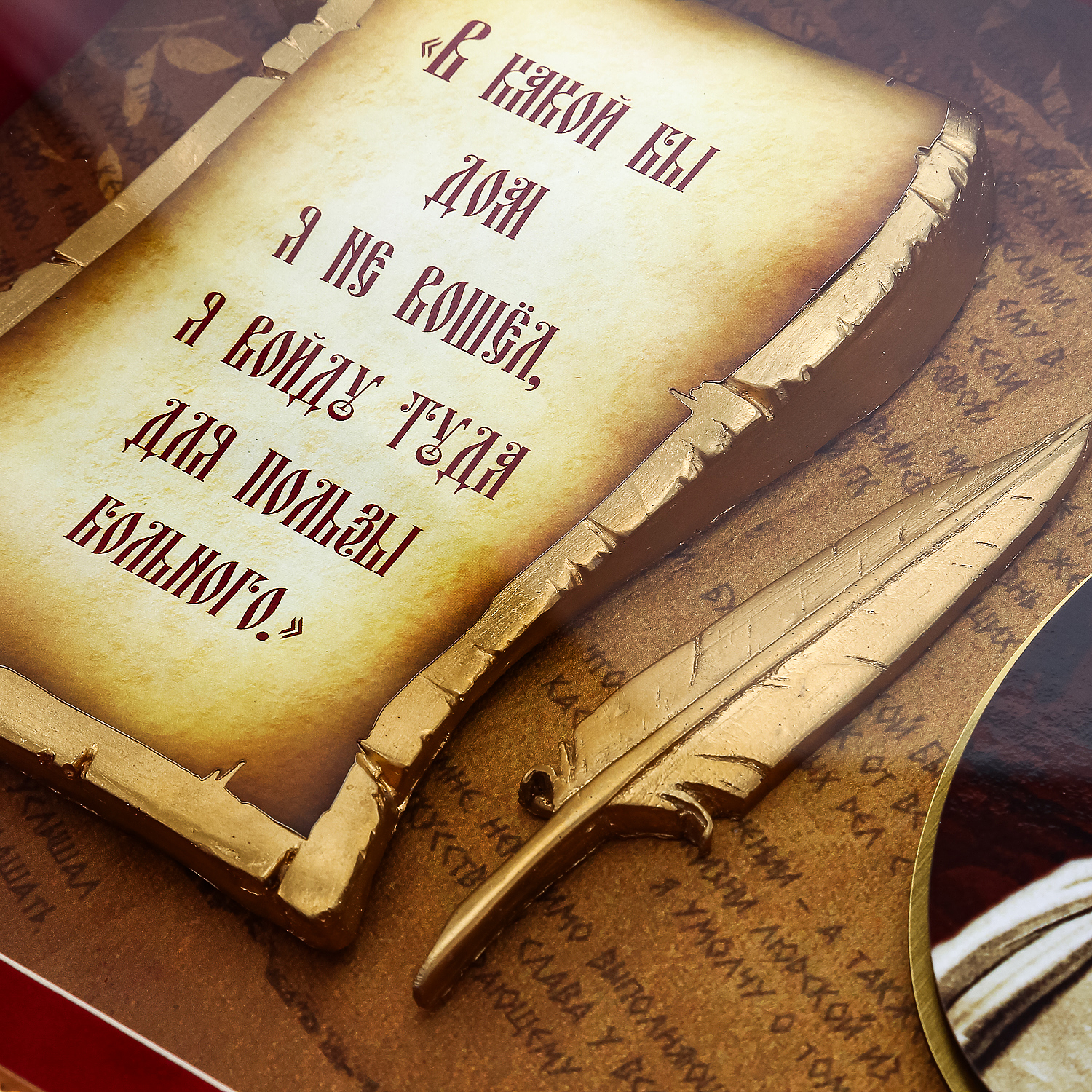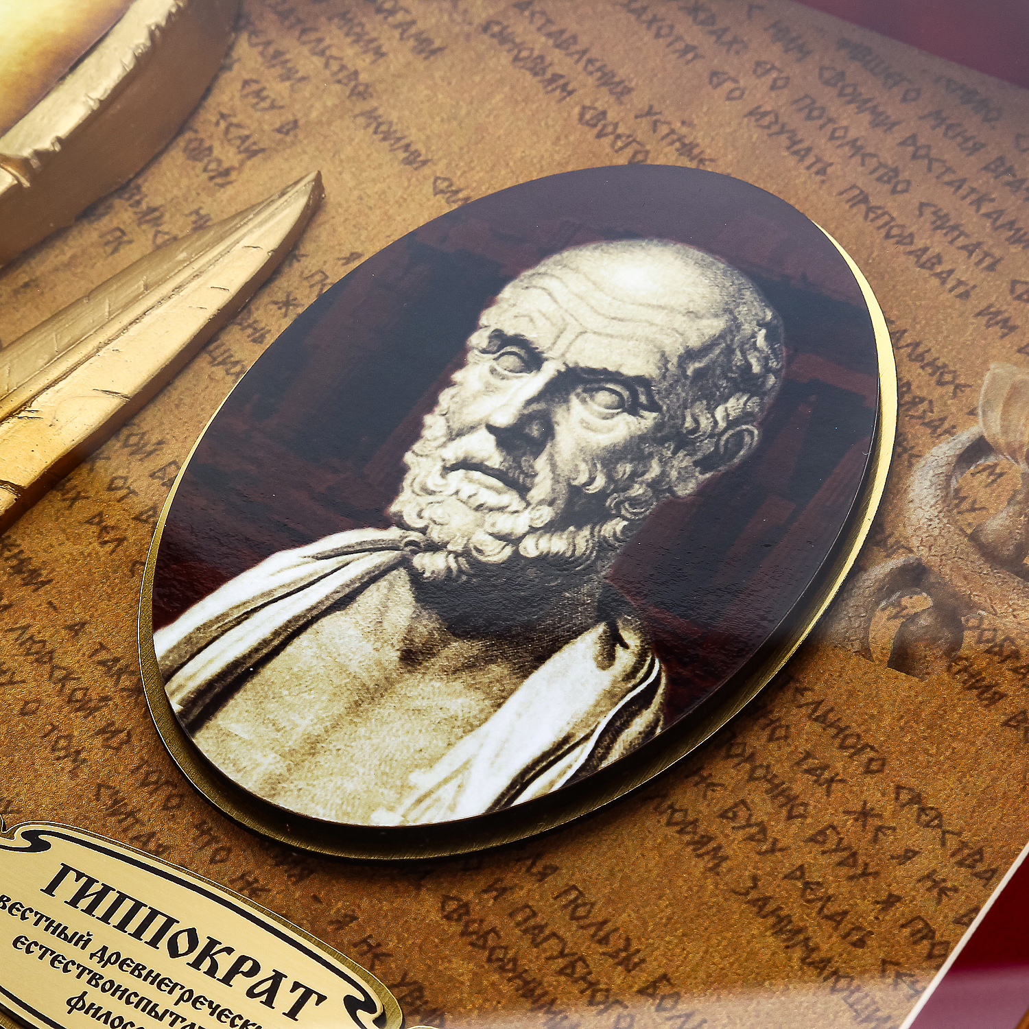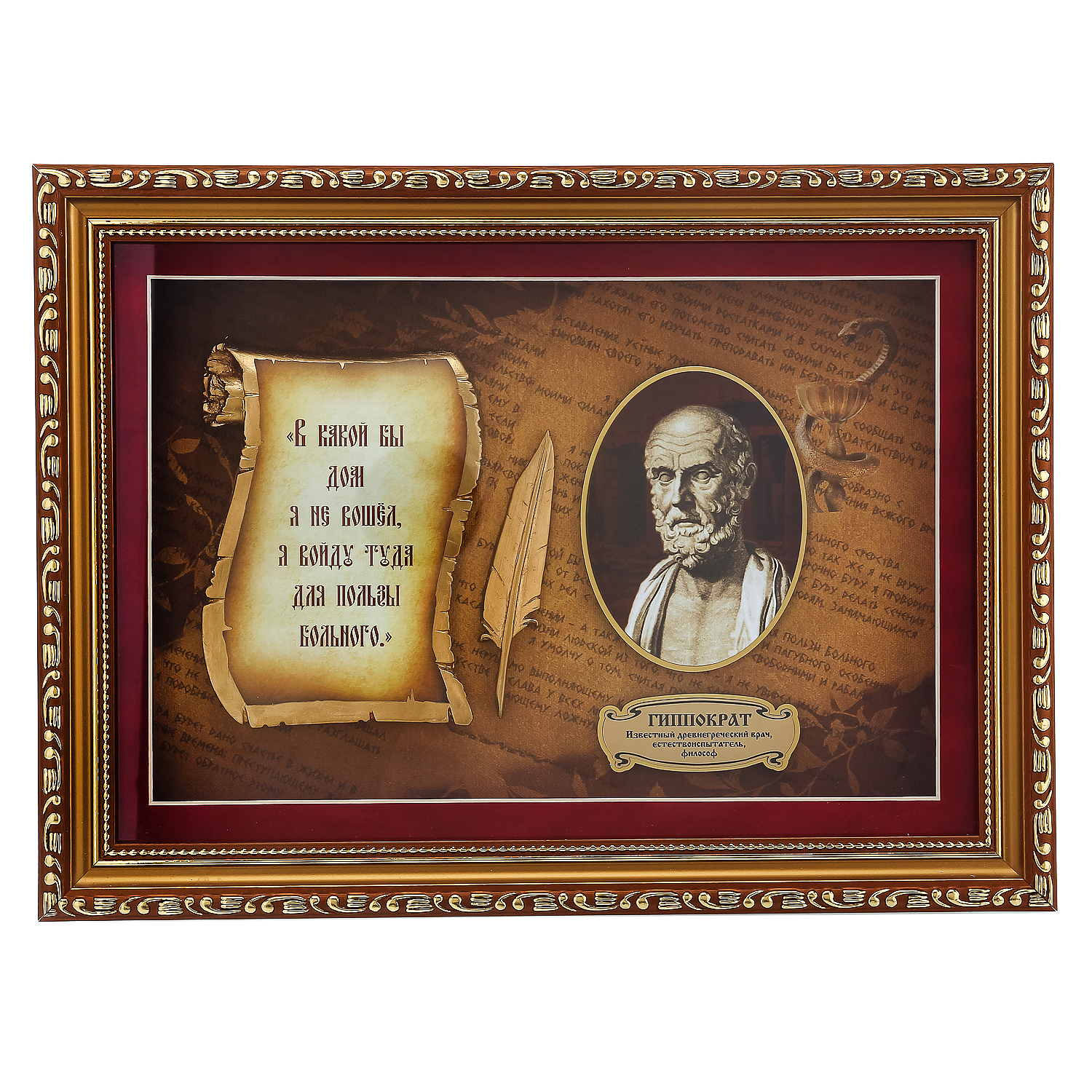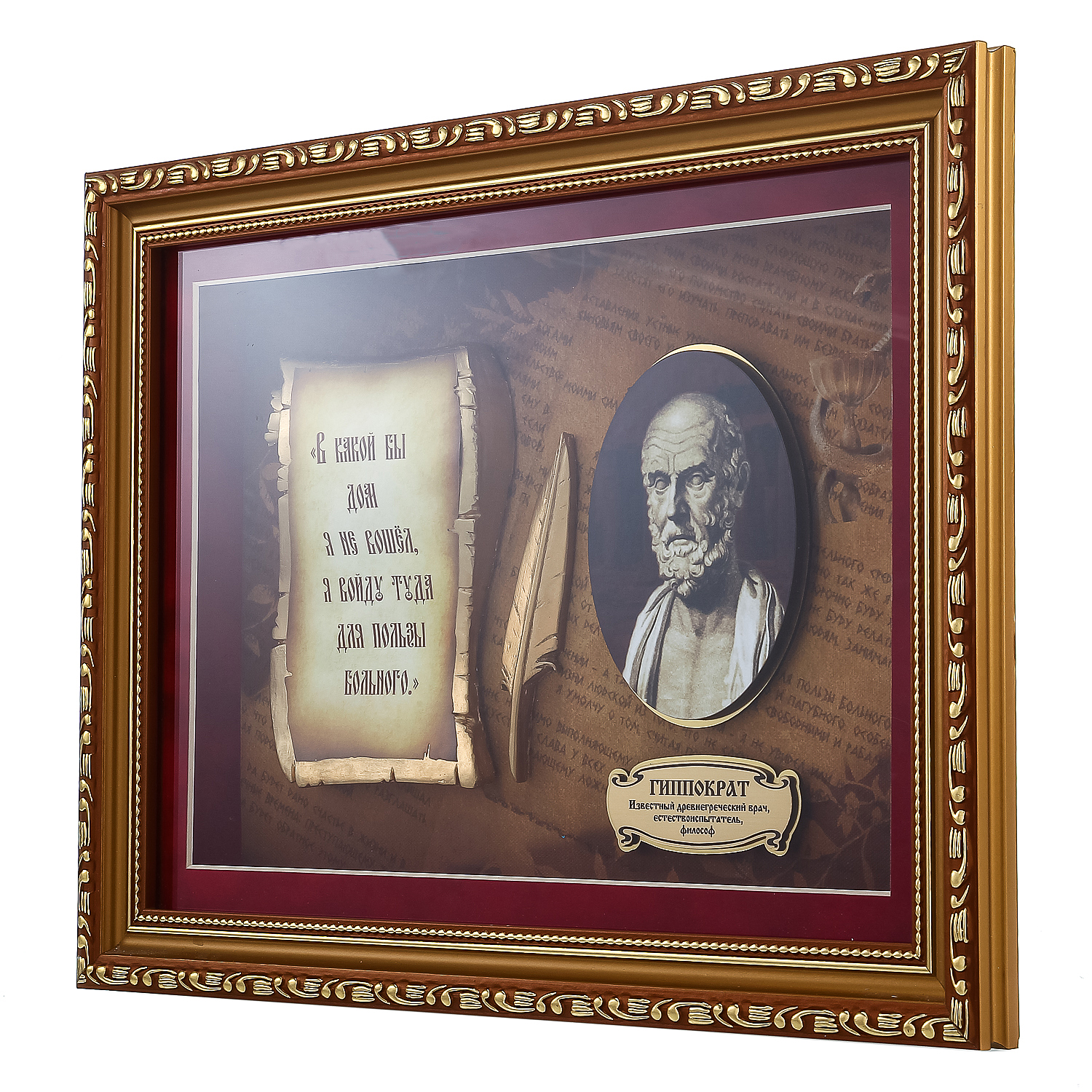 Этот образец декоративно-прикладного искусства, авторское панно  с концептуальной  композицией, в рамках которой представлен папирус  с текстом клятвы Гиппократа и образ легендарного врачевателя, обрамлено  в классическую раму  из багета.