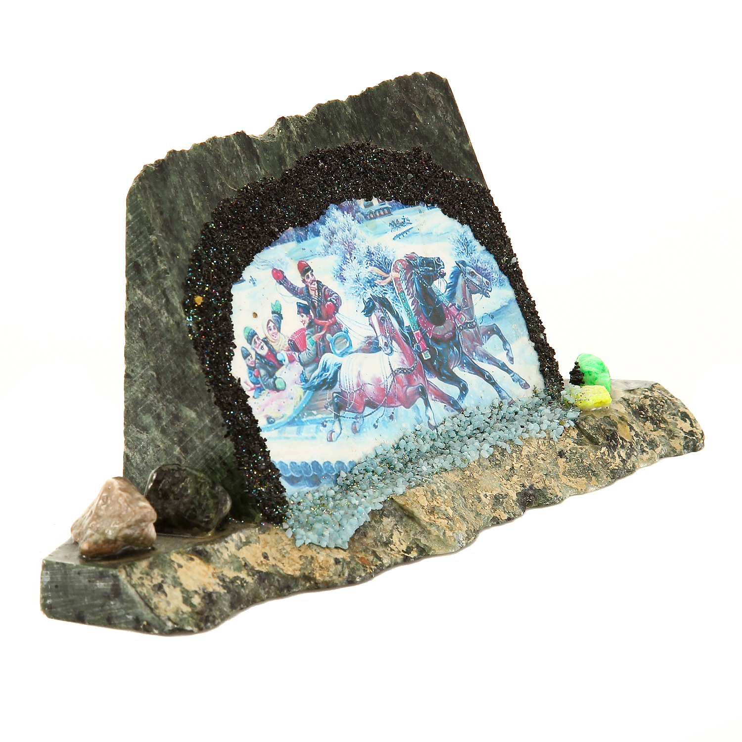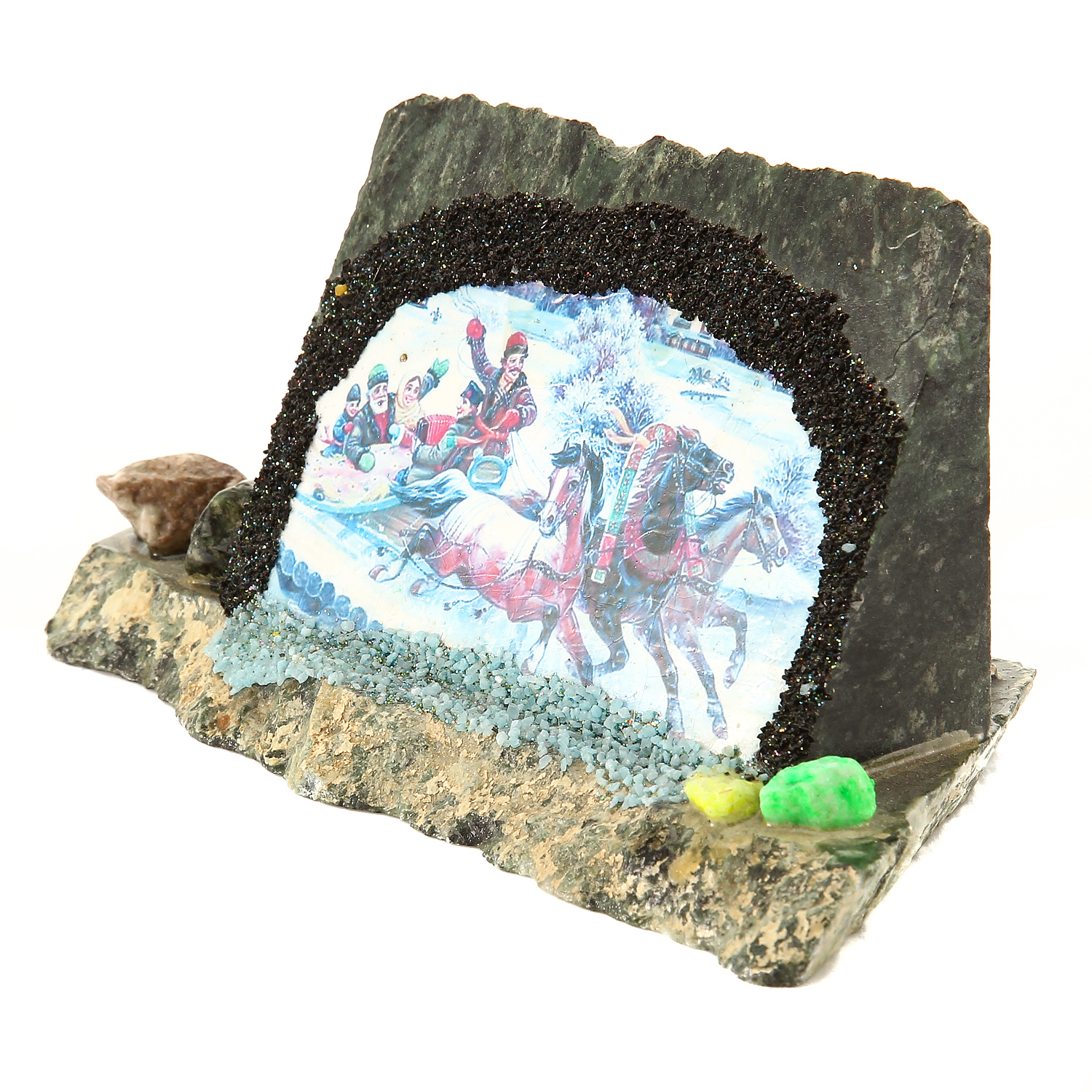 Эта авторского дизайна изделие имеет естественную форму камня. не шлифованную. Таким образом, продемонстрирована красоты поделочного материала, которая подчеркнута россыпью крошечных камушков бирюзового цвета и цвета вулканической лавы. В центре панно запечатлена сценка из русской жизни: в зимнюю стужу семья с ямщиками, одетые  в теплые русские одежды, несутся на тройке с бубенцами на празднование Нового года.