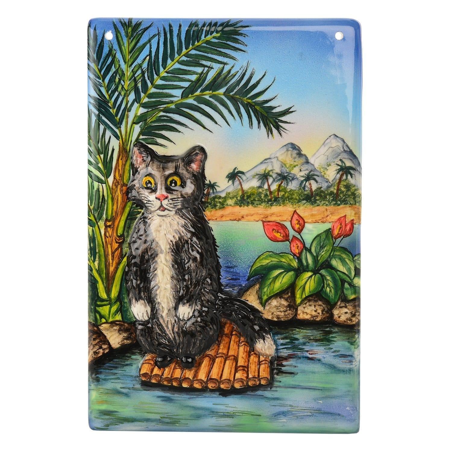 И еще одна колоритная авторская зарисовка на керамическом корпусе плакетки, которая передает лирическое настроение кота после  отдыха. Стоя на берегу водоема на фоне пальм и цветущих лилий, Серый всплакнул от нахлынувших на него ностальгических чувств о минувшей отдыхе. Чудесное украшение для интерьера детской комнаты!