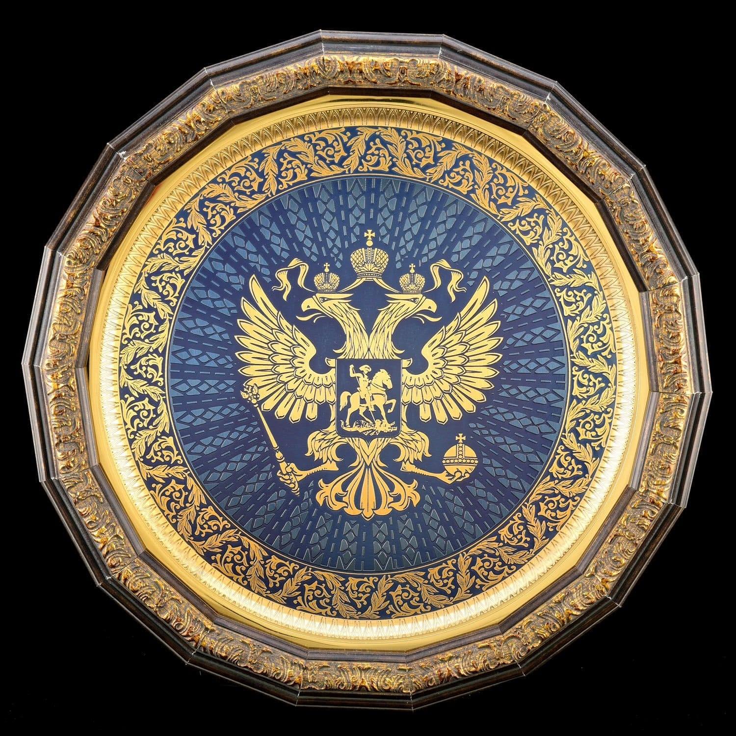 Современный герб утвержден Указом президента 30 ноября 1993 года. Впервые двуглавый орел в качестве государственного символа Русского государства встречается на оборотной стороне государственной печати Ивана III Васильевича в 1497 году, хотя изображения двуглавого орла (или птицы) встречались в древнерусском искусстве и на тверских монетах и раньше. В 1672 году был составлен первый русский гербовник «Титулярник». Двуглавый орел (без всадника на груди) именовался гербом «Московским». Цвет орла в допетровскую эпоху был в основном золотым, хотя использовался и черный. Герб Российской империи один из самых сложных гербов за всю историю государств мира. Окончательно сформировался в 1883 году. Автор наиболее распространенного изображения герба Российской Федерации - народный художник Евгений Ухналев. Эксклюзивная работа мастеров Златоуста Гравировка, травление, золочение, никелирование, синение. Размер: диаметр 36 см. Работа защищена специальным лаком. ....
