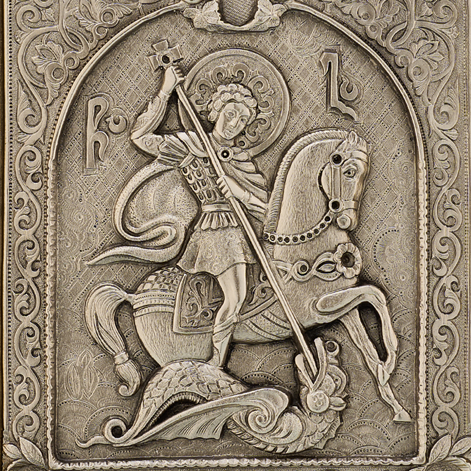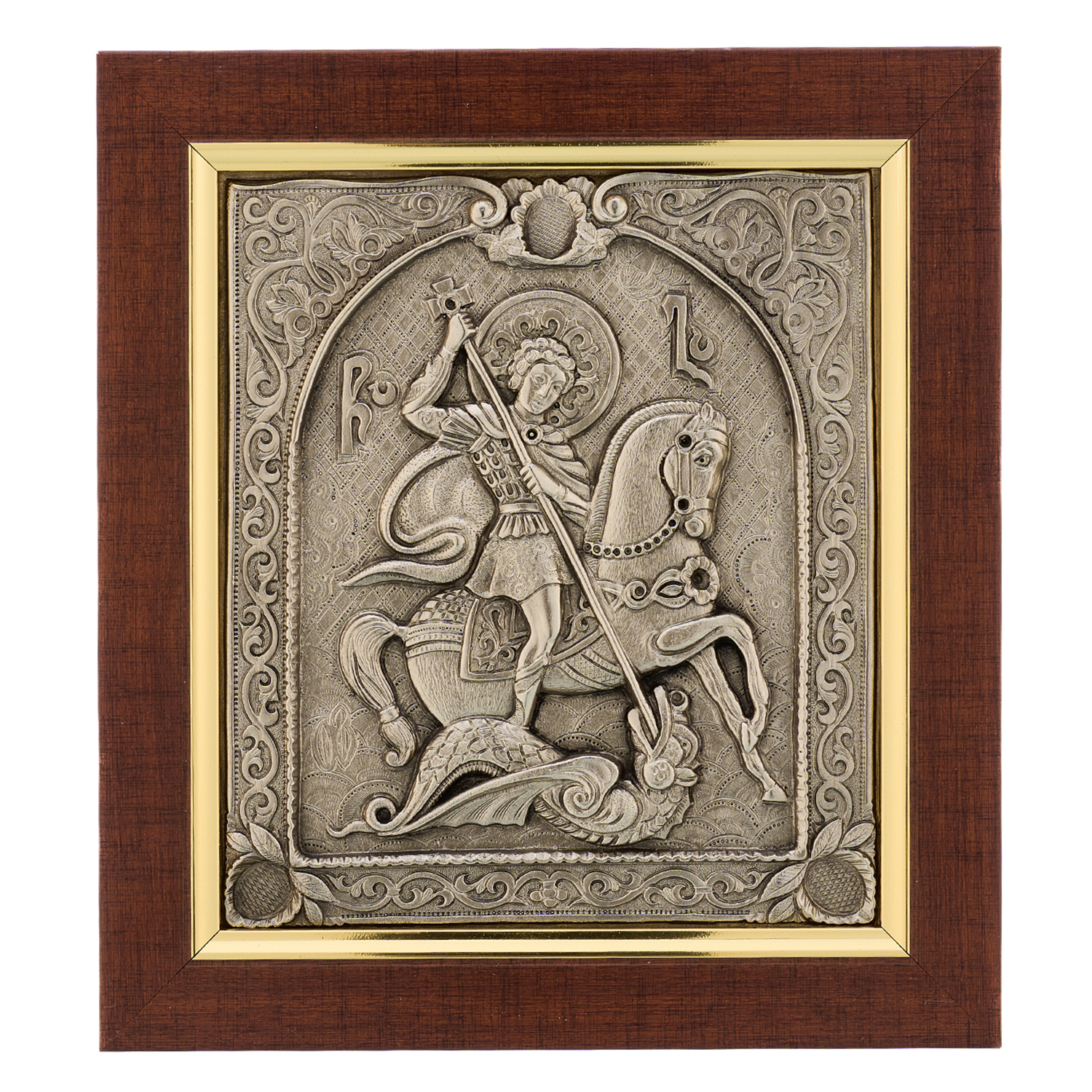 Плакета "Георгий Победоносец".Материалы: гальванопластика (медь, серебрение), дерево.