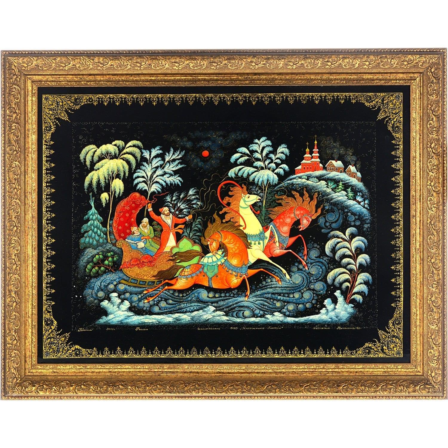 Теперь, когда Вы знаете историю лаковой миниатюры, обратите внимание, что перед Вами - полуметровое панно из папье-маше с художественной композицией и сказочным образом тройки. Образ летящей тройки лошадей - один из символов России и ее пути. Помните? "Русь, куда ж несешься ты? дай ответ..." - писал Гоголь, взывая именно к этому образу, который издавна используют в своем творчестве другие писатели и живописцы.