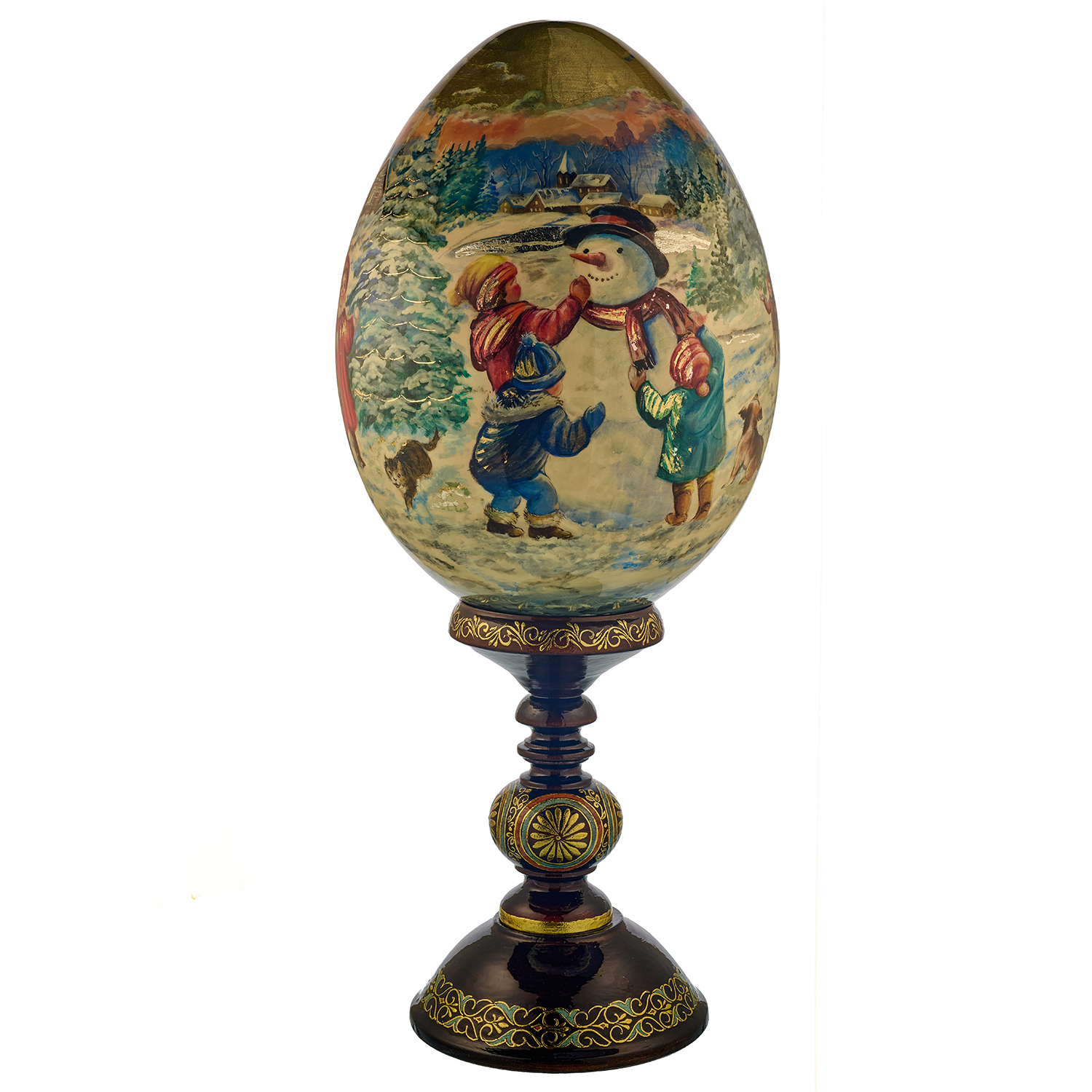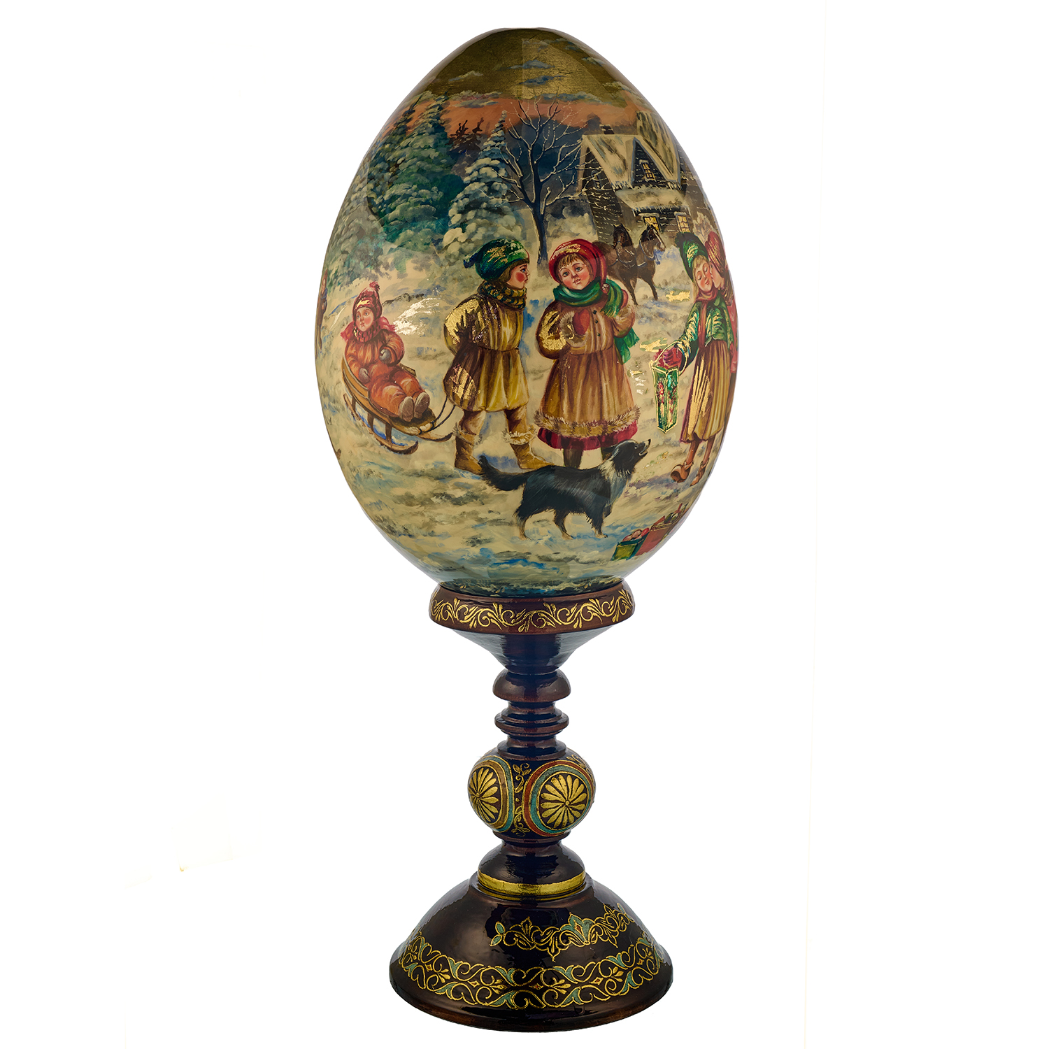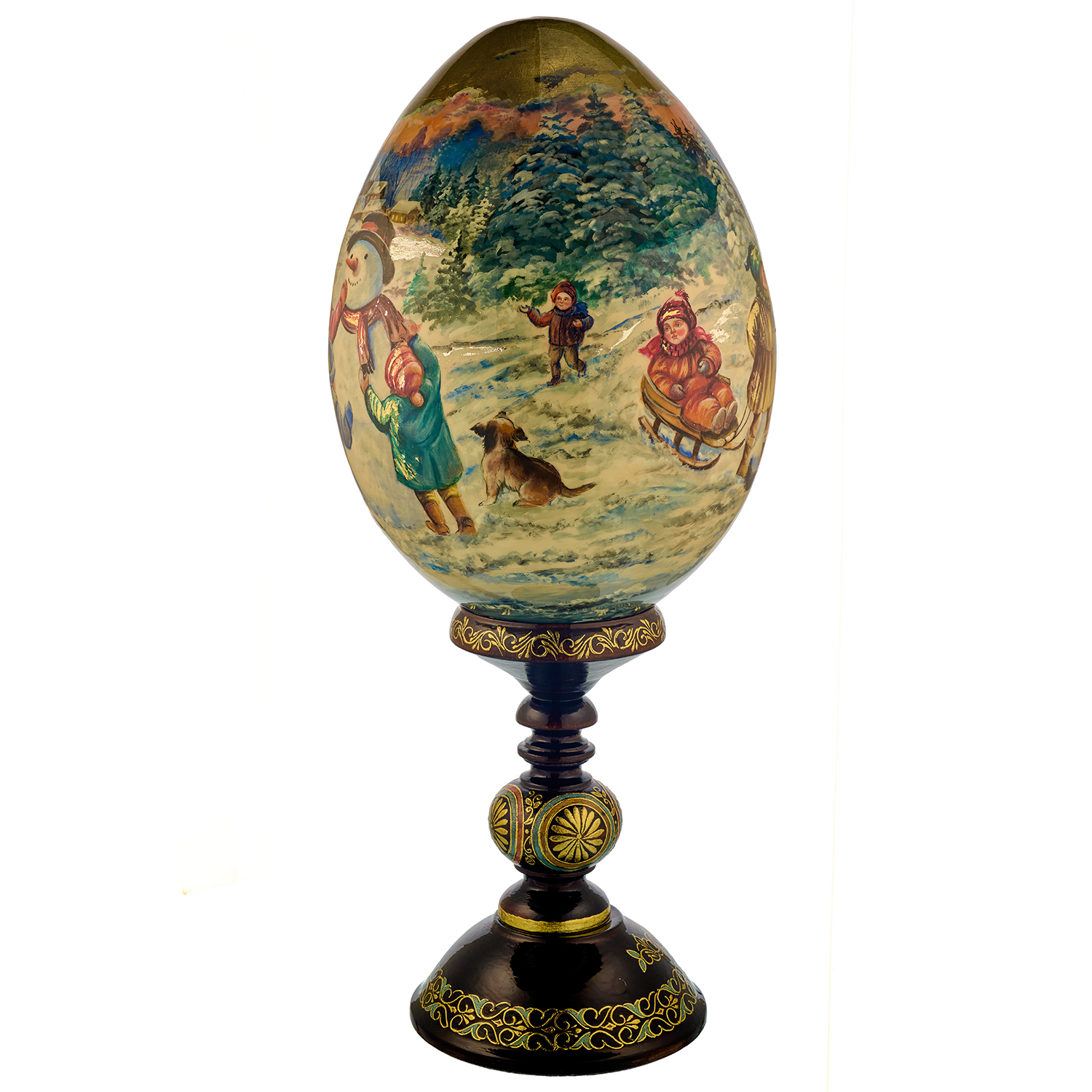 Пасхальное яйцо на подставке "Зимние забавы".Материалы: дерево, краски, лак.