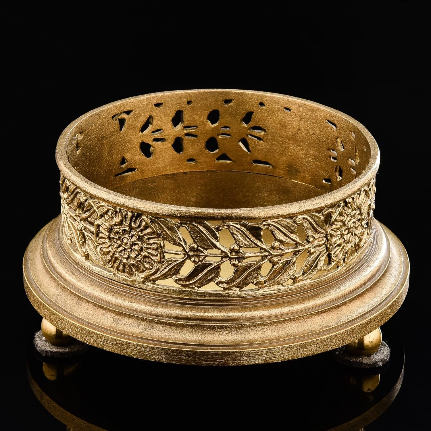 Винная передача выполнена в виде изящной «плетеной» корзинки из экологически чистой патинированной бронзы. Изделие создано методом художественного литья по оригинальному авторскому эскизу. Особого внимания без сомнения заслуживают детально проработанные борты «корзинки» - мастера детально отчеканили каждый элемент. В итоге борты передачи стали похожи на плетеный забор с орнаментальным рисунком.