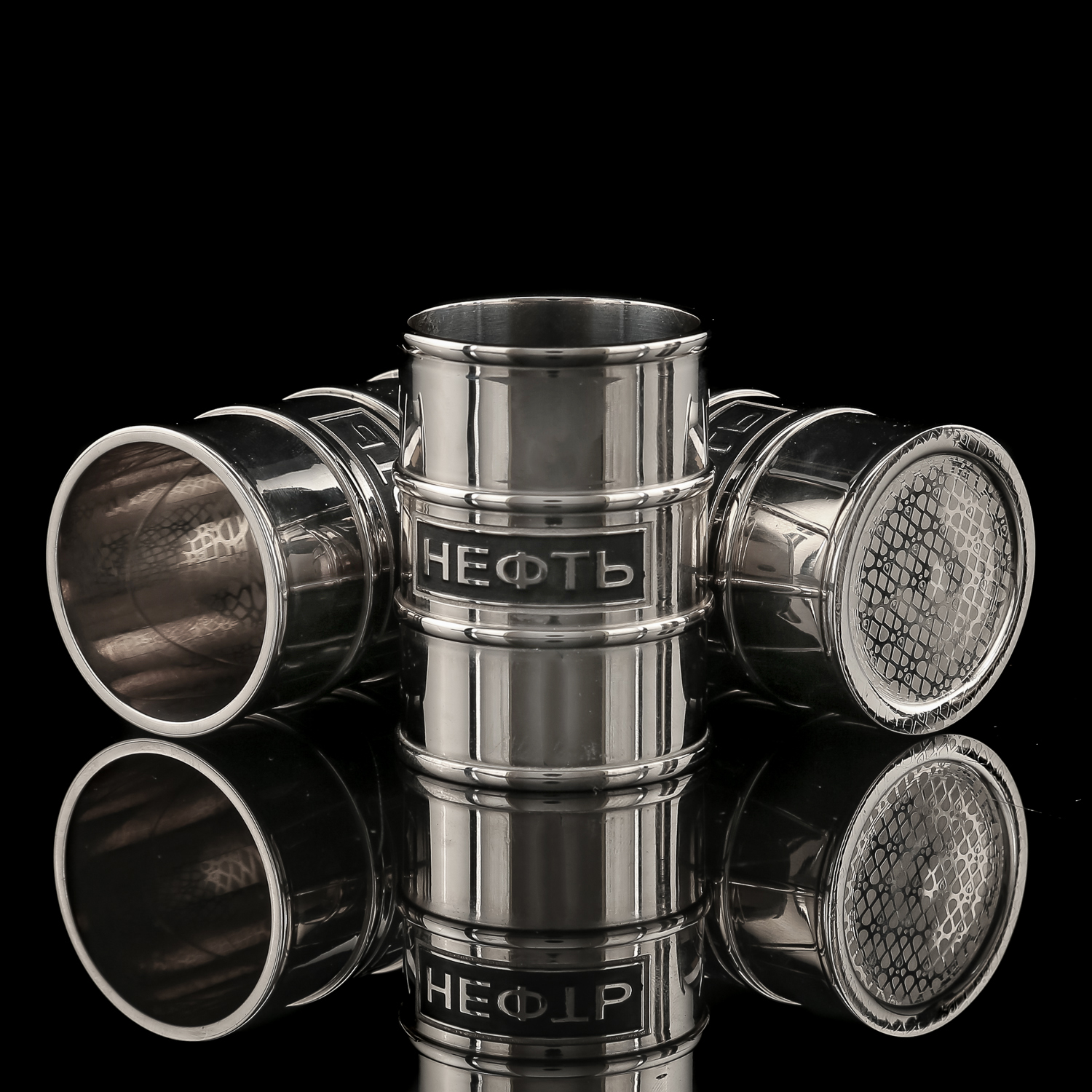 Питейный набор на 3 персоны "Нефть". Златоуст.Материалы: латунь, серебрение, эмаль.