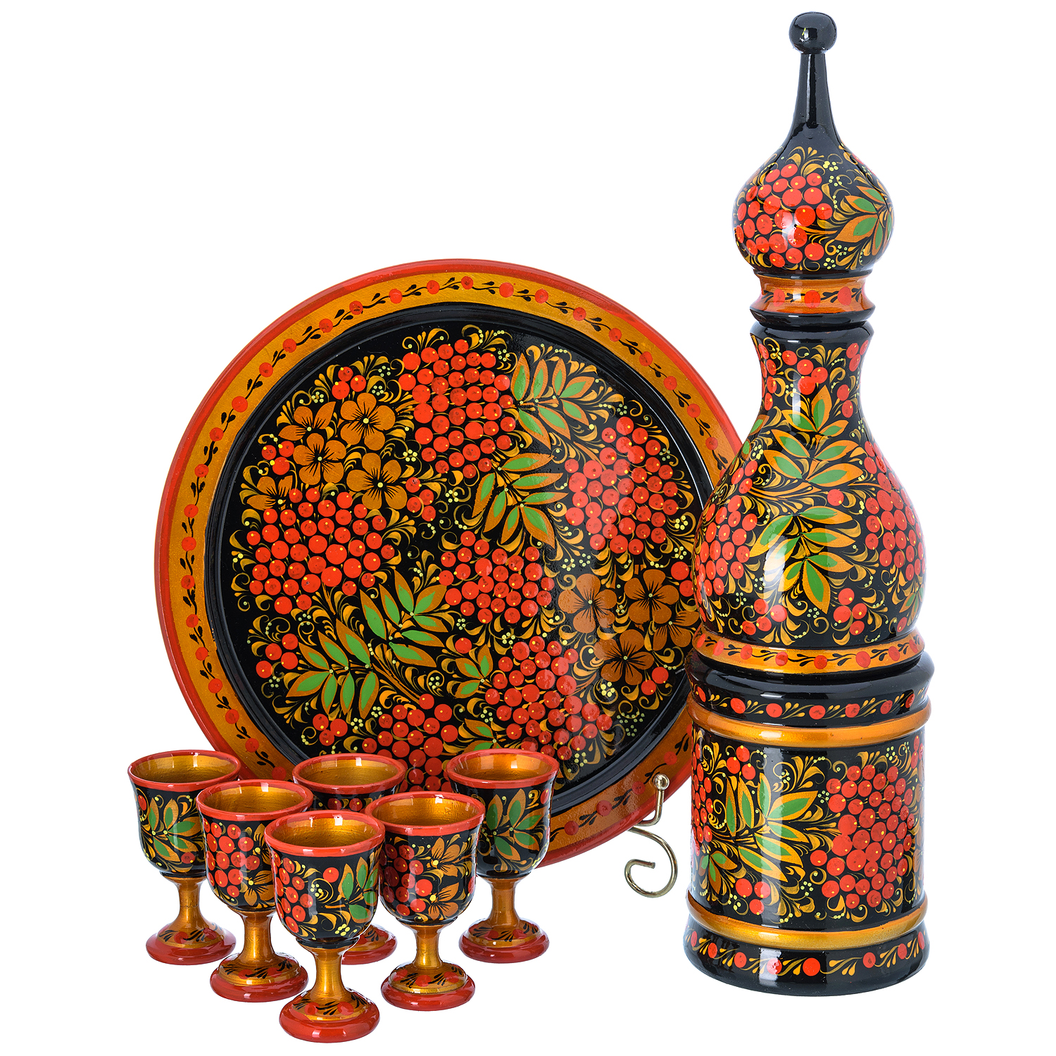 Русские подарки и сувениры → Посуда → Питейные наборы → Питейный водочный набор на 6 персон "Рябина". Хохлома