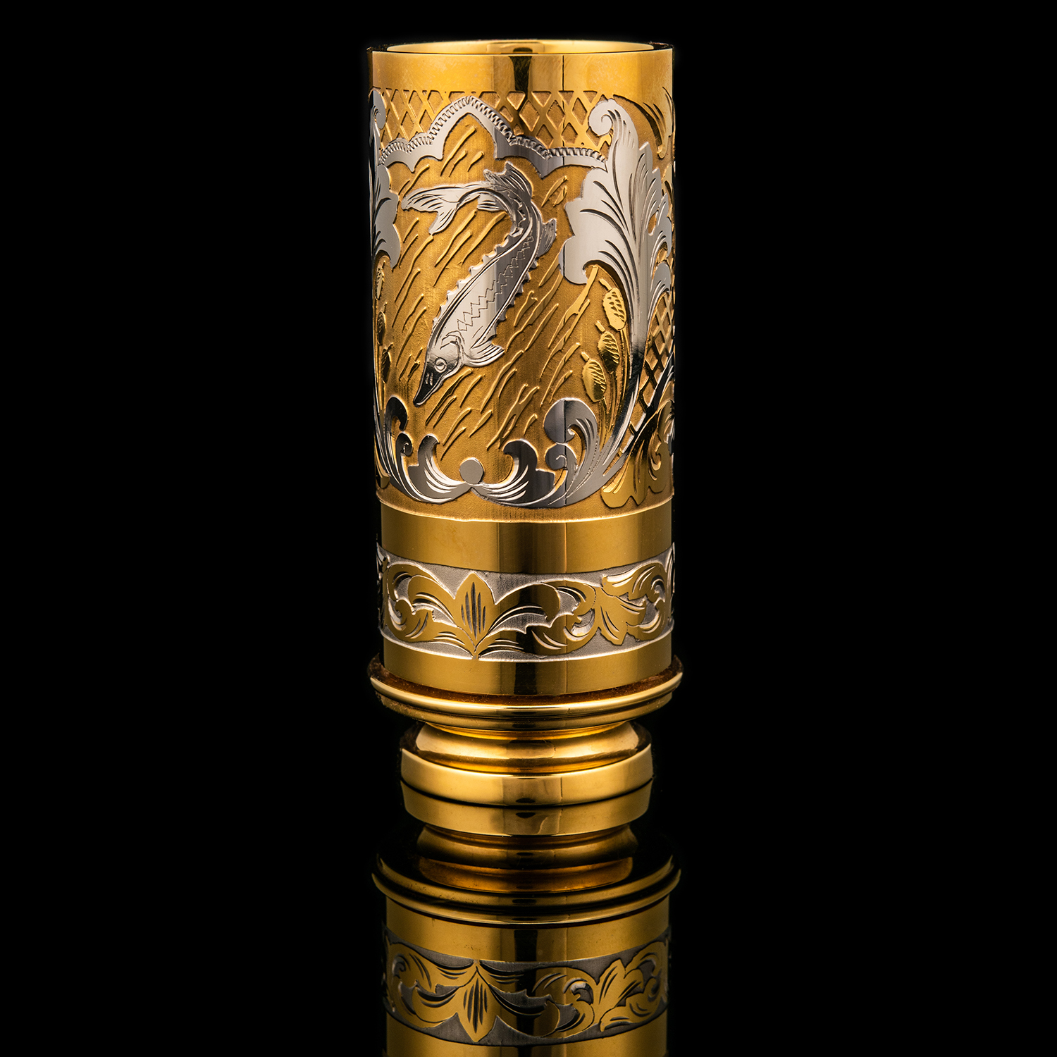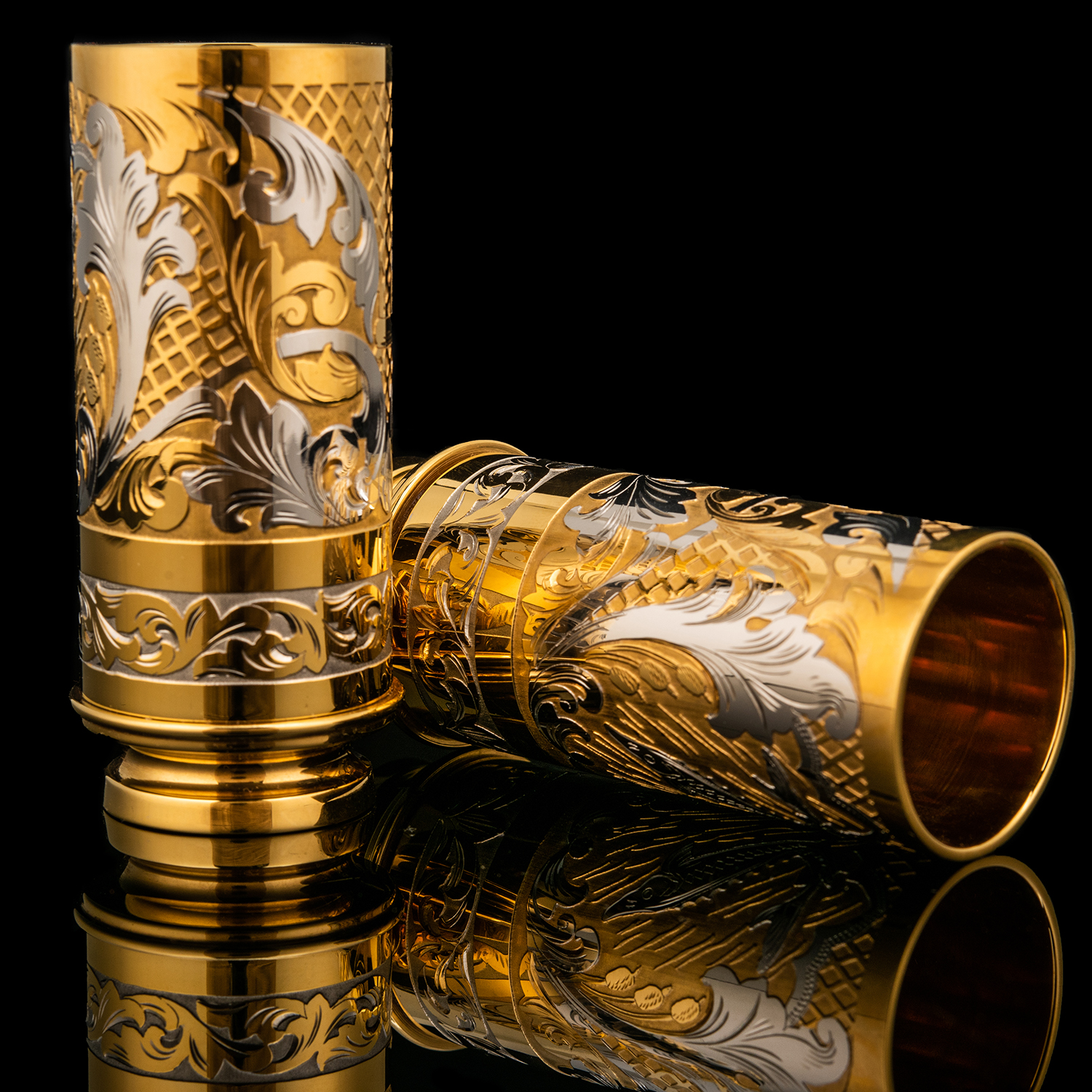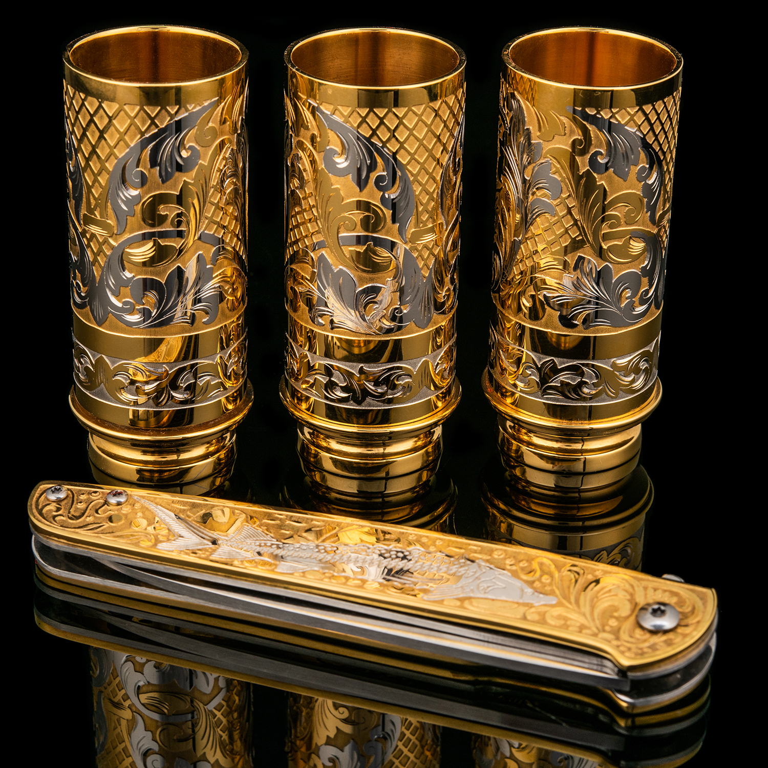 Питейный набор со стопками и ножом "Гильзы". Златоуст.Материалы: сталь, латунь, никель, золото 999,9*.