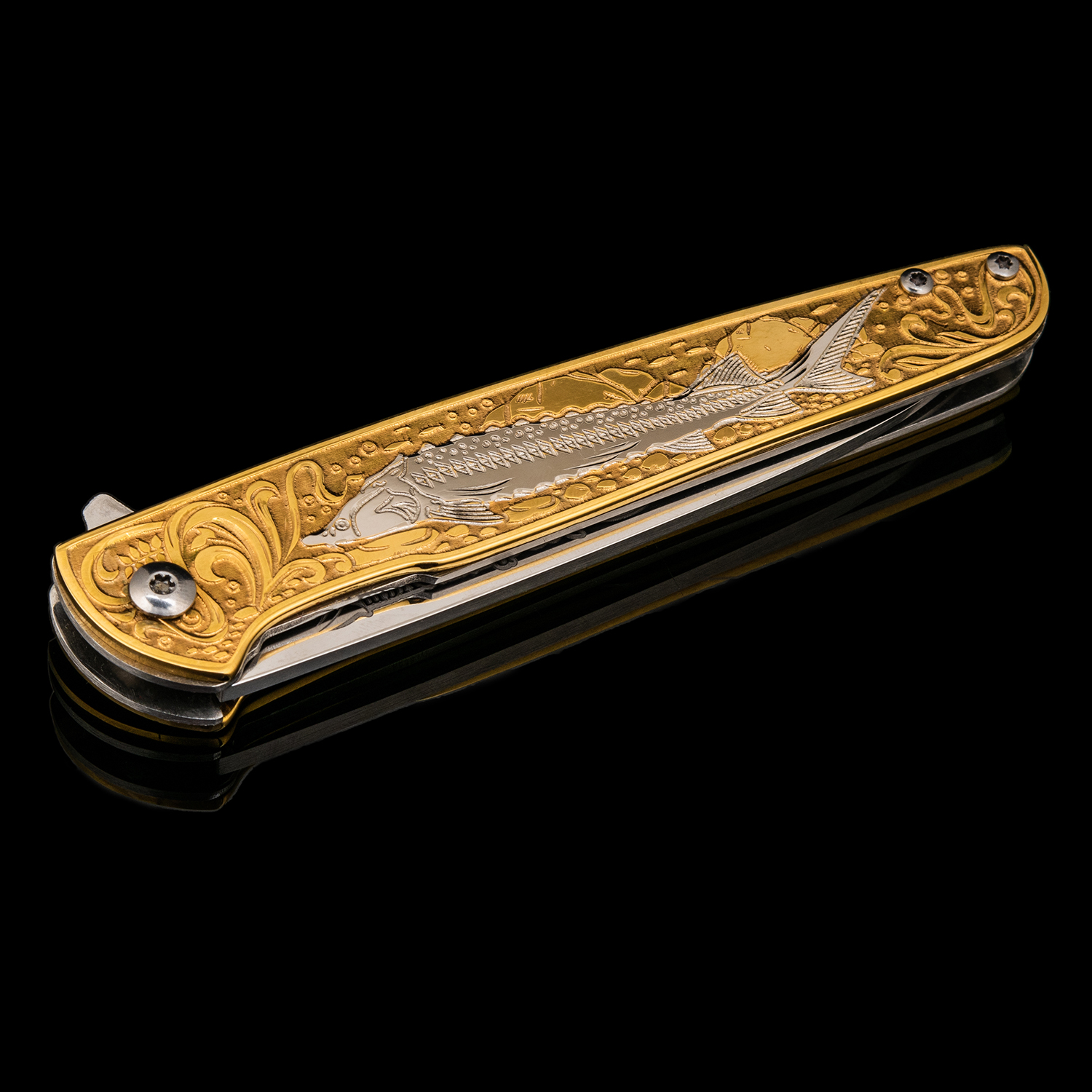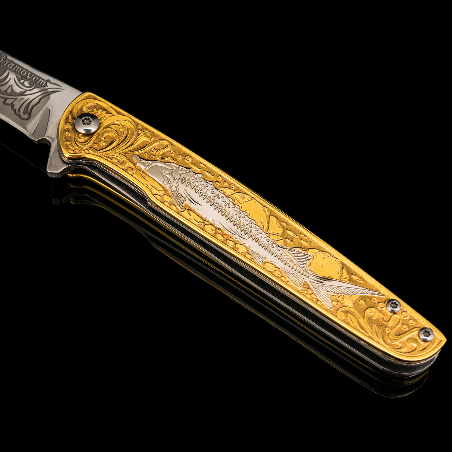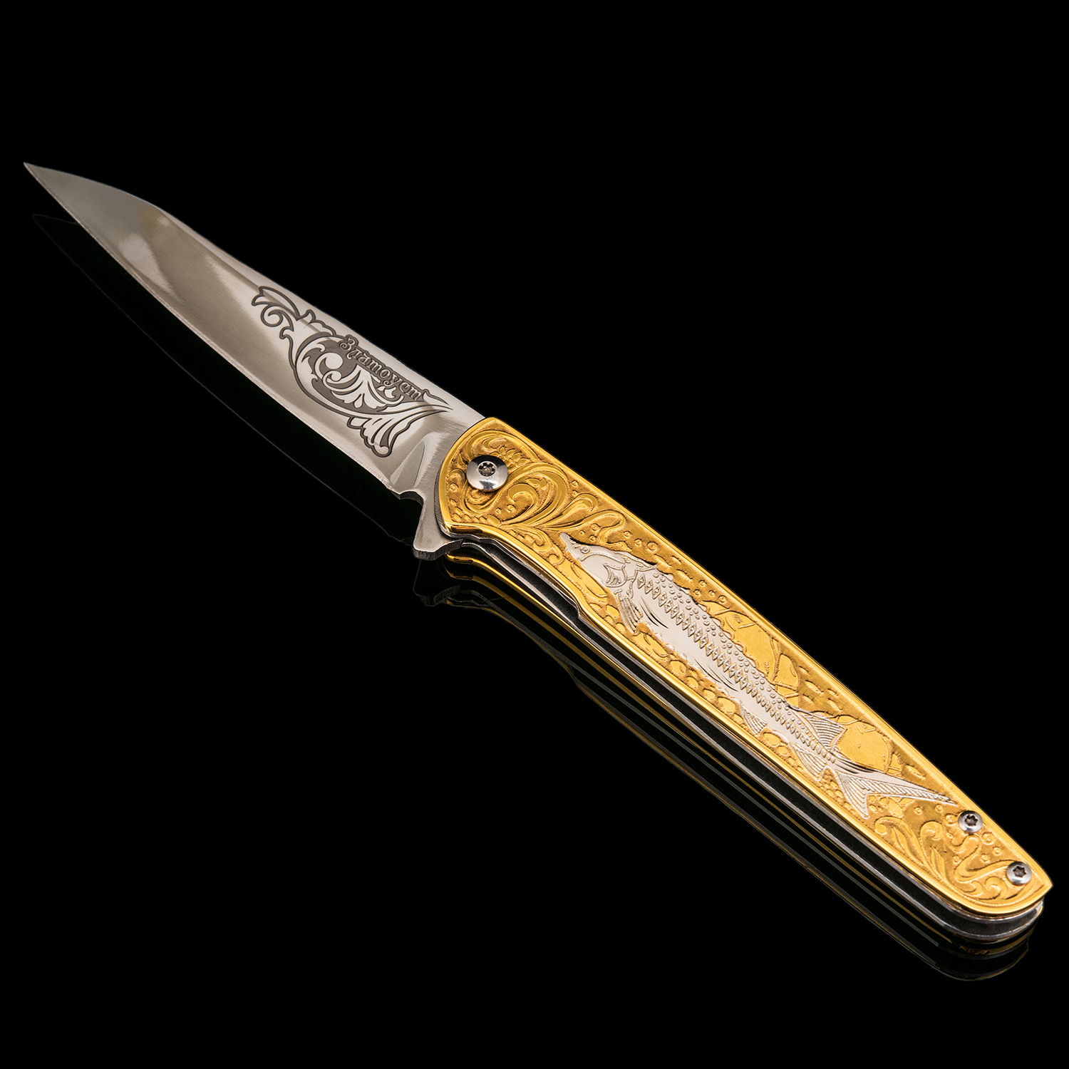 Питейный набор со стопками и ножом "Гильзы". Златоуст.Материалы: сталь, латунь, никель, золото 999,9*.