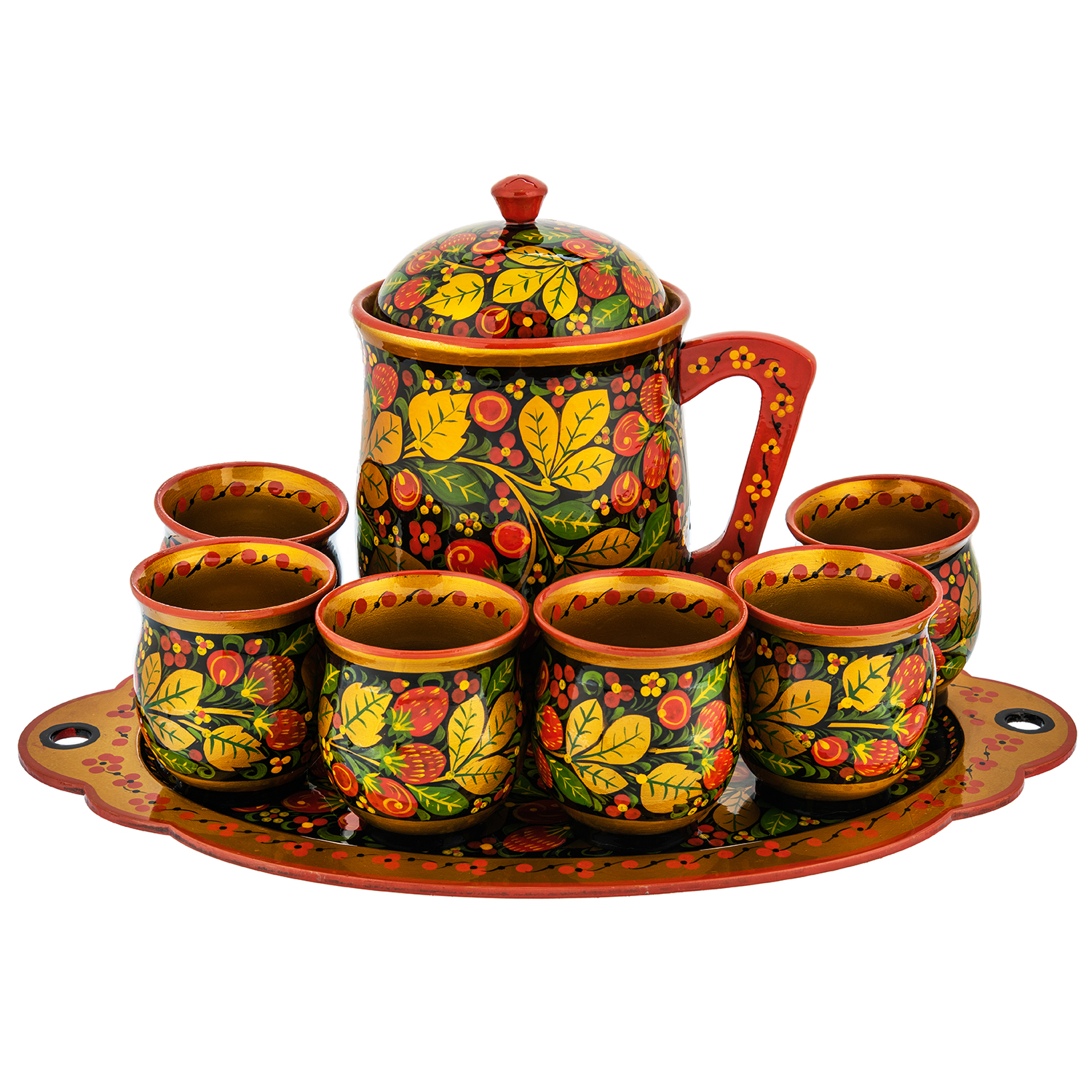 Русские подарки и сувениры → Посуда → Питейные наборы → Питейный набор для кваса "Клубника". Хохлома
