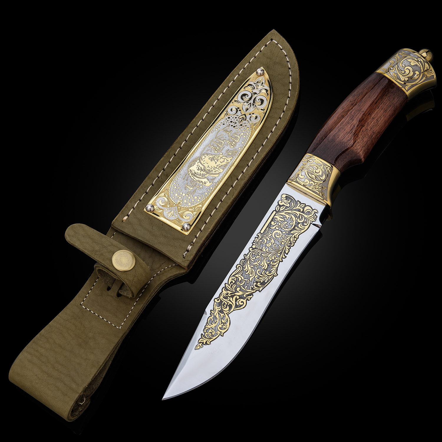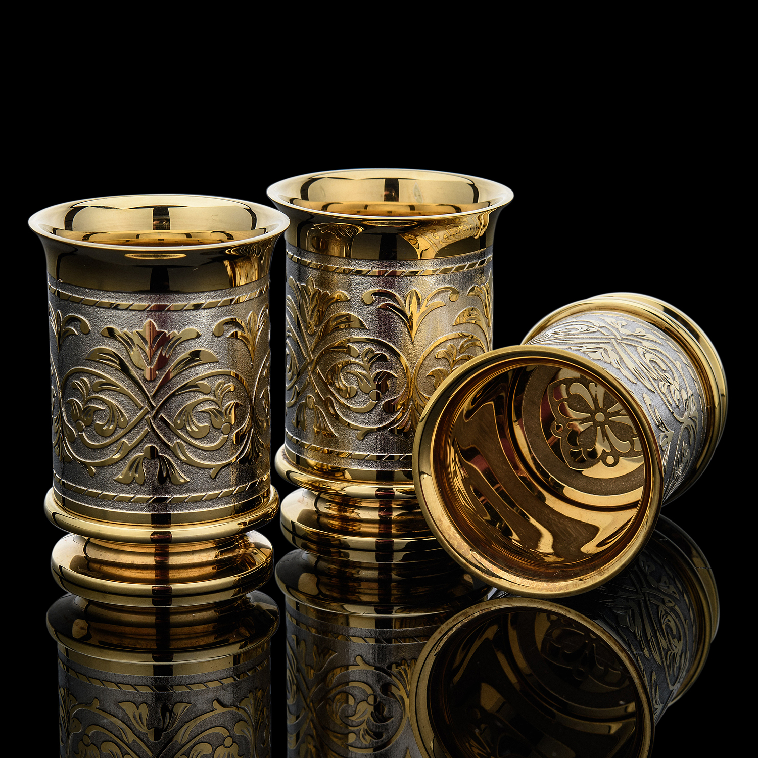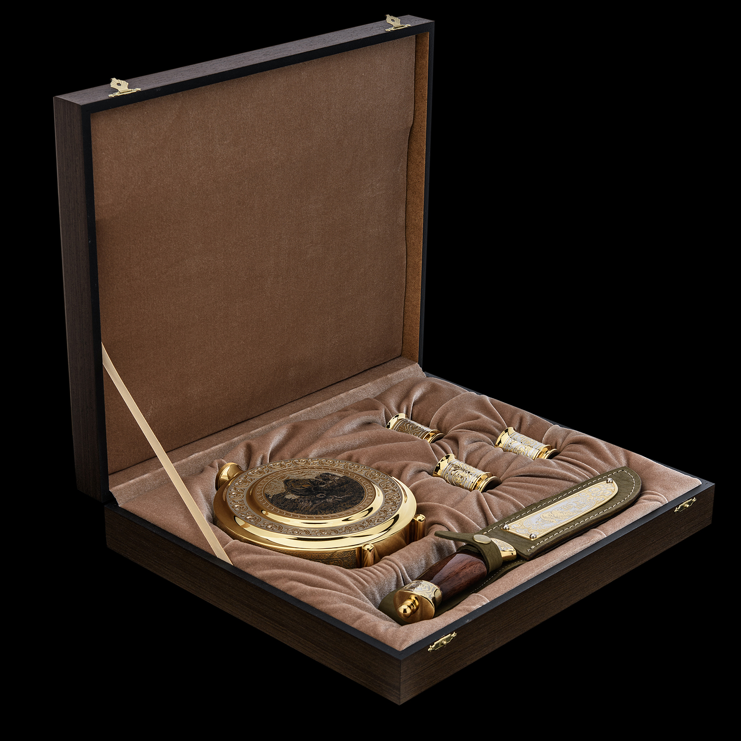 Питейный набор с флягой "Охотничий". Златоуст.Материалы: латунь, никель, золото 999,9*, чернение, сталь, дерево.