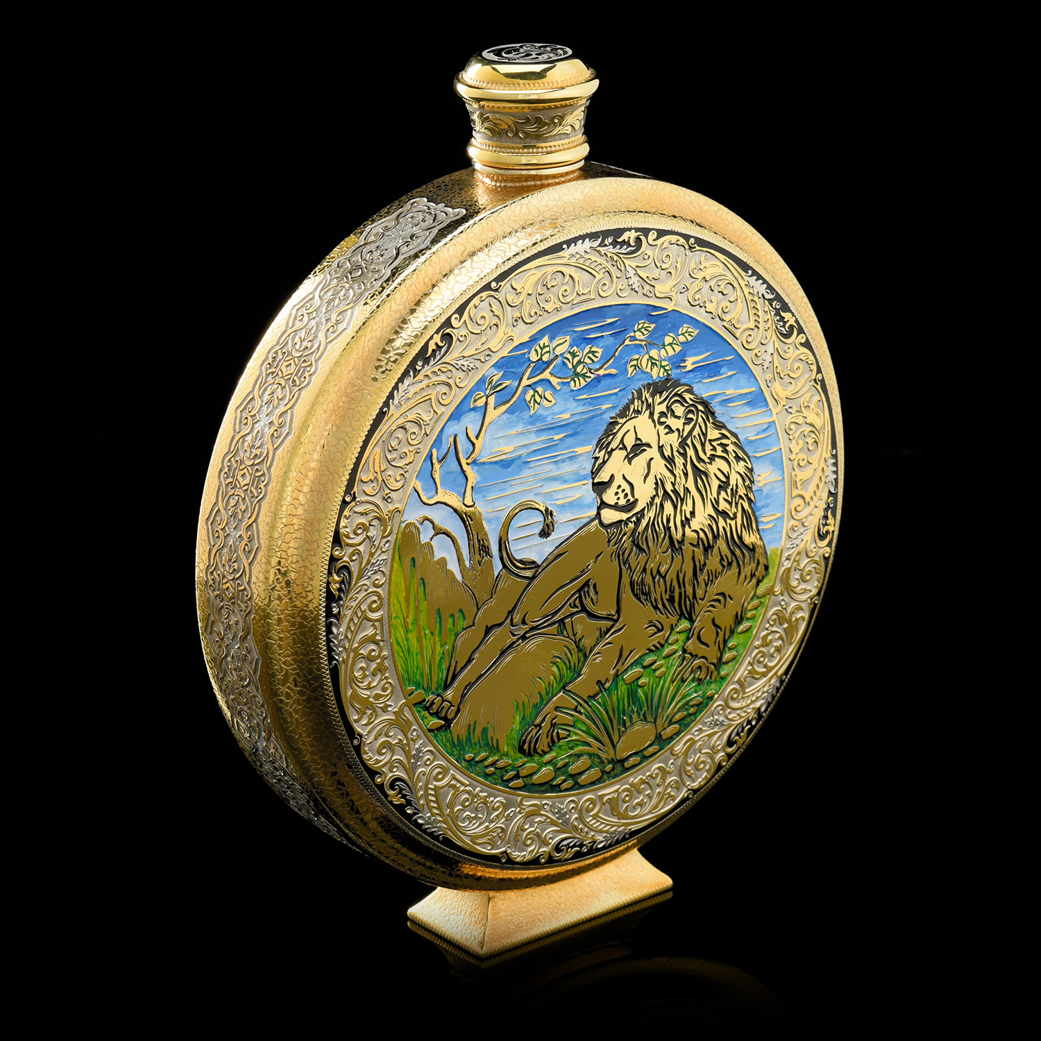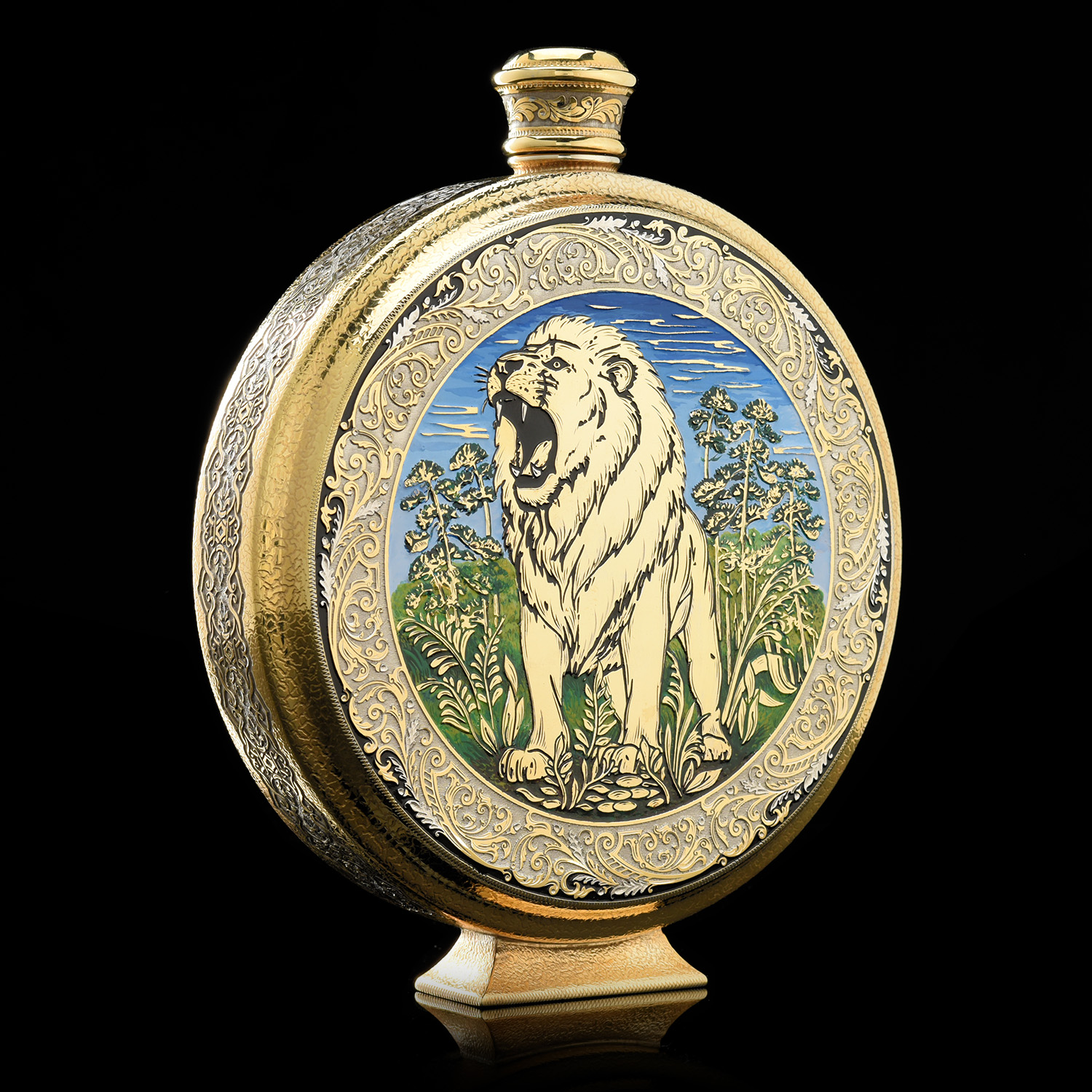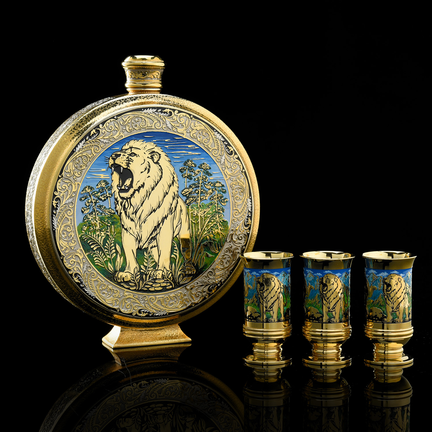Питейный набор с флягой и стопками "Лев". Златоуст.Материалы: латунь, никель, золото 999,9*, эмаль.