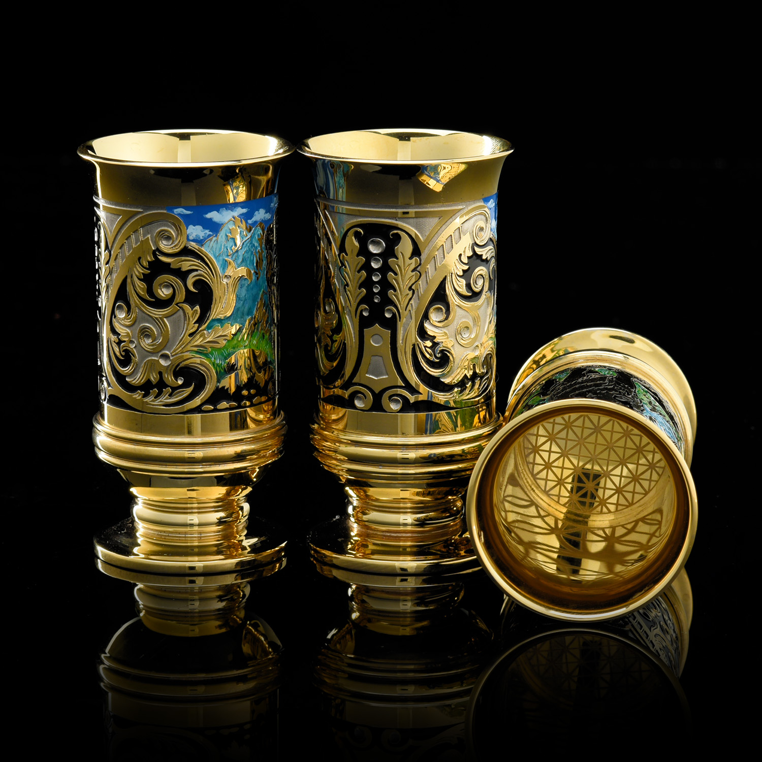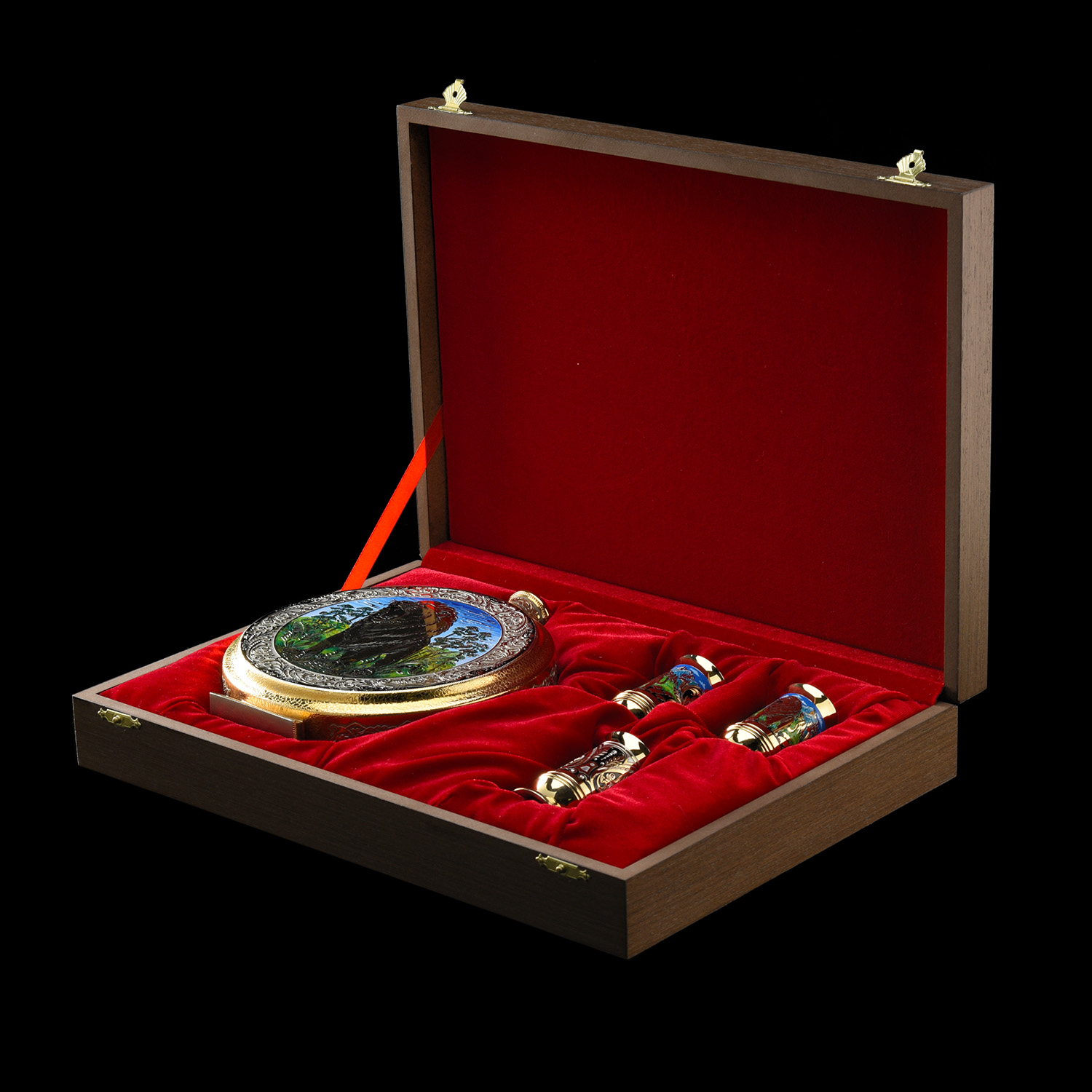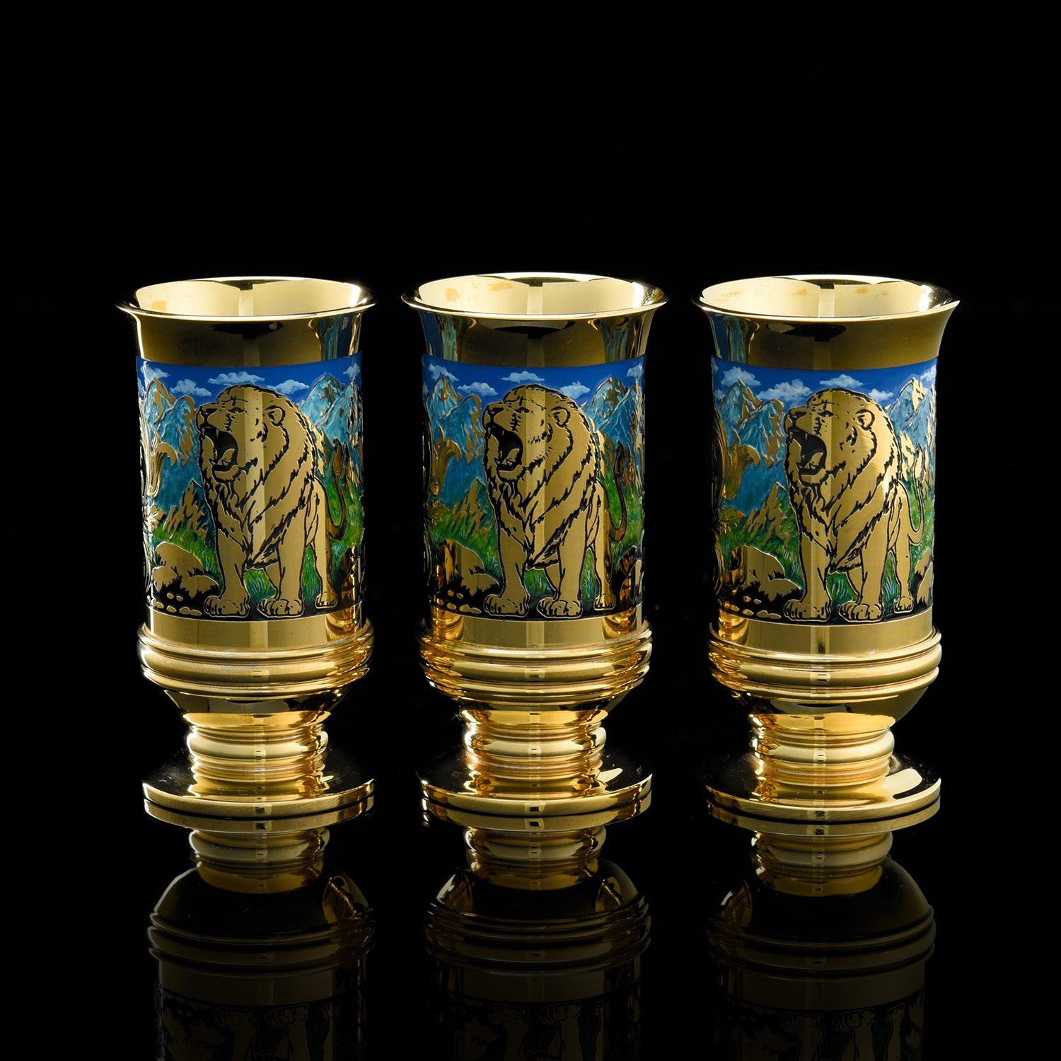 Питейный набор с флягой и стопками "Лев". Златоуст.Материалы: латунь, никель, золото 999,9*, эмаль.