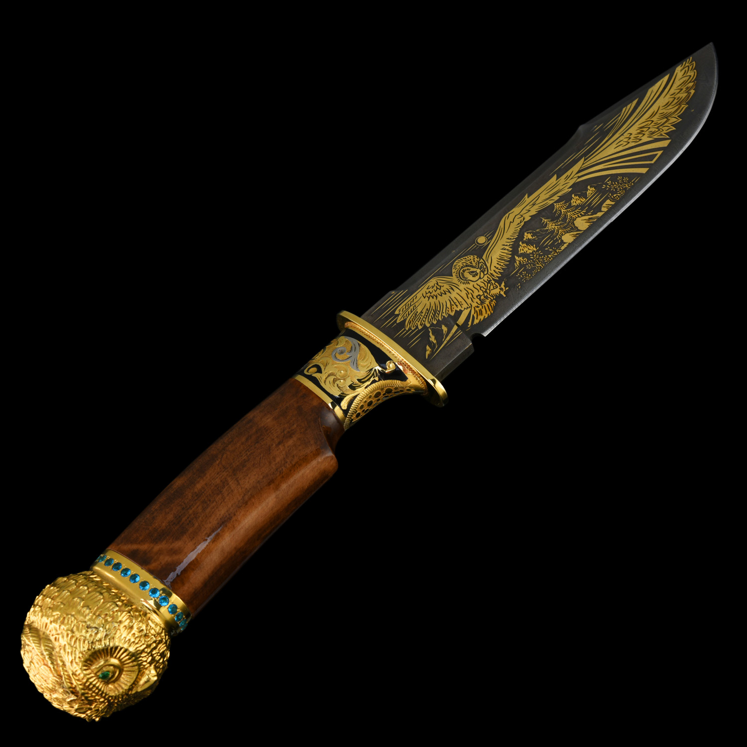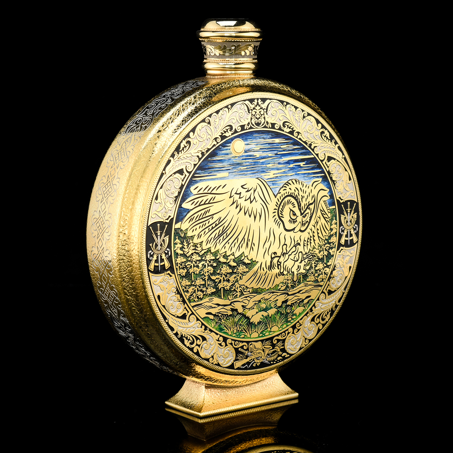 Питейный набор с флягой и ножом "Сова". Златоуст.Материалы: латунь, никель, золото 999,9*, эмаль, сталь, фианиты, дерево.