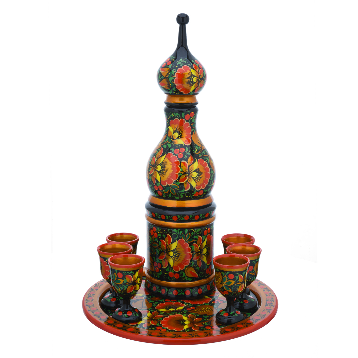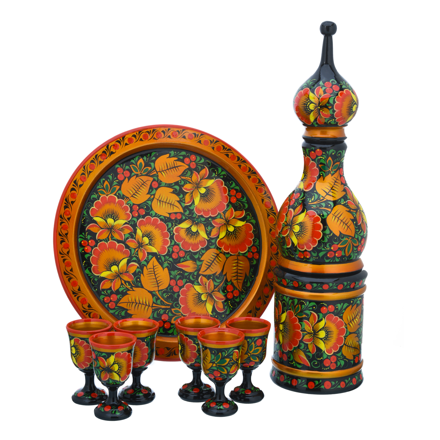 Русские подарки и сувениры → Посуда → Питейные наборы → Питейный водочный набор на 6 персон "Цветы". Хохлома