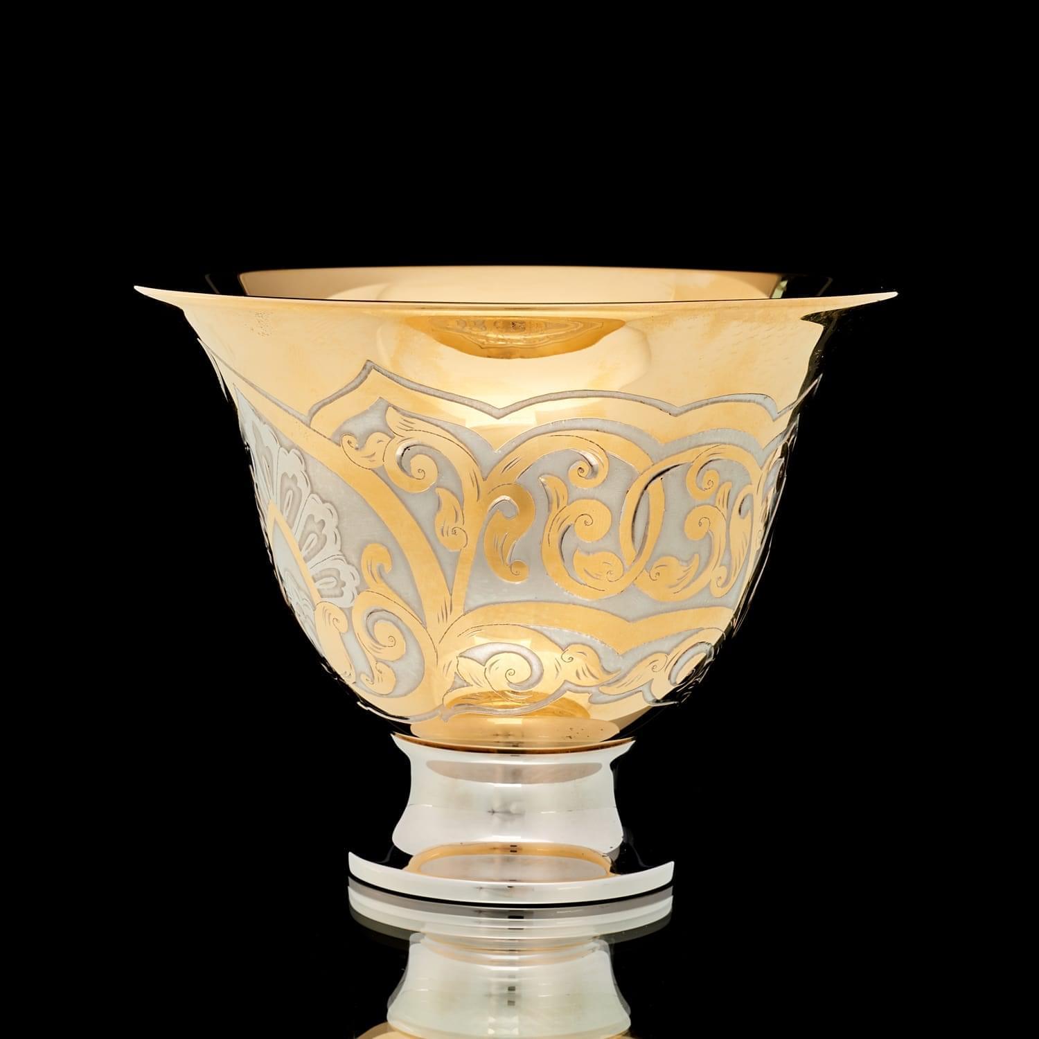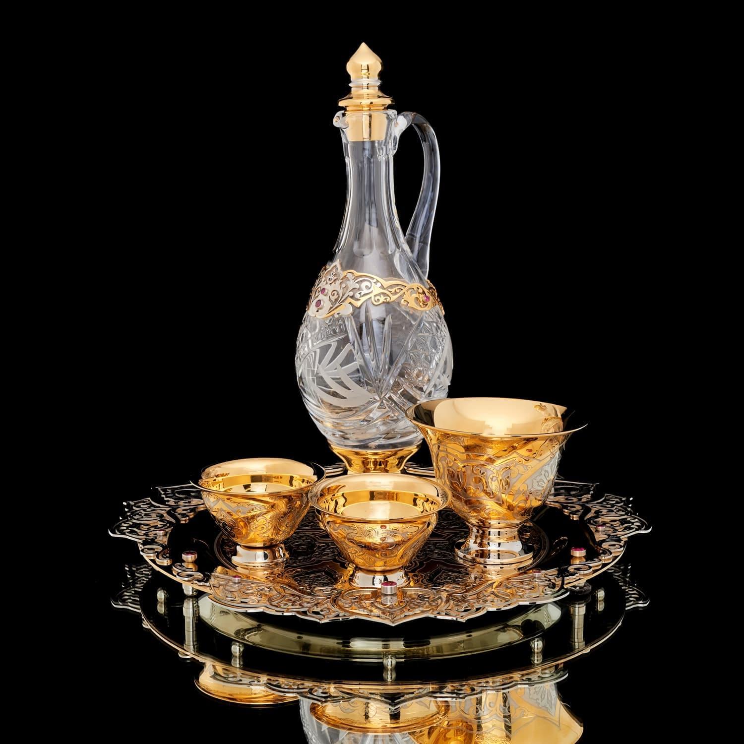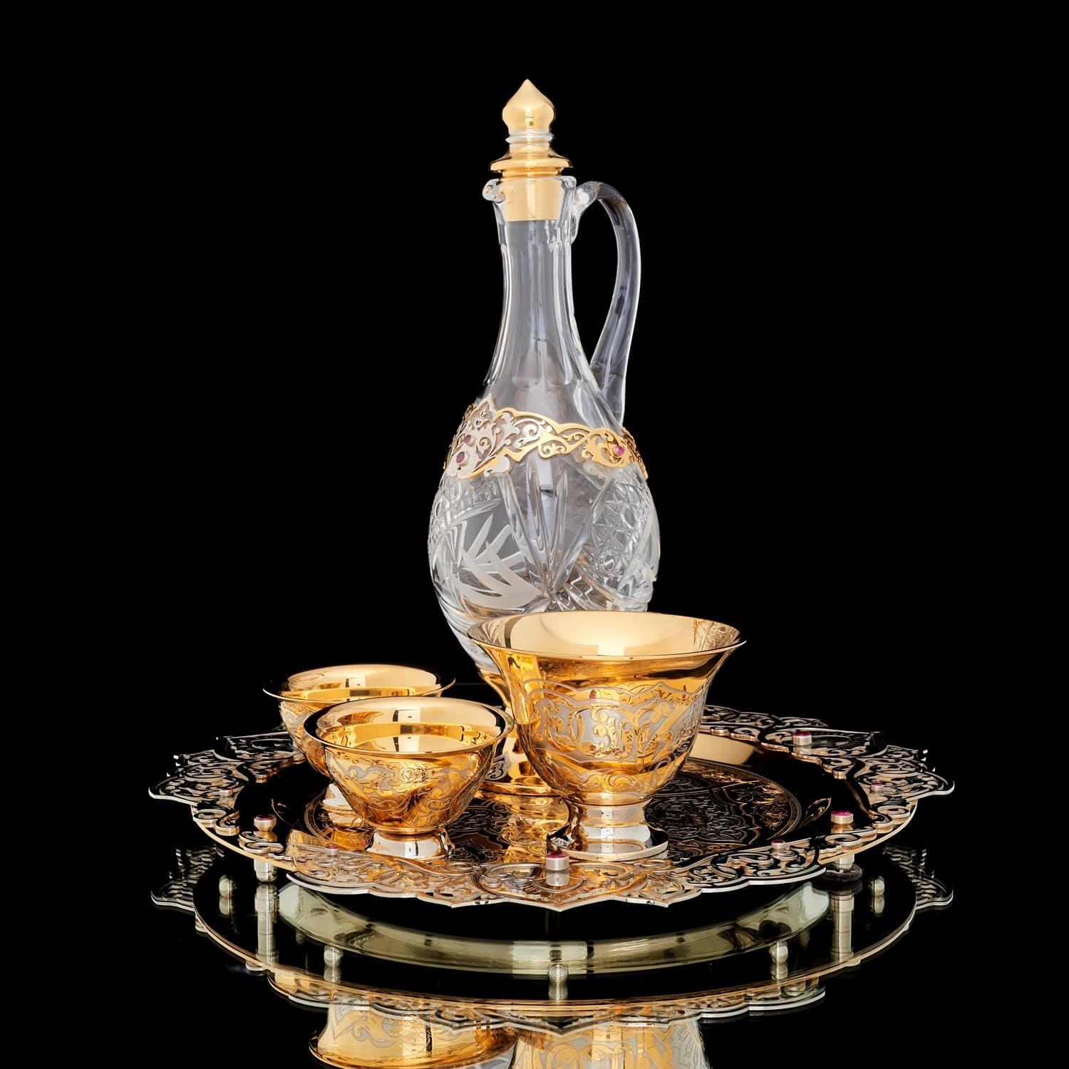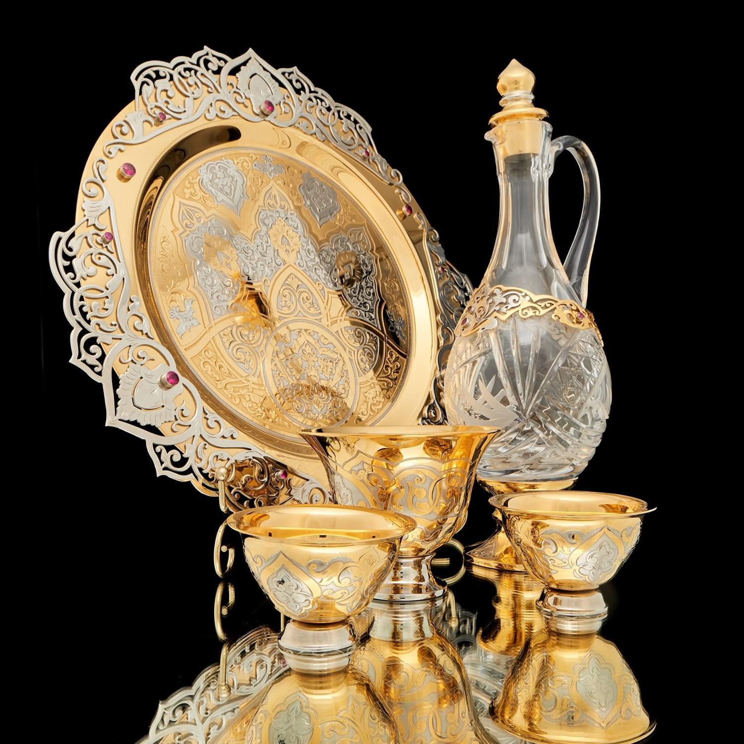 Этот набор с чашами и хрустальным  графином на подносе  с выгравированными на металлических корпусах них    композициями и орнаментами   изготовлен мастерами Златоуста - поставщиками посуды, холодного оружия и элементов декора ручной работы для главной резиденции президента России, Московского Кремля.