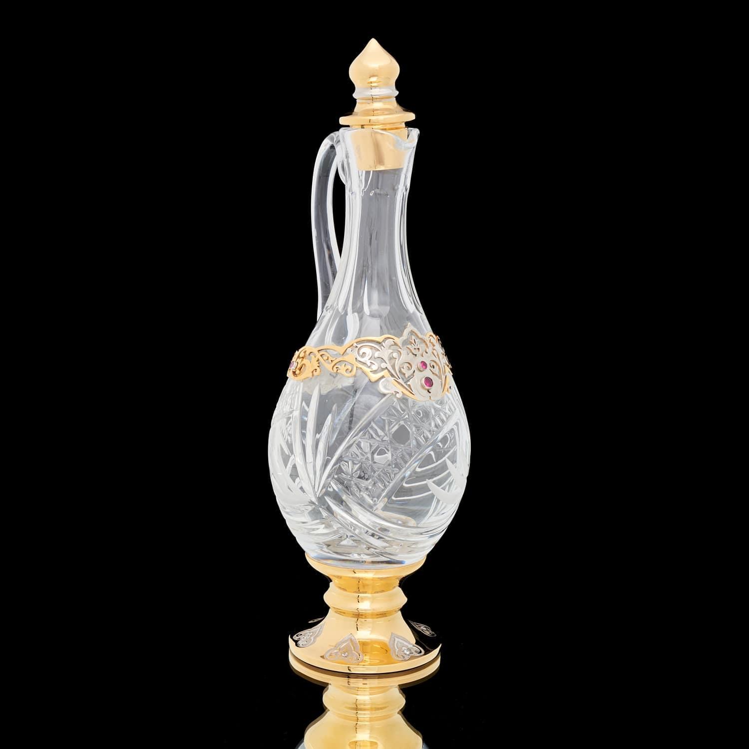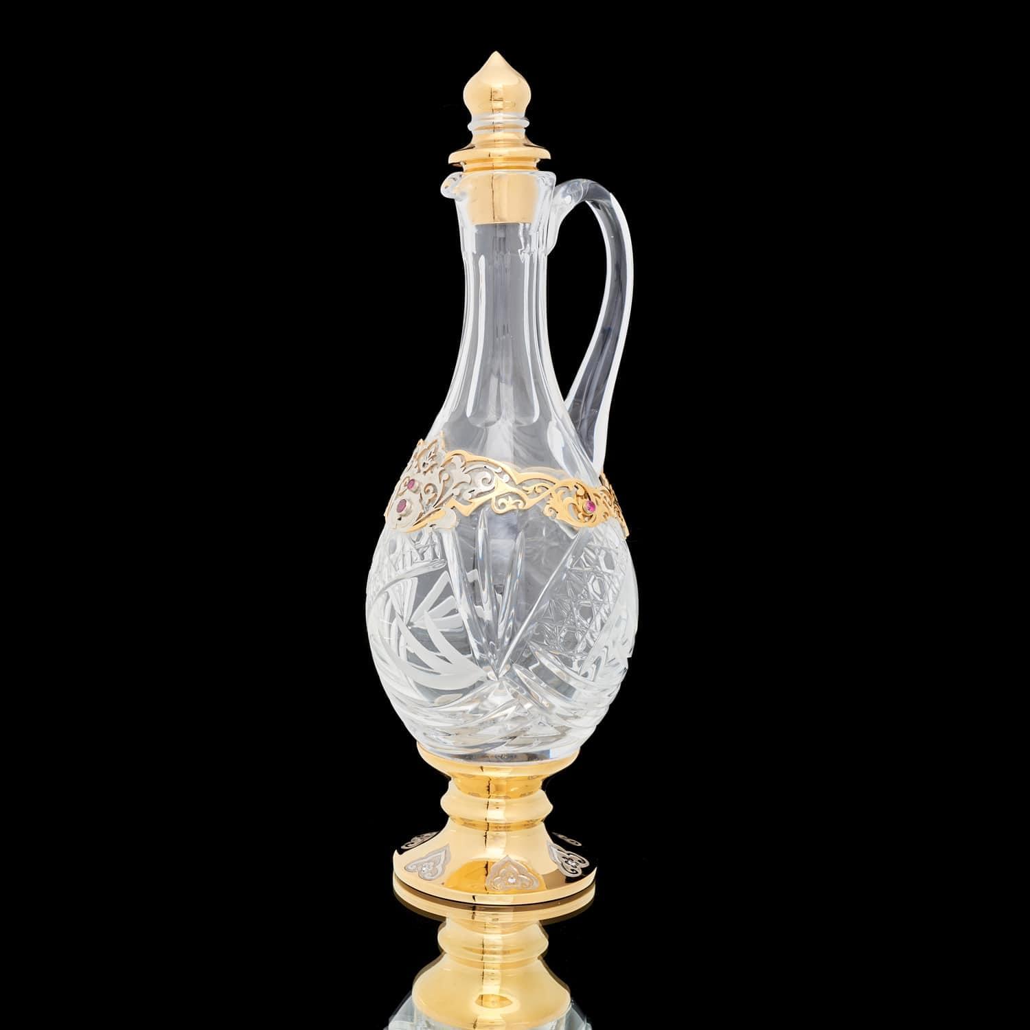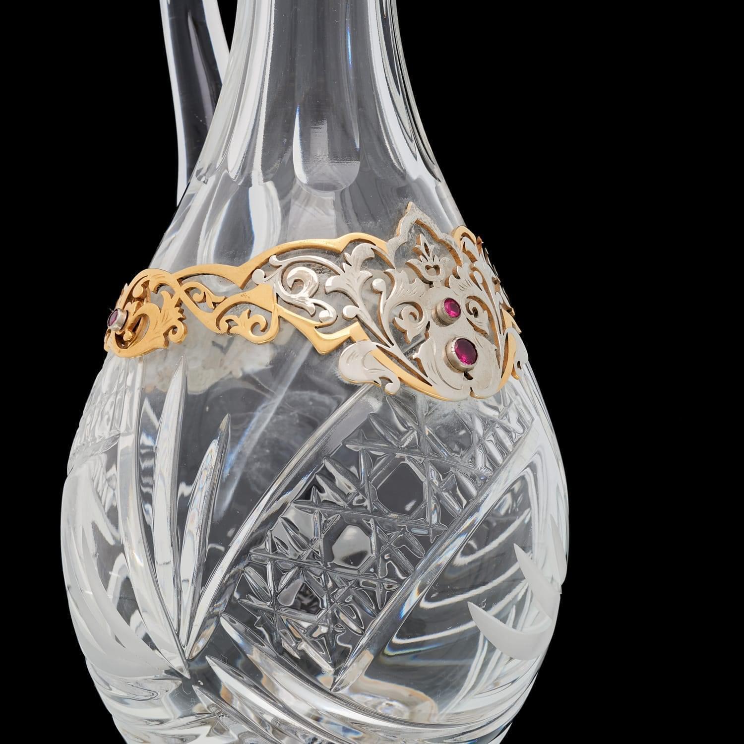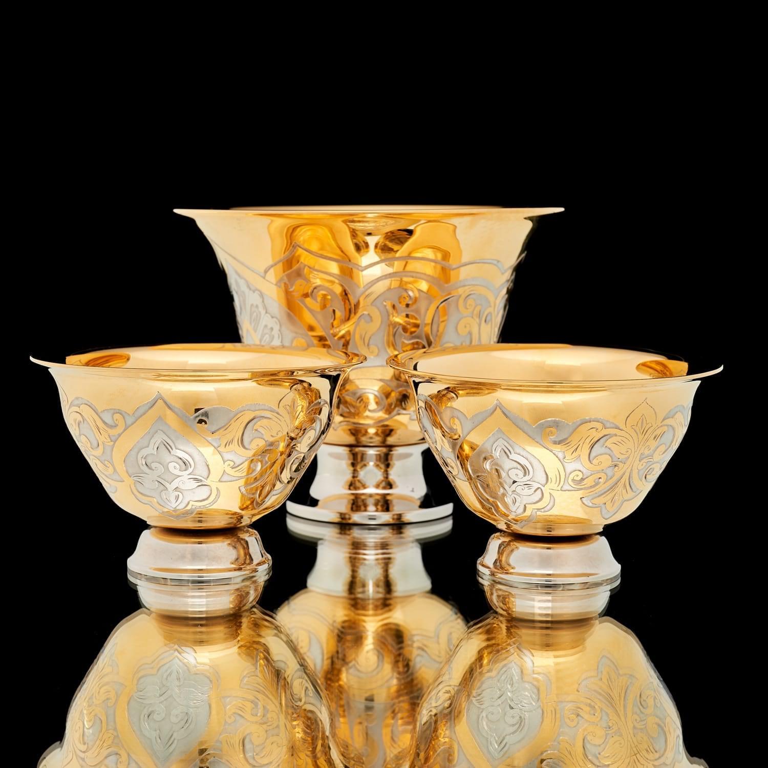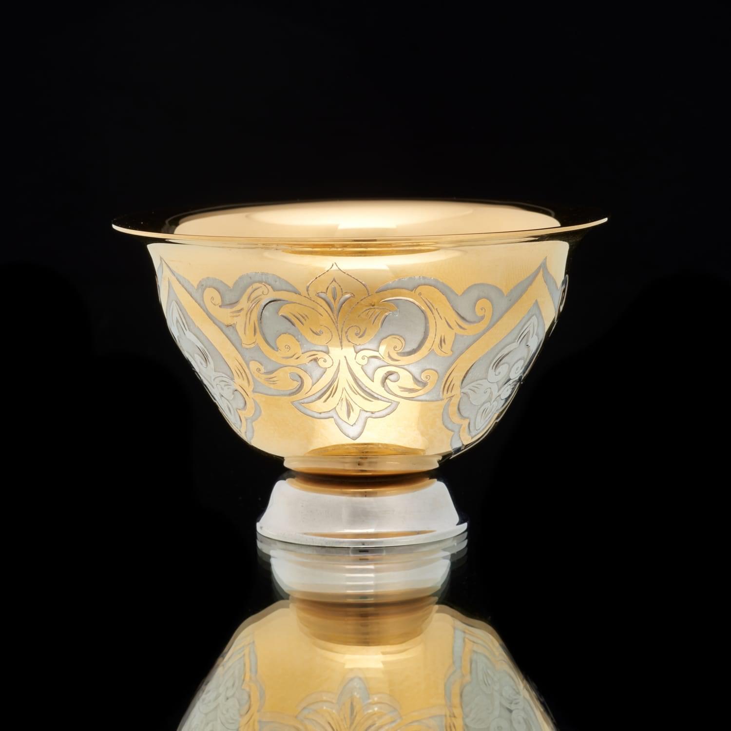 Этот набор с чашами и хрустальным  графином на подносе  с выгравированными на металлических корпусах них    композициями и орнаментами   изготовлен мастерами Златоуста - поставщиками посуды, холодного оружия и элементов декора ручной работы для главной резиденции президента России, Московского Кремля.