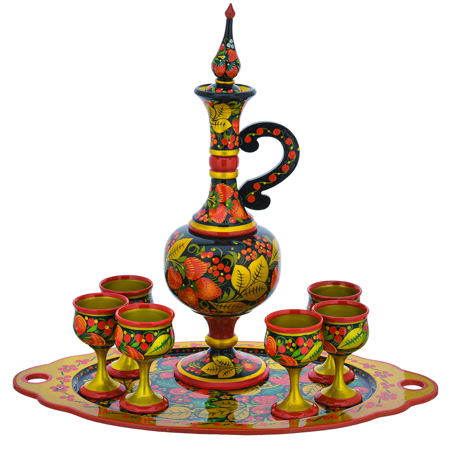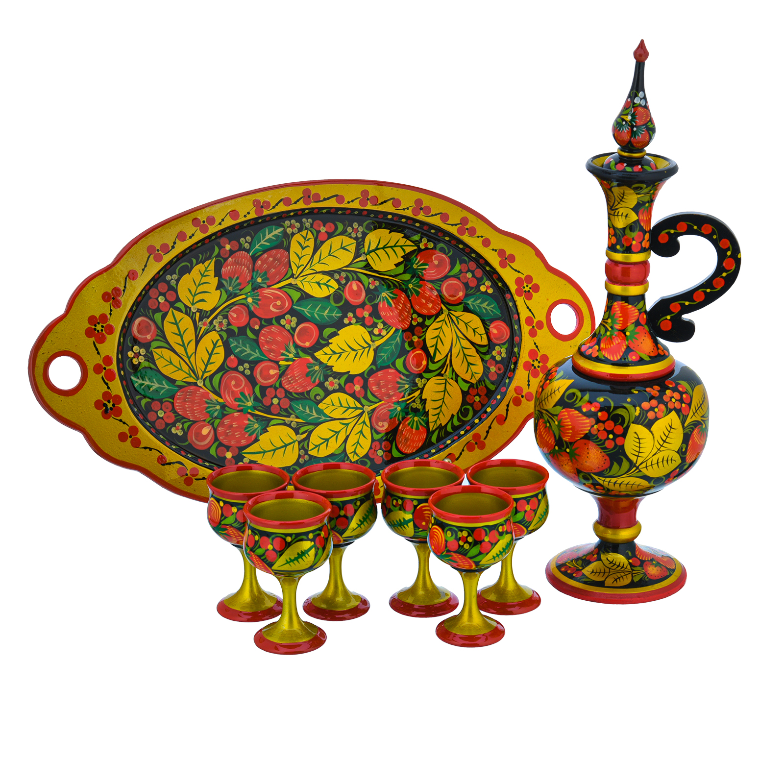 0034138 Хохлома НАБОР ВОДОЧНЫЙ на овальном подносе: штоф+6 рюмок ....